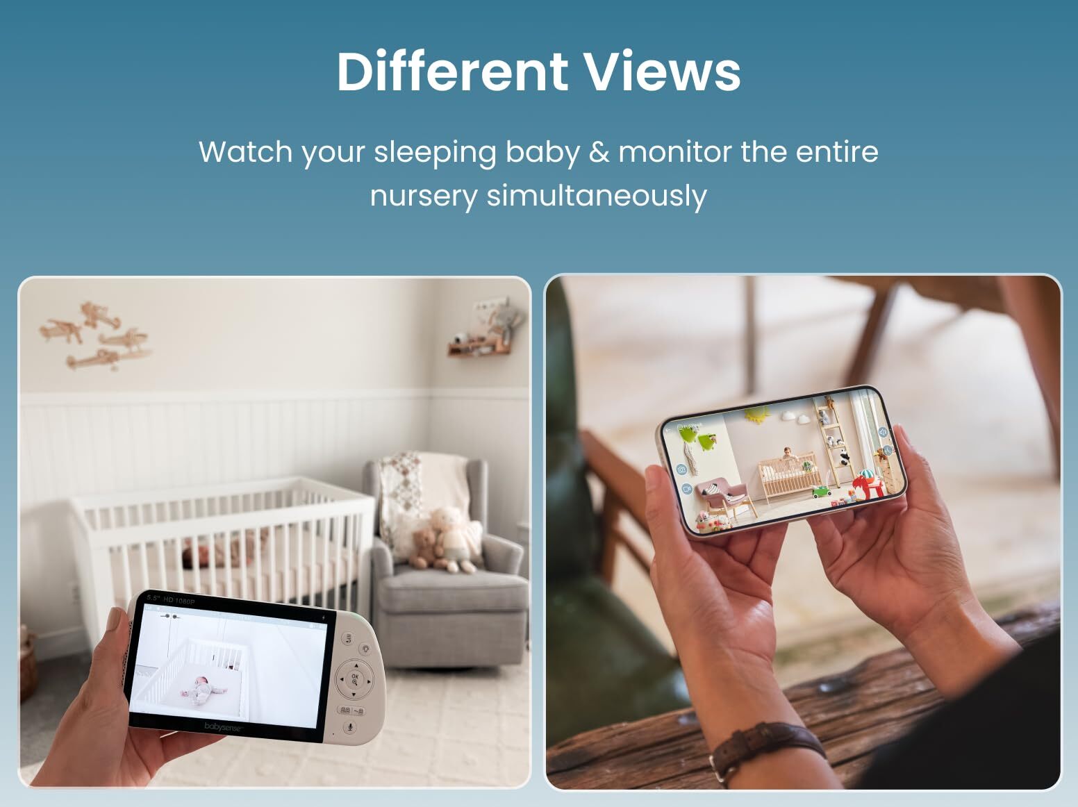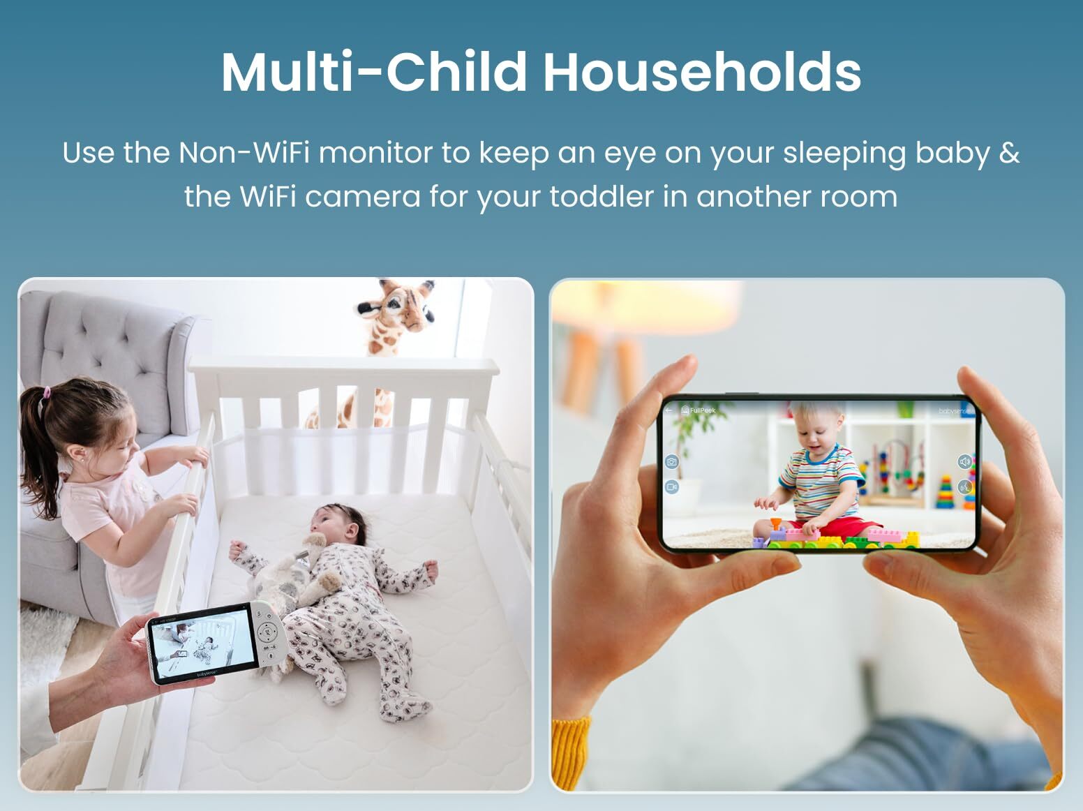 Having both a 3MP WiFi baby monitor and a separate home-use Non-WiFi baby monitor can provide additional benefits that using just one type of monitor cannot. Why 3MP/FULL HD Video Baby Monitor Bundle Stay connected to your baby whether you're at home or on the go. This Monitoring solution comes standard with 2 separate systems: a 3MP Super HD WiFi Camera (controlled via app - currently only available in the USA) for remote monitoring; and a separate local non-WiFi camera with its own dedicated 5.5" 1080p HD Display for at-home monitoring. This allows you to check on your kids, pets and other family members whether you're at work or in the kitchen or even if your family members are living outside of your home and want to stay conncted with you or your baby. The monitors are straightforward and user-friendly. - The at-home Non-WiFi baby monitor is plug-and-play and has an easy and intuitive menu, with simple processes to activate the various high-end features of your local camera. - The remote WiFi baby camera is operated via its dedicated App, allowing remote access from your iOS or Android smartphone or tablet. In conclusion, while either a WiFi or Non-WiFi baby monitor can be a helpful tool for parents, having both can provide added convenience, flexibility, backup, coverage, and features that can ensure your baby's safety and your peace of mind. Increased Coverage & Range: The non-WiFi monitor won't connect to the App and the WiFi Cam won't connect to the Parent Unit. Use your Non-WiFi baby monitor in typical in-house environments while using your smartphone to catch up on your social life or work. Use your WiFi baby monitor for outdoor places (yard or pool area) or locations with a weak direct signal. This gives you a more reliable and versatile system to monitor your baby. The App is Free and is currently only available in the USA Multi-Child Households: If you have multiple children in your household, having both types of monitors can be especially useful. You can use a point-to-point monitor in one room for an infant, while using a WiFi monitor to keep an eye on an older child in another room. Different Views: Having both a WiFi and a local Non-WiFi baby monitor can provide increased coverage of your baby's environment, allowing you to monitor different areas of the nursery simultaneously. You can set up the local monitor to watch over your sleeping baby, while the WiFi monitor can provide a wider view of the entire room. You can even check in on the nanny while she is checking on the baby. Diverse Features: Each type of monitor has unique features that the other does not offer. WiFi 3MP Camera features motion and sound detection, remote monitoring, capturing & recording function and multi-user experience, while at-home monitoring solution features lullabies & white noise sounds, built-in adjustable night lights and sound activation mode. Both types of monitors complement each other and provide access to a wider range of features and functionalities. At-Night Usage: Non-WiFi monitor features an adjustable Sound Activation mode, which is particularly useful at night, as it can help you get uninterrupted sleep until the baby needs attention. Keep the dedicated 5.5” Full-HD Display on your nightstand, where you can quickly check on your baby without needing to access your smartphone or keeping it on during the night.