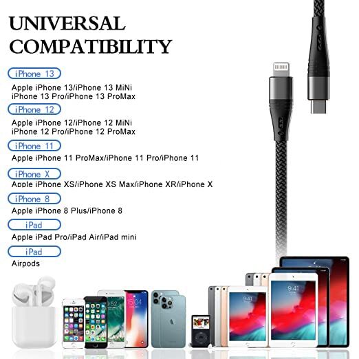 2-Pack Apple MFI Certified USB C to Lightning Cable 3 ft USB-C Nylon Braided iPhone Charger Cord t Type C Fast Charging Compatible with Apple iPhone 14/13/12/11/ Pro/Pro Max/Mini/Air Pods Pro.(Grey) MFI Certified: The USB C to Lightning cable has completed the MFI certification requirements. MFI certification means it will be perfectly compatible with your new iPhone or iPad. No error message pops up. Safe to use even when fast charging and transferring data at top speeds . Fast Charging: With this USB C to lightning cable, it can charge your phone from zero to 50% only within 30 minutes. Its charging speed 2.5 times faster than ordinary lightning cables. And the data transfer speed reaches to 480Mbps. Universal Compatibility: iPhone 14/14Pro/14ProMax/13/13Pro/ 13ProMax /12 Mini/ 12/ 12 Pro/ 12 Pro Max/ 11 Pro/ 11 Pro Max/ iPhone XS/ XS Max/ iPhone X/ XR/ iPhone 8/ 8 Plus/ iPhone 7/ 7 Plus/iPhone 6th Generation/iPhone Pro 10.5/iPad Air 3/iPad Min 4/5/Air Pods Pro. Nylon Braid Enhances Durability: USB C to iPhone Cable is designed with high quality nylon braid, upgraded 3D aluminum connector, exclusive laser welding technology, passed 40000 times bend test, 15000 times plug test, Premium TPE ensure extreme temperatures (-50℃) without cracking. These lightning cables are designed for the harshest routines. Lifespan 10x longer than other 8 pin iOS Charging Cords. What You Get: 3 Pack 6 ft iPhone 14 USB C to Lightning Cable and 24/7 Customer Service. If you have any questions about the USB C iPhone data cable, please contact us, we will reply you within 24 hours and provide you with a satisfactory solution.