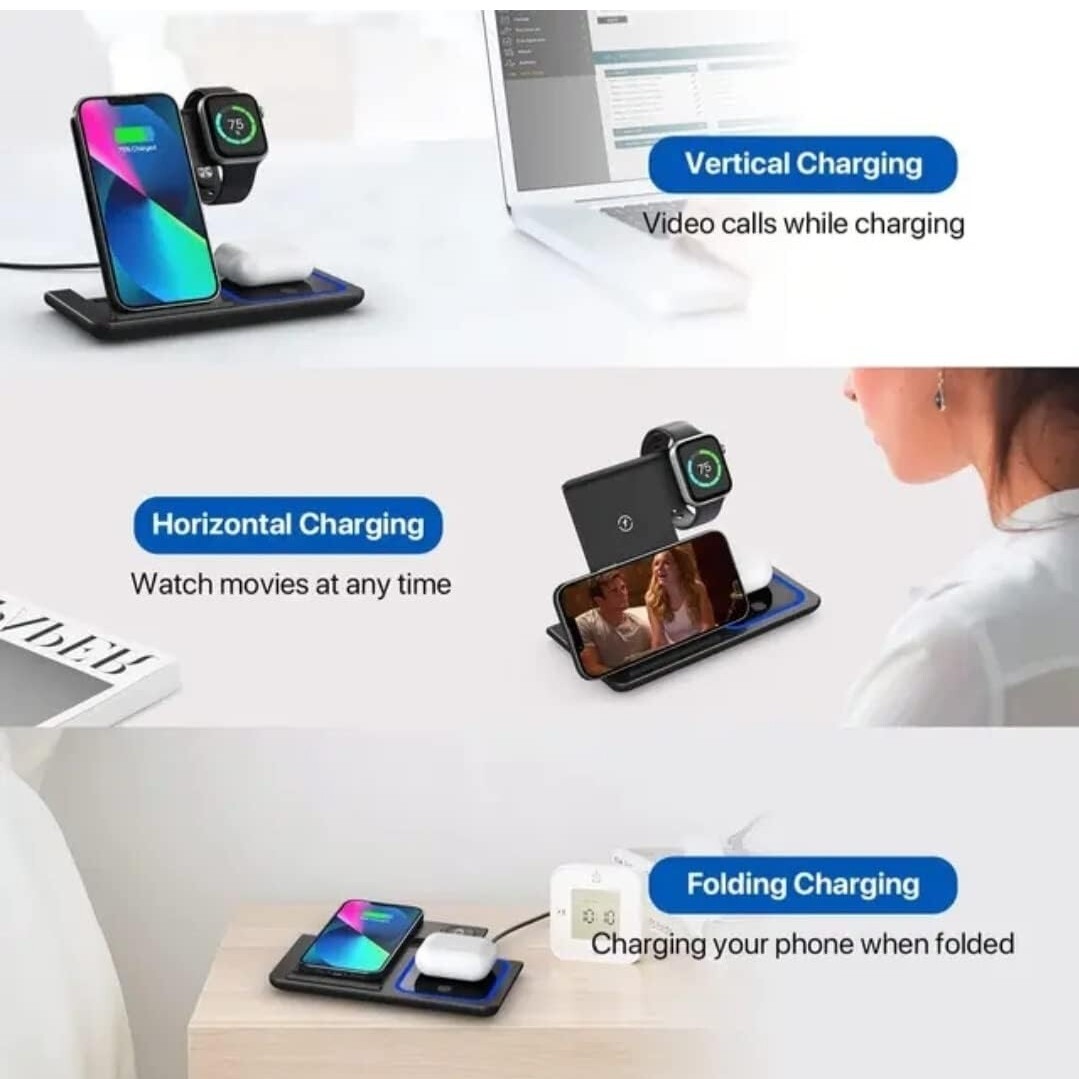This wireless charger is perfect for anyone who needs to charge multiple devices at once. It can charge up to three devices simultaneously, including Apple and Samsung phones, all while using wireless charging technology. The charger comes with a variety of included components like a mount, charging cable, and data sync cable. With a sleek black design and compact size, this charging dock is perfect for use on desktops, dashboards, and desks. The charger has a wireless charging standard of magnetic and uses USB Type C connectivity. It also has a special feature of a charging indicator, which lets you know when your devices are fully charged. The product dimensions are 6.5 x 5.6 x 0.63 inches and it weighs 10.9 ounces. This 3 in 1 Wireless Charger is a must-have for anyone who needs a fast and efficient way to charge all their electronic devices.