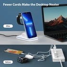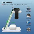 Input: 9V/2A, 9V/2.7A or 12V/2A (must use 9V/2.7A or 12V/2A when charging 3 devices including 15W charging phone) Phone Output: 15W/10W/7.5W/5W Watch Output: 2.5W(Only compatible with Apple iWatch 2/3/4/5/6/SE/7/8/9/Ultra) Earphone Output: 3.0W(Compatible with AirPods 3/2/Pro/Pro 2 and more TWS Earphones with wireless charging case.) Input Interface: Type-C port Transmission Distance (For Phone): ≤8mm Product Size: 120.7 X 75 X129.6mm ➤Package content: 1x 3 in 1 Wireless Charging Station 1x Type-C Quick Charging Cable 1x QC 3.0 / 18W Adapter 1x User Manual Multifunctional 3-in-1 Wireless Charging Stand: The wireless charger with universal compatibility, specially designed for Apple users, supporting fast charging for Phones, Watches, and Earbuds simultaneously, Compatible With Apple iPhone 15/14/13/12/Pro/Plus/Pro Max/SE/XR/X/XS/XS Max/11 Pro Max/11 Pro/11/8/8Plus and other Phones with wireless charging function. Only Compatible for Apple Watch 9/Ultra/8/7/6/5/4/3/2/SE【NOT for Samsung Watch】and Compatible for AirPods Pro/Pro 2/3/2[version: with wireless charging case]. User-Friendly Design: 3 in 1 wireless charging dock can charge directly through the protective case less than 3 mm thick (needn't take off your phone case repeatedly). 【NOT compatible with OtterBox Series Case】 Dual coil design allows you to charge the phone vertically and horizontally, providing you with a comfortable viewing angle to watch videos or FaceTime while charging. ▶NOTE: Please upgrade your watch software system to the latest version to get a better charging experience. Compact Size & Sleek Design: This wireless charging stand cleverly utilizes the space behind the stand and the top of the stand to put the other two devices, it is compact and takes minimal space. All charging area is wirelessly charged, Charging three different devices only with one cable, making your desk or nightstand clean and tidy, and it is perfect for business trips or travel, one charger meets all your needs. Smart Led Indicator Light: The intelligent light ring shows the status of the charger in different colors, which can visually display the charging status of the phone (green light in standby mode, blue light in phone charging mode, green and blue flash means the foreign body is detected or the phone is misaligned ). When you think the light will affect you, you can turn it off through the touch-sensitive key beside the charging area of Airpods. Intellengent Safe Charging: The wireless charging station with built-in highly efficient components and an intelligent chip, which provides various intelligent protection, such as temperature control and voltage protection, and foreign object detection. Protect your device from overcharging and ensure your device is safe and fast charging.