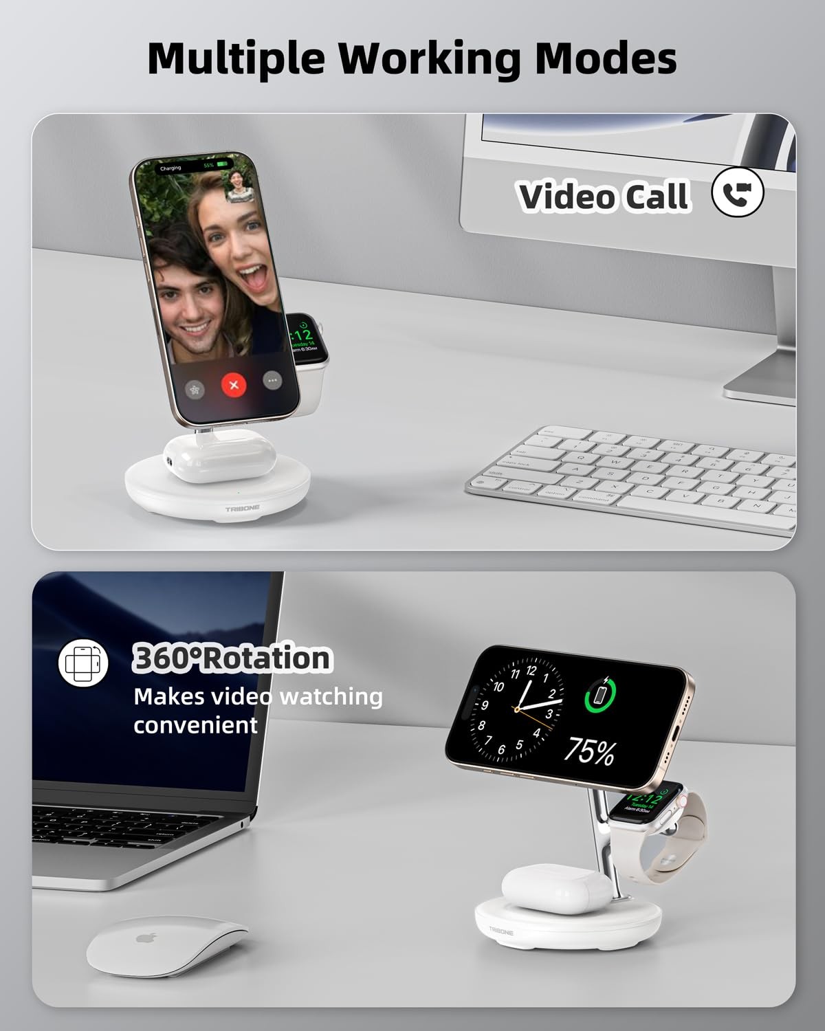 3 in 1 Magnetic Wireless Charger Stand for Apple Devices, Fast Charging Station for iPhone 16/15/14/13/12 Series, Apple Watch, Airpods 3 Devices at Once: Charge your iPhone, AirPods, and Apple Watch simultaneously with this convenient 3-in-1 magnetic wireless charger. Say goodbye to messy cables and enjoy a clutter-free charging experience. Perfect for nightstands, desks, or any small surface! Built to Last: Made from high-quality metal and plastic materials, this wireless charger features a non-slip silicone base for enhanced stability. No more worrying about devices slipping or moving during charging. Advanced Safety Features: Includes overcurrent, overvoltage, and temperature protection to ensure safe and secure charging. FCC certified and equipped with intelligent protection technology, keeping your devices safe from overcharging or damage. Apple Fast Charging: Supports up to 15W fast charging for iPhones, and delivers a 33% faster charging speed for Apple Watch Series 7 and newer models, helping you stay powered up quicker than ever. Ideal Gift Choice: Not only is this wireless charger a practical addition to your home or office, but it also makes an excellent gift for family and friends. Whether it’s for a birthday, holiday, or just because, it’s a thoughtful present that everyone will love!