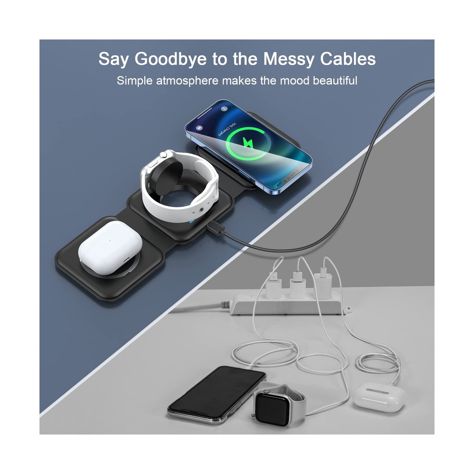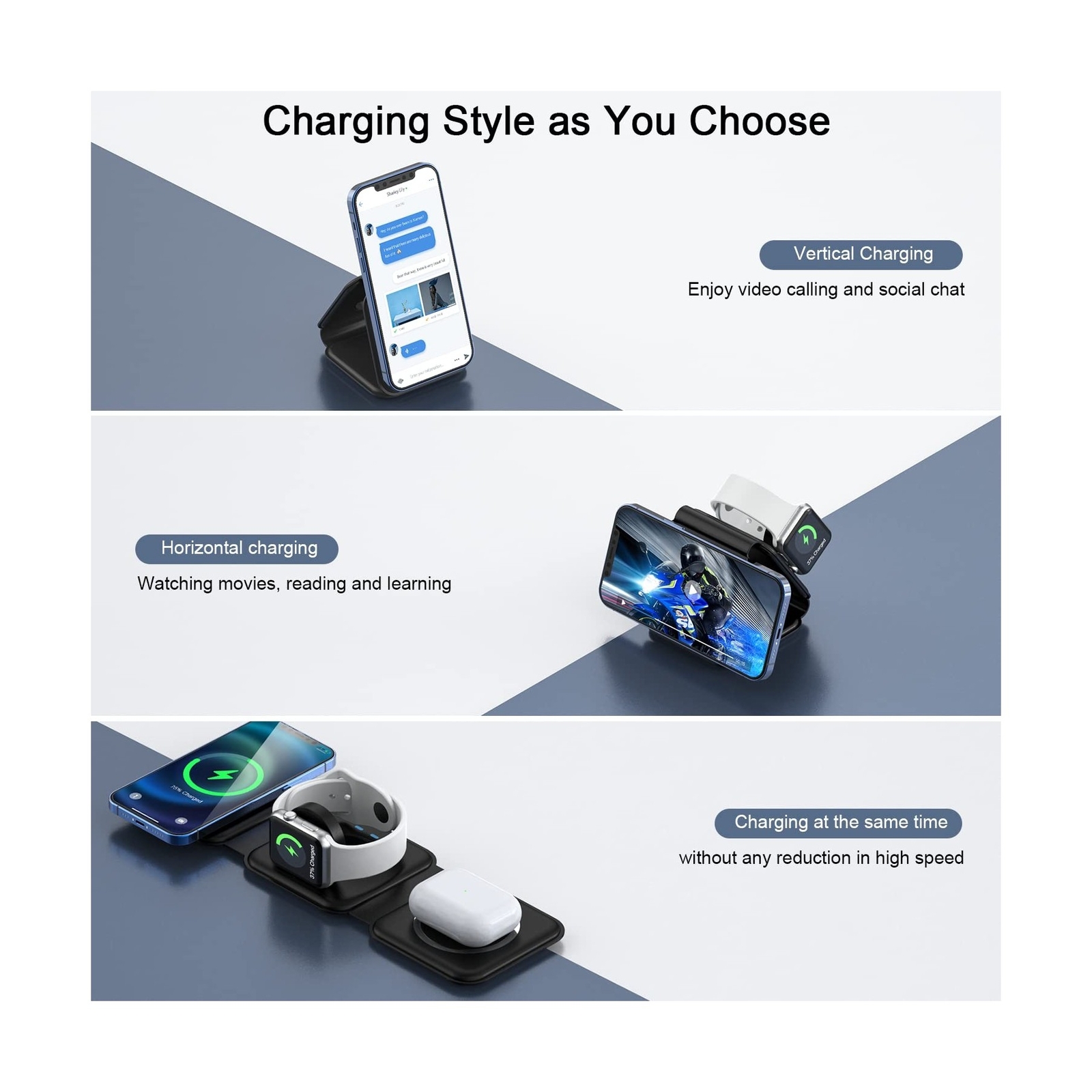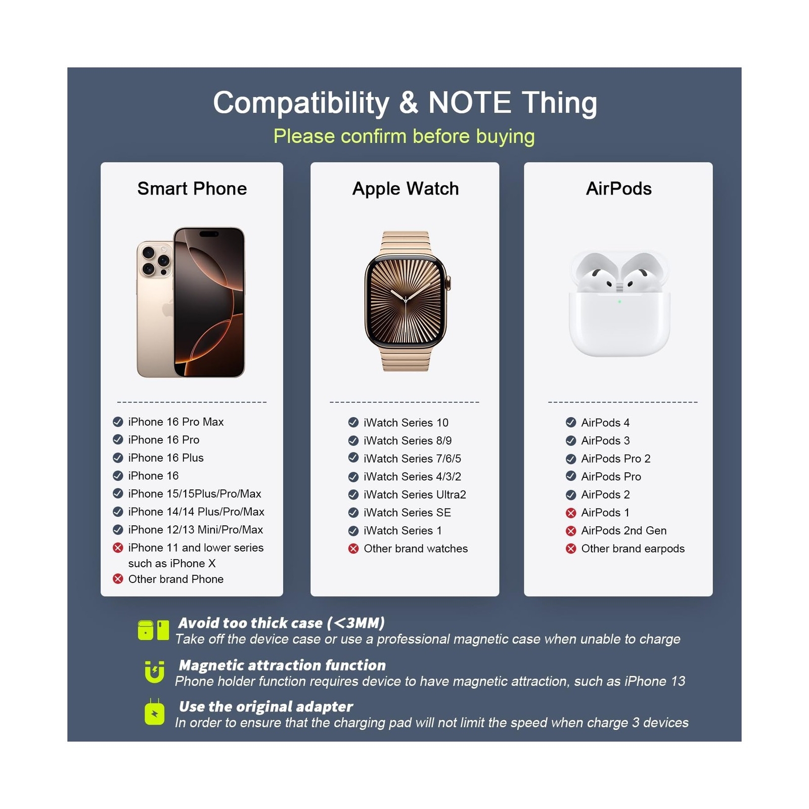 Wireless Charger 3 in 1,RTOPS Magnetic Travel Wireless Charging Station Multiple Devices,GaN 3 in 1 Charging Station,Compatible for iPhone16/15/14/13/Pro/Max,iWatch,AirPods4/3/2/Pro(Adapter Includes) - Buy Now with Fast Shipping! Wireless Charger 3 in 1,RTOPS Magnetic Travel Wireless Charging Station Multiple Devices,GaN 3 in 1 Charging Station,Compatible for iPhone16/15/14/13/Pro/Max,iWatch,AirPods4/3/2/Pro(Adapter Includes) Product Details Brand: RTOPS Connector Type: USB Type C Compatible Devices: IPhone 16/ iPhone 16 Pro/iPhone 16 Pro Max/ iPhone 16 Plus/IPhone 15/ iPhone 15 Pro/iPhone 15 Pro Max/ iPhone 15 Plus/IPhone 14/ iPhone 14 Pro/iPhone 14 Pro Max/ iPhone 14 Plus/ iPhone 13 mini/ iPhone 13/ iPhone 13 Pro/ iPhone 13 Pro Max/ iPhone 12 mini/ iPhone 12/ iPhone 12 Pro/ iPhone 12 Pro Max; iWatch UItra2/Ultra/10/9/8/7/6/ SE/ SE 2/ 5/ 4/ 3/ 2; AirPods 2/ AirPods Pro/ AirPods Pro 2/ AirPods 3/AirPods 4 See more Compatible Phone Models: iPhone 16, iPhone 16 Plus, iPhone 16 Pro, iPhone 16 Pro Max, iPhone 15, iPhone 15 Plus, iPhone 15 Pro, iPhone 15 Pro Max, Phone 14, iPhone 14 Plus, iPhone 14 Pro, iPhone 14 Pro Max, iPhone 13 mini, iPhone 13, iPhone 13 Pro, iPhone 13 Pro Max, iPhone 12 mini, iPhone 12, iPhone 12 Pro, iPhone 12 Pro Max, AirPods 2/3/4/Pro, IWatch 2/3/4/5/6/SE/7/8/9/10(Compatible with MagSafe cases) Note: Do not compatible for Samsung Galaxy, Android model See more Included Components: 24-hour Customer Service, 1 x User Manual, 1 x Charging Cable, 1 x Power Adapter, 1 x Wireless Charger See more Special Feature: Wireless Charger 3 in 1 , Fast Charging, Strong Magnetic, Short Circuit Protection, LED Charging Indicator, Travel Foldable Design See more Color: black Input Voltage: 9 Volts Amperage: 2 Amps Total USB Ports: 1 Product Dimensions: 3.35 x 2.95 x 0.78 inches Item Weight: 9.9 ounces Item model number: W312 Connectivity technologies: USB Special features: Wireless Charger 3 in 1 , Fast Charging, Strong Magnetic, Short Circuit Protection, LED Charging Indicator, Travel Foldable Design Other display features: Wireless Color: black Whats in the box: 24-hour Customer Service, 1 x User Manual, 1 x Charging Cable, 1 x Power Adapter, 1 x Wireless Charger Manufacturer: DongGuanShi WeizhiChuang Technology Co., Ltd Country of Origin: China Date First Available: November 30, 2021 Key Features ✅ Re-evolution of Wireless Charger: This specially designed wireless charger pad combines the advantages of all other wireless chargers and has developed into an excellent work - 1. Can chat vertically 2. Watch drama horizontally 3. It even has a magnetic attraction function 4. At most charge 3 devices at the same time 5. Charge adapter and cable 6. Apple-style minimalist design. A phone wireless charger of RTOPS meets all requirements of you and is worth taking home. ✅ Extreme Speed 3 in 1 Wireless Charger: You can charge your apple products simultaneously through this 3-in-1 wireless charging station. It charges your iPhone, Apple Watch and AirPods at the same time. The wireless charging stand outputs up to 7.5W for Phones, 5W for AirPods and 3W for Apple Watch. Powered by the included 18W adapter, matched with wireless iPhone charger with built-in upgrade coil your charging speed can be increased by 35%. ✅ Pay Attention to Family Health: Many other phone wireless charging station do not take anti-electromagnetic measures, and internal radiation will spread, causing harm to the human body. This folding charger uses a professional magnetic isolation sheet inside, no radiation leakage, the elderly and children can use it with no worry. This wireless charging station for apple products strive to protect the safety of you and your family. ✅ Having a Long Working Life for You: In addition to protecting your health, RTOPS will also protect itself from harm because of the charging management IC, thus having a long working life. First, when the temperature exceeds 104F, charging will be interrupted to avoid battery damage and fire. Second, the surface is coated with a layer of skin-like silicone, it's 100% anti-static and can endure accidental collision or scratches. It certainly has the ability to detect foreign objects etc. ✅ Make the Most of Your Fragmented Time: After meet rtops wireless phone charger, no matter you go home from get off work or go out to have fun, the battery of your mobile phone is always full. Because it makes full use of your fragmented time to charge the device. You will have a whole new experience. If have any questions, don't hesitate to contact us and we guarantee you a satisfied solution. ✅ [NOTE: *Please use the matching adapter and cable, otherwise it will affect normal charging. *Please do not wear too thick or heavy non-magnetic suction protective case, otherwise it will affect normal charging *Note that in order to protect the components, wireless charger internal heat dissipation equipment to prevent high power caused by component damage, so a slight heat do not worry!]. Product Description