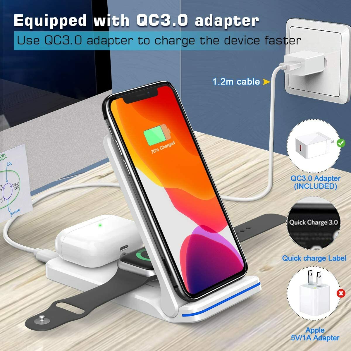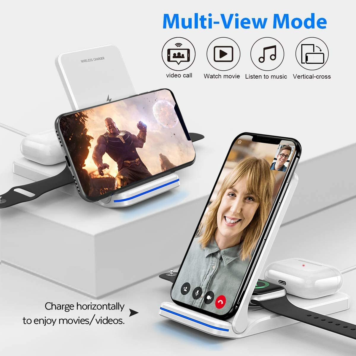 Wireless Charger, 3 in 1 Wireless Charging Station for iWatch, AirPods Pro/2, Qi Fast Wireless Charging Stand for iPhone 12/11 Series/XS MAX/XS/XR/X/8/8 Plus and All Qi-Enabled Phones (White) Description 【Fast charging】Features Qi wireless technology and 2 charging Coils. A high-efficiency chipset provides 10W high-speed charging for iPhone 12 Series /Samsung Galaxy. iPhones 8 -11 get a boosted 7.5W charge. The apple watch can be filled in just 2 -3 hours. 【Neat Desktop】Multi-device charging. 3 in 1 wireless charging supports three devices - iPhone, AirPods and Apple Watch - charging simultaneously to save you from messing with a bunch of cables every night and reduce wear and tear on your USB or ports. Note: The rubber/plastic/TPU case thickness less than 5mm does not affect the charging. But magnetic and metal attachments or cards can prevent charging. 【Adjustable support angle】With magnetic support, the support angle can be adjusted according to your needs and can be folded. You can charge in landscape orientation watching videos as needed, or in portrait mode for messaging and facial recognition. Small size, you can easily put it in a bag and carry it with you. 【Multi-protection】Qi fast charging wireless charger design. With over-current protection, over-voltage protection and over-temperature protection as well as foreign object detection function. Reasonable internal circuit design can prevent overcharge damage to the equipment battery and ensure safe charging of the device.(Note: remove the magnetic or metal accessories from the phone case when charging.) 【Widely compatible】 The wireless charger for iPhone 12/11 series / Xs Max / Xs / Xr / X / 8/8 Plus, Samsung S20 / S20 + / S20 Ultra / S10 / S10 + / S10e / S9 / S9 + / S8 / S8 + / S7 / S7e, Note10 / 10 + / 9/9 + / 8/8 + and All phones that support QI. Suitable for Apple Watch 6/5/4/3/2/1/SE, AirPods 2 / Pro (ORIGINAL Apple Watch Wireless Charging Case is required). Color: White Shipping We only ship items to your eBay registered address for fast and accurate shipment. Thanks We will ship most orders within 1 business day some items ship same day if ordered early enough Delivery >All shipments are shipped via USPS First Class (2-6 business day) from United States. Return Policy All items qualify for returns within 30 days of receipt. Feedback 1.We strive for 5 star positive feedback. We try our best to offer the best service for our buyers. 2.Please message us via eBay before leaving negative feedback.Let's solve the problems together! 3.Please give us a chance to resolve any issues before posting a feedback. 4.Please contact us with any questions or concerns. Thank you for your watch. We look forward to serving you.