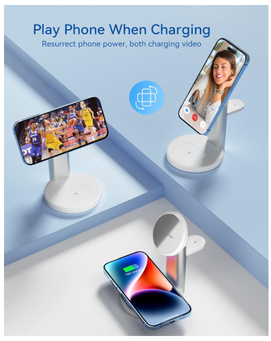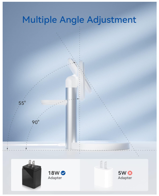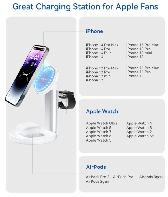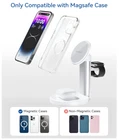About this item 【Strong Auto Magnetic】Magsafe charging station featuring an incredible 3800GS magnetic force that can hold on to 1kg of weight (around 11 phones) . Automatic calibration technology ensures that your device is always optimally positioned for efficient charging. It is highly recommended to charge without a case or use a case with Mag-Safe. 【Compatible with Multiple Devices】3 in 1 magsafe charger is compatible with iPhone 15 14 13 12 (Plus/ Pro/ Pro Max/ Mini), AirPods Pro/ Pro 2/ 3rd Gen/ 2nd Gen, Samsung, Google and other wireless charging earbuds. Apple Watch Ultra/ 9/ 8/ 7/ SE/ 6/ 5/ 4/ 3/ 2. The 18W Adapter automatically assigns charging power to ensure that all devices can be fully charged overnight. 【Adjustable Angle】Compared to traditional wireless chargers, this product can adjust the phone angle (an adjustable angle of 0-35°), particularly as the stands are usually the about the right height to use when you are making a Zoom call or FaceTime. 【Space-Saving Solution】3 in 1 apple charger is the perfect space-saving solution for your bedside table or office desk. With its compact design, you won't have to worry about messy cords cluttering up your space. 【More Friendly Design】The power LED lets you know the charging status, and the dim light will not affect your sleep. The Magsafe charging station features a brushed metal stand and a secure base with non-slip pads, ensuring the products stays in place when you grab your iPhone with one hand. 【Comprehensive Protection】Magsafe charging station has FCC certification and Qi protocol, which ensures charging efficiency and safety. Secondly, the product is equipped with protection functions such as over-voltage protection, over-current protection, short-circuit protection, and over-temperature protection. This means that no matter where you are, your phone will receive comprehensive protection. 【What You Get】 The package includes magsafe charging station, 3FT usb-c cable, 18W fast adapter, user manual, 1 years product warranty, 30-days free return. If you have any question on this products, please feel free to contact us, we will offer you a best solution within 24 hours. Your satisfaction is our first principle.