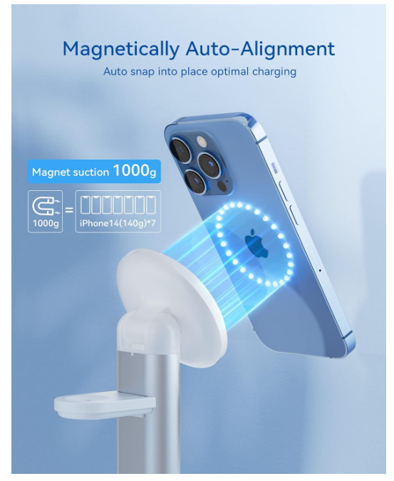 Absolutely love this charger! The magnet is super strong, holds my phone securely even when I tap the screen. Charges all my Apple gear fast and keeps everything neat on my nightstand. No more cable clutter!