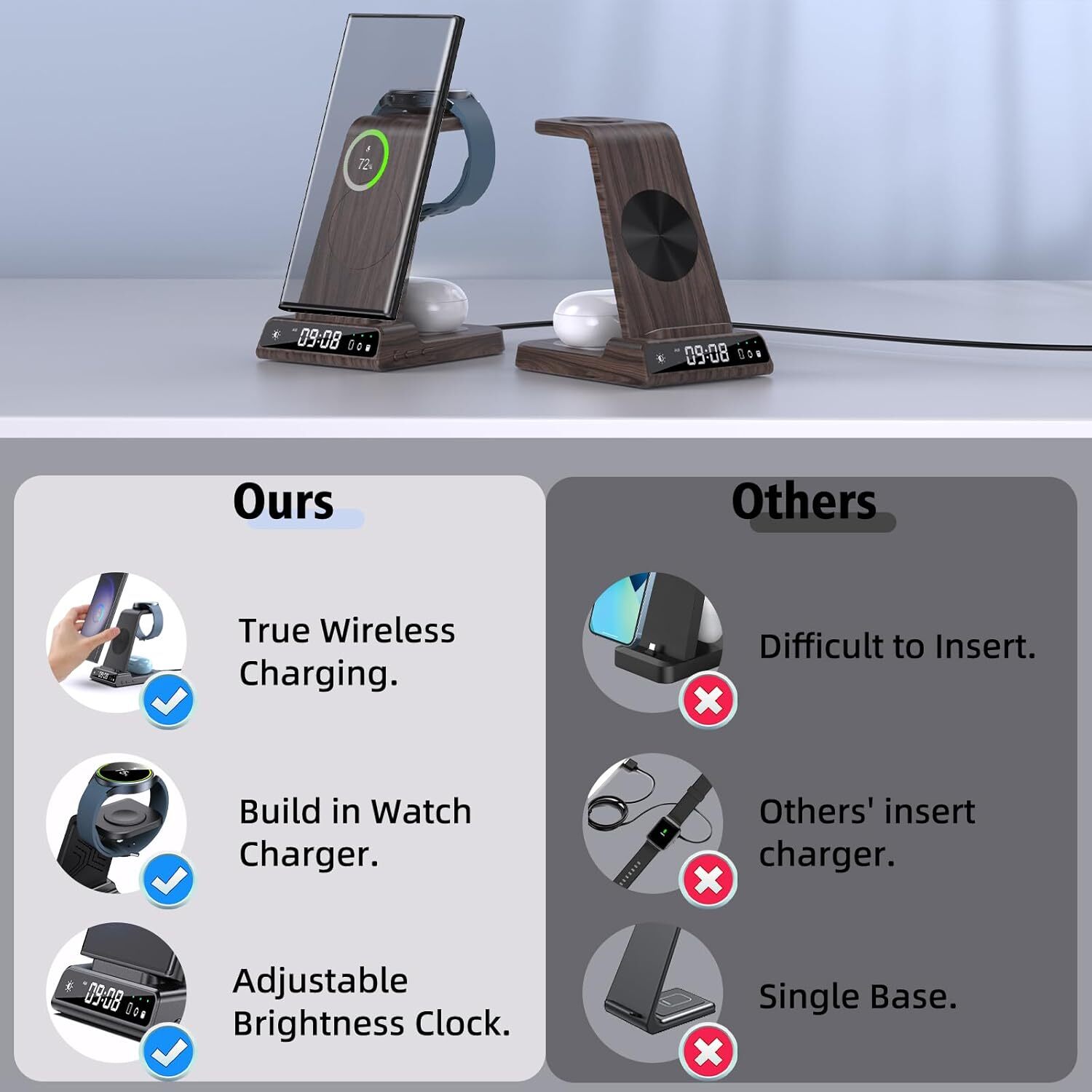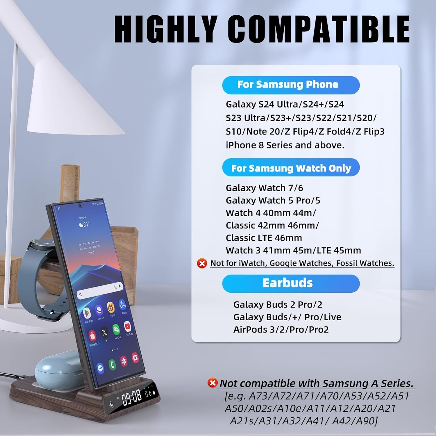 Store New Arrivals Add to Favorite View Feedback Contact Wireless Charger for Samsung Charging Station, 3 in 1 Android Phone Wireless Charger for Samsung Galaxy S24 Ultra/S23 Ultra/Z Flip 6/Fold 6/Buds, Charger for Galaxy Watch 7/6/5/4 (For Samsung Only) Description Item model number XF-C01 Package Dimensions 5.31 x 4.88 x 3.62 inches Color Woodgrain Compatible Devices for Samsung Galaxy S24 Ultra, iPhone 16 Pro Max... Connector Type USB Type C Item Weight 0.176 ounces Connectivity Technology USB Input Voltage 120 Volts Batteries 1 Lithium Polymer batteries required. (included) Compatible Phone Models Google Pixel Special Feature Wireless Charging Cable Length 44 Meters Included Components function(f) {var _np=(window.P._namespace("DetailPageProductOverviewTemplatesJava"));if(_np.guardFatal){_np.guardFatal(f)(_np);}else{f(_np);}}(function(P) { P.when('A').execute(function(A){ A.on('a:truncate:po-attribute-truncate-5:updated', function(data) { var isTruncated = !data.truncateInstance.getIfTextFits(); var seeMoreElement = document.getElementById('po-attribute-see-more-id-5'); if(seeMoreElement) { seeMoreElement.style.display = isTruncated ? '' : 'none'; } }) }); })); 1 x 3 in 1 Wireless Charging station, 1 x Type C Cable(1.5m length ), 1 x User Manual, 1 x QC3.0 adapter See more ✅【3 in 1 Wireless Charging Station】 --- Designed specifically for Samsung users. Whether you have S24 Ultra, earbud, or Galaxy watch 7/6/5 Pro, this charging station for samsung is perfect for charging them all in one spot, no more plug in and out troubles, no more fussing with cords and cables! Say hello to a simpler and more streamlined charging experience every time you use it. ✅【Thoughtful Design】 --- Space-saving "U-shaped" design with a 3-level dimming option. The LED charging indicator keeps you informed about your device's charging status at a glance. Plus, the built-in memory battery ensures your data is safe even during power outages. And when no USB is plugged in, the clock automatically turns off after 10 minutes to conserve energy. ✅【Case Friendly Charging Stand】 --- Our wireless charging stand is specifically engineered to charge your phone directly through protective cases up to 0.2 inch (5mm) thick. Say goodbye to the inconvenience of constantly removing and reattaching your phone case just to charge your device, simplifying your life in the way. ✅【Safe and Efficient Wireless Charging Station】 --- This wireless charger is made of fire-resistant ABS material, providing multiple protections for your devices. With features like object detection, temperature control, over-voltage protection, and the carefully designed heat dissipation holes on the back prevent overheating during charging. ✅【Wide Compatibility】 --- Compatible with both IOS and Android devices. Suitable for Samsung Galaxy Z Flip 6/5/4/Z Fold 6/5/4 /Z Fold 2/Z Fold 3/Z Flip/Z Flip 3/ for Samsung Galaxy S24 Ultra/S23 Ultra/S22/S22+/S22 Ultra/S21/S21+/S21 Ultra/S21/S20+/S20 Ultra/Note 20; iPhone 15 14 13 12 11 11 Pro Max/8 Plus; Google Pixel 6 Pro; Galaxy Buds 2 Pro/Buds/Buds+; AirP ods 3/2/Pro; Galaxy Watch 7/6/5/5 Pro/4 40mm 44mm/4 Classic/3/Active 2/1.Not compatible with Samsung A series. [e.g. Not for Samsung Galaxy A Series A73/A72/A71/A70/A53/A52/A51 A50/A02s/A10e/A11/A12/A20/A21/A21s/A31/A32/A41/ A42/A90] ✅【What's in the box】 --- You will get 1 x 3 in 1 wireless charger, 1 x QC 3.0 Adapter, 1 x Type-C Cable(1.5m / 59inch length ), 1 x User Manual. This cool wireless charger stand is not only suitable for your nightstand, but also for home, office, travel, and other occasions. Product Description The video showcases the product in use. The video guides you through product setup. The video compares multiple products. The video shows the product being unpacked. 1 Tidier 2 Safety 3 Cooling 4 Sleeping Friendly 5 Handling Easily 1 Package Included 2 Save Space 3 Perfect Gift 1 Learn More 2 iWatch magnets repel? 3 Can't charger my phone? 4 Red light blinking? 5 Device heating? Comparison Table Add to Cart Add to Cart Add to Cart Add to Cart Add to Cart Add to Cart Customer Reviews 4.2 out of 5 stars 5,625 4.1 out of 5 stars 93 4.0 out of 5 stars 227 4.2 out of 5 stars 5,625 4.2 out of 5 stars 5,625 4.2 out of 5 stars 5,625 Price $39.99 $ 39 . 99 $39.99 $ 39 . 99 $49.99 $ 49 . 99 $39.99 $ 39 . 99 $39.99 $ 39 . 99 $39.99 $ 39 . 99 Feature Brightness adjustable clock Foldable, ready for travel 4-in-1 Charger with Holder Wood grain color exudes taste Elegant and clean Cute and lovely QC 3.0 Adapter ✔ ✔ ✔ ✔ ✔ ✔ Adapted watches Samsung watch only Samsung watch only Samsung watch only Samsung watch only Samsung watch only Samsung watch only Supports wireless charging Phone/watch/earbuds Phone/watch/earbuds Phone/watch/earbuds Phone/watch/earbuds Phone/watch/earbuds Phone/watch/earbuds Supports wired charging x x Samsung Galaxy Tablet x x x Cable included ✔ ✔ ✔ ✔ ✔ ✔ ABOUT US We offer the best prices around on high quality products. Our E-store includes media such as books, movies, music and games while offering electronics, toys, sporting apparel, clothing, tools, general home, garden items and more. SHIPPING We are always working hard to ensure your package arrives as soon as possible. Please understand that some factors like weather, high postal traffic, and the performance of shipping companies are outside of our control. We offer free shipping to the lower 48 states and ship within 2 business days of payment, usually sooner. We do not accept P.O. Boxes. Please provide a physical address. For shipping outside of the continental USA, we only use eBay's Global Shipping Program.The item is shipped to KY and then sent to the rest of the world. International customers are responsible for all duties and taxes. Continue to check out in order to calculate costs for shipping the item to your country. Messages regarding eBay's Global Shipping Program MUST be directed at eBay EXCLUSIVELY. RETURNS 