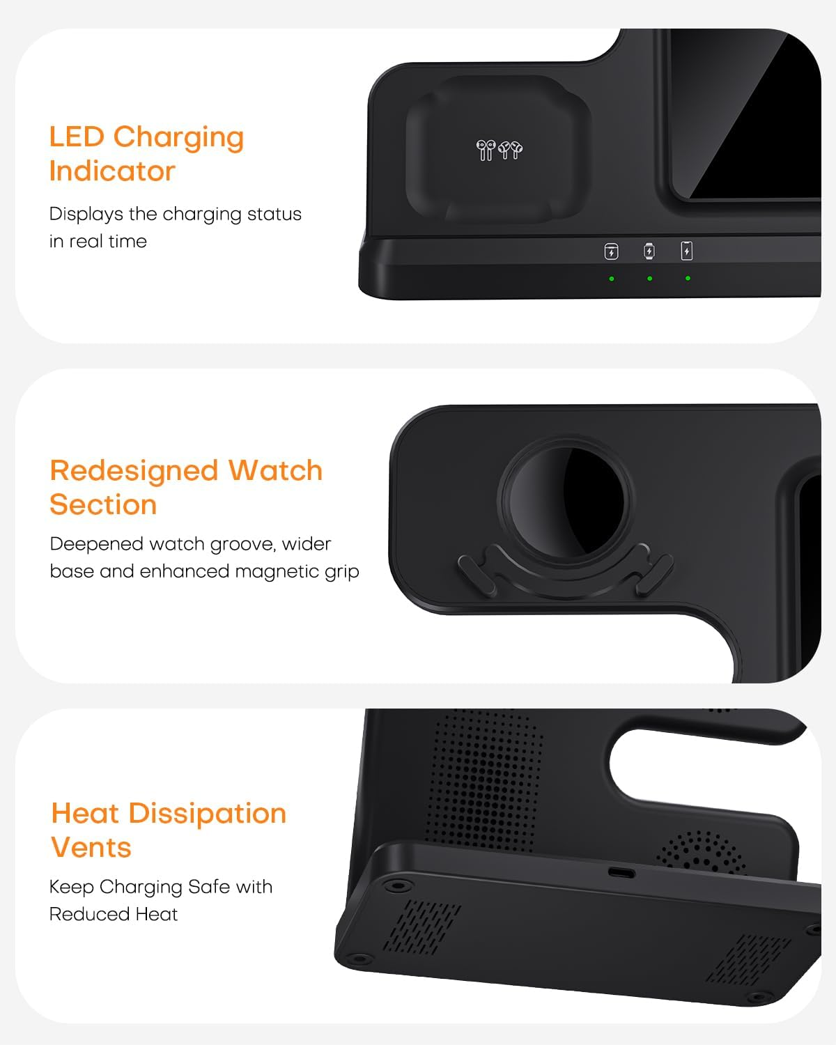 3 in 1 Wireless Charging Station for Samsung: This 3 in 1 Samsung wireless charger stand can serve as a Samsung phone wireless charger, Samsung Galaxy Watch charger, and Samsung earbuds charger at the same time. The Samsung wireless charging station design minimizes cable clutter, keeping your desk tidy—ideal for multiple Samsung devices. Safety First Samsung charging station: The Samsung charger station is UL/FCC certified in US, exceeding industry standards. With over-voltage/current/load protection + 48% improved cooling, ensures truly safe wireless charging for your $1000+ Samsung devices. Perfect wireless charger for Samsung: Galaxy Z Flip, S25 Ultra/S24 Ultra/S23 Ultra/S22/S22+/S22 Ultra/S21/S21+/S21 Ultra/S20+/S20 Ultra/Note 20; iPhone 16 Pro Max/15/14/13/12/8 Plus; Galaxy Buds 2 Pro/Buds; Galaxy Watch 7/6/5/5 Pro/4/4 Classic/3/Active 2/1. (Excludes Apple Watch, Galaxy Watch Gear, Sport, Fit, and Live Series). Phone/Buds Case Friendly: This Samsung charging stand can charge directly through phone cases ≤5mm (0.2 inches) thick. When charging your phone, remove magnetic cases, metal cases, metal rings, credit cards, metal wallets, and magnetic pads to avoid affecting fast charging. Thoughtful Design: This Samsung charger station features Clear LED indicators, show real-time charging status. When placing multiple devices, the corresponding LED automatically lights up for 30 seconds. The kit includes an 18W USB-C adapter and a 3.3-foot cable, perfect for the office, nightstand, or living room. Effortlessly power all your devices. Product Description 1 Neater 2 Safer 3 Cooler 3 in 1 Wireless Charging Station for Samsung You will get: 1x 3 in 1 Wireless Charger Station 1x UBS A To UBS C Cable(3.3-foot) 1x QC 3.0 adapter 1x User Manual