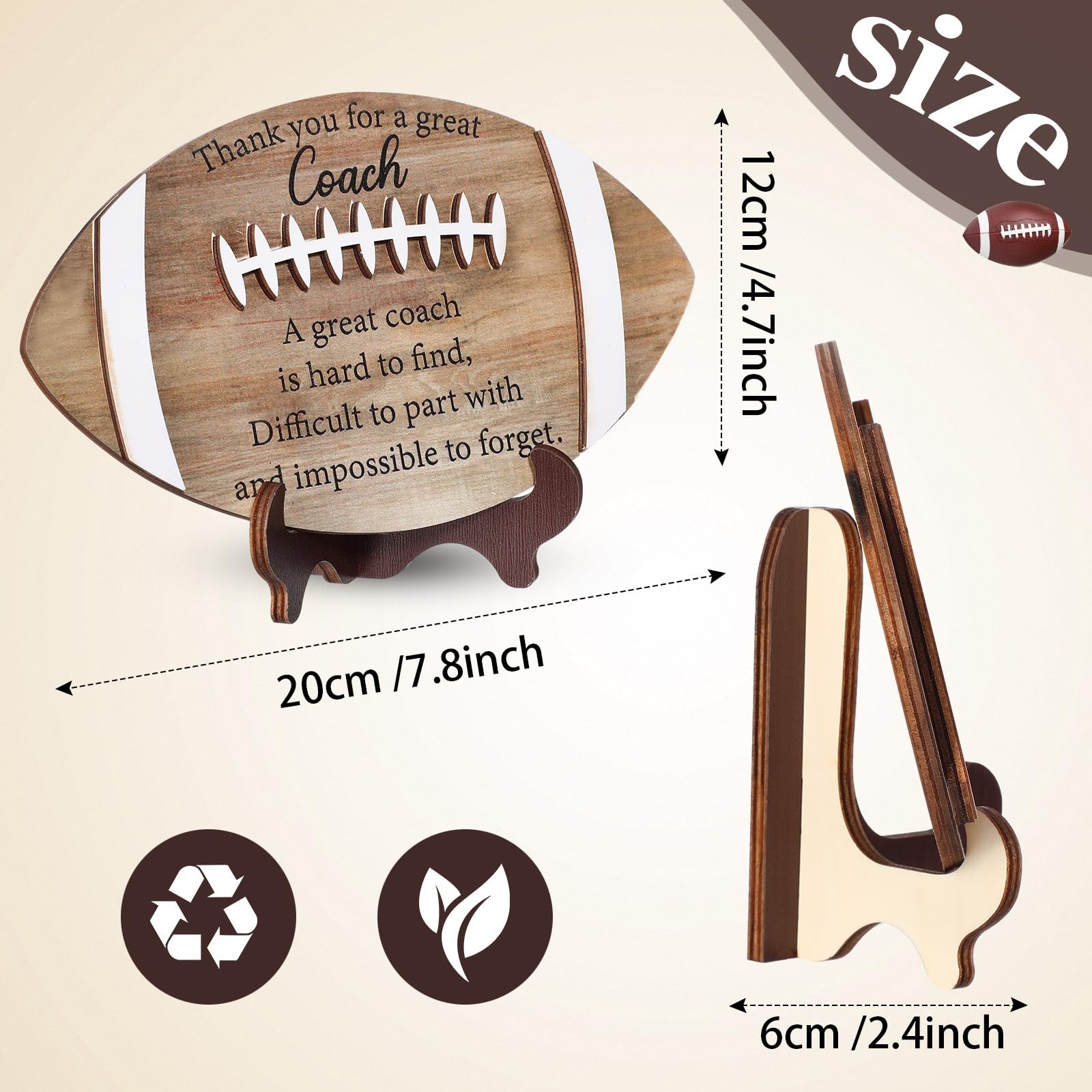 Features: Our football wood plaque sign with stands is not just a decoration, but a source of daily motivation. It's the good way to say 'Thank you' to those that contributed to your love of the game, enriching their daily motivations with meaningful tokens of appreciation. This wood football coach plaque sign is a good way to show appreciation to your football coaches. It is suitable for appreciation, learning in team, coach's birthday, retirement or graduation. Specifications: Material: wood Color: wood color Size: about 7.9 x 4.7 x 0.5 inches/ 20 x 12 x 1.2 cm Package includes: 4 x Wood plaque sign with stand Notes: Manual measurement, please allow slight errors on size. The color may exist a slight difference due to different screen displays. Coach Appreciation Gift Package: our appreciation football coach gifts pack comes with 4 thank you coach wood plaque signs, each with its own stand, which shows your thoughtful consideration for them; It not only shows gratitude, but also wishes them better in the future Wood Material: the football coach inspirational plaques we made are lightweight and sturdy, made of wood material; These wood plaque signs stand as good football coach gifts with motivational and thankful messages that is clear printing of copy; The distinct wood color not only adds an appealing aesthetic touch, but also ensures these decoration pieces can seamlessly blend with a range of interior decor styles Good Size: these wooden plaques measure around 7.9 x 4.7 x 0.5 inches/ 20 x 12 x 1.2 cm, and the support height of the bracket is about 1.2 inches/ 3cm; This makes them versatile enough to either stand out as a focal piece or act as decoration in your room; Regardless of your preference, our signs can certainly meet your decorative needs and personal style Thoughtful Design: our wood football coach plaques are designed not simply as an ornament, but as a meaningful gift; With the inclusion of handy stands, they can be effortlessly displayed on desks or shelves without requiring support; We've focused on offering an easy-to-use design, straight from the package to the desk Coach Appreciation Gift: the ultimate gift for the collegiate, or football travel team coach in your life; This football coach wood word would be the good gift for coaches during various festivals, such as Teacher's Day, Thanksgiving, Christmas, New Year
