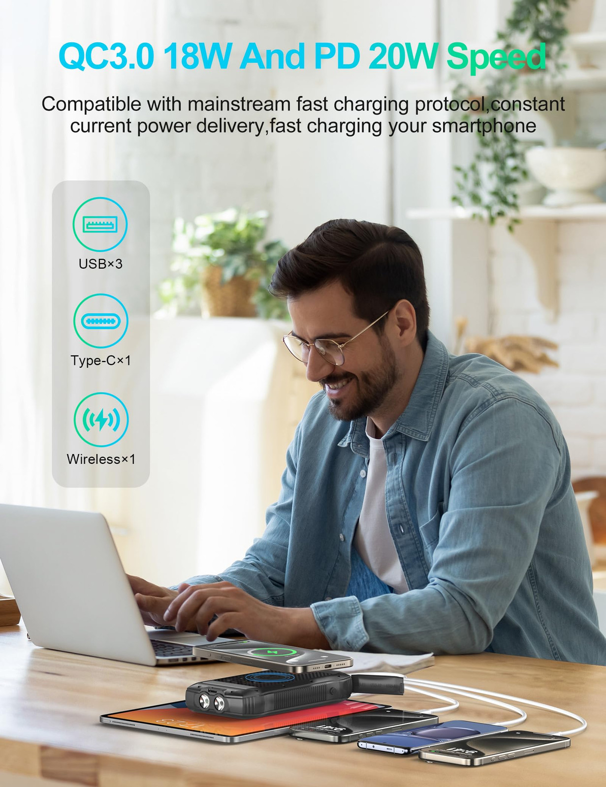 Ultra High Capacity: Solar power bank inbuilt 40000mAh Li-ion battery cells, over 1200 times recharging cycle. It's features a premium high-density Li-polymer battery and equipped with smart protection IC chip, making it more compact and safer than other power banks. Equipped with solar panel, just hang it on your backpack to get recharge via sunlight, It's perfect for outdoor activities Super Fast Charging: with QC3.0 22.5W USB A1 and PD 20W USB C output port, 15W wireless charging (NOTE: Short press before use). Micro and Type-C dual input, only need 6H to refuel by 20W adapter, this solar portable charger can charge 5 mobile devices sync Powerful Led Flashlight: 4W 300 lumen 25H (strong) /40H (soft) working, long range focusing lighting cup reach 165FT distance, solar battery bank has strong/ soft/ SOS/ strobe four modes, helps you send emergency signals. Widely for camping, hiking, car repairing Rugged Structure: The outer case is made of flame-retardant ABS and PC materials., anti slip for firmly grip, The waterproof silicone better protects the internal structure of the charger. Rubber skin-feel oil coating process to form a protective film on the surface, comfortable touch, and exquisite appearance. Equipped with a strong microfiber self adhesive lanyard, easy to hang on your backpack What you get: 1X 40000mAh Solar Power Bank, 1X USB C Cable(50cm), 1X User manual, and friendly customer service Kindly Remind: Mono-crystalline solar panel is a backup power when other sources out, solar charger efficiency is influenced by weather, season, geographic latitude, altitude, atmospheric mass, please full charge this solar phone charger before outside