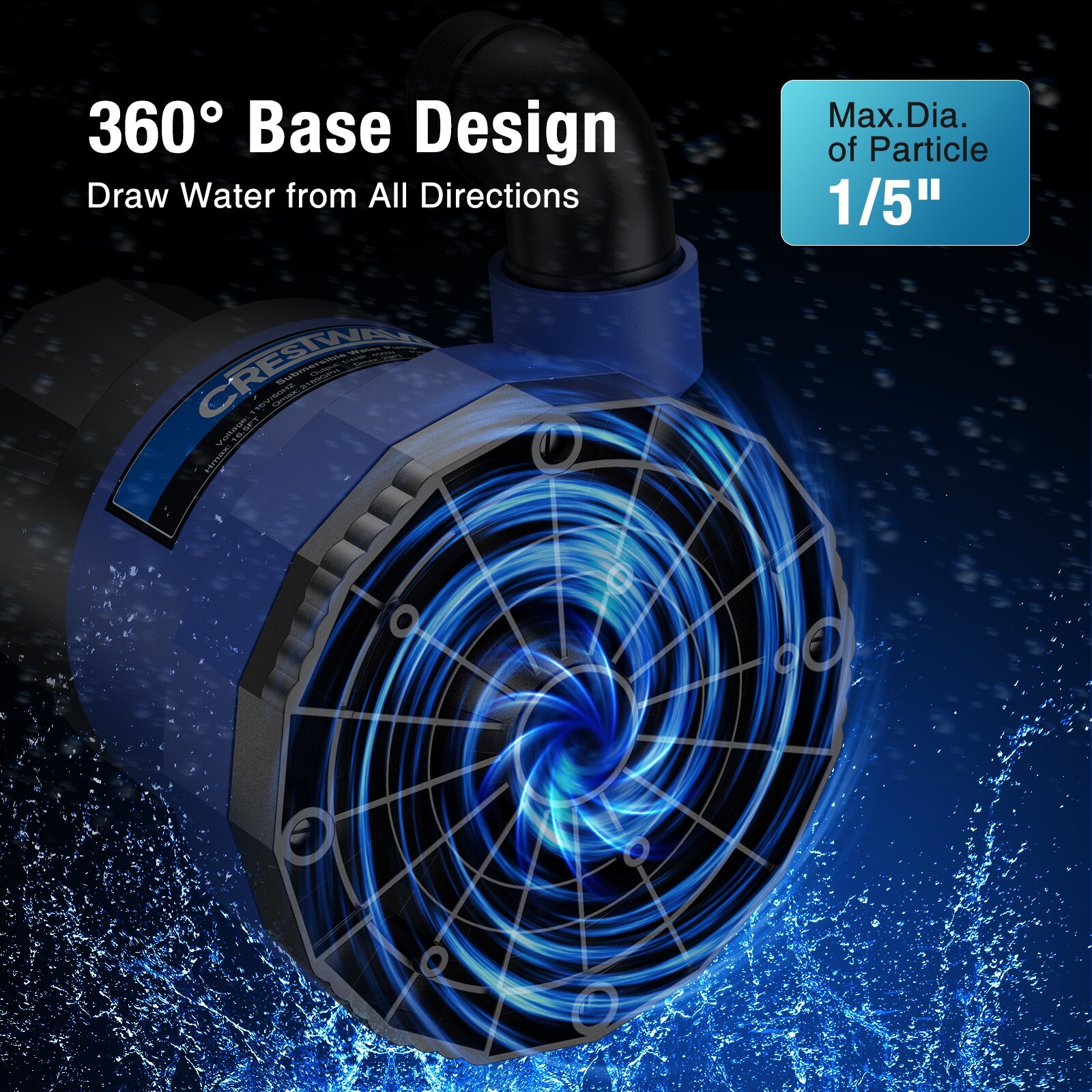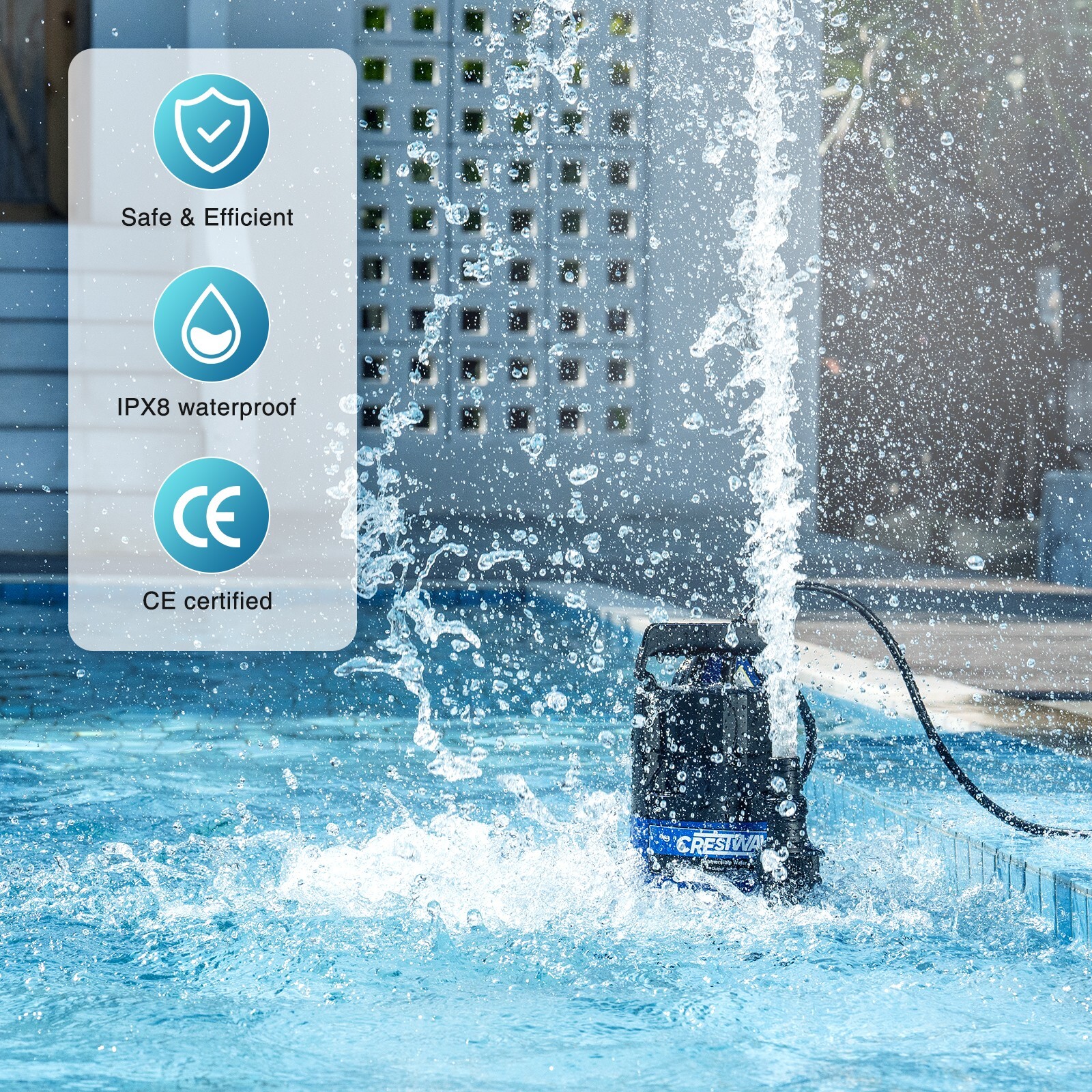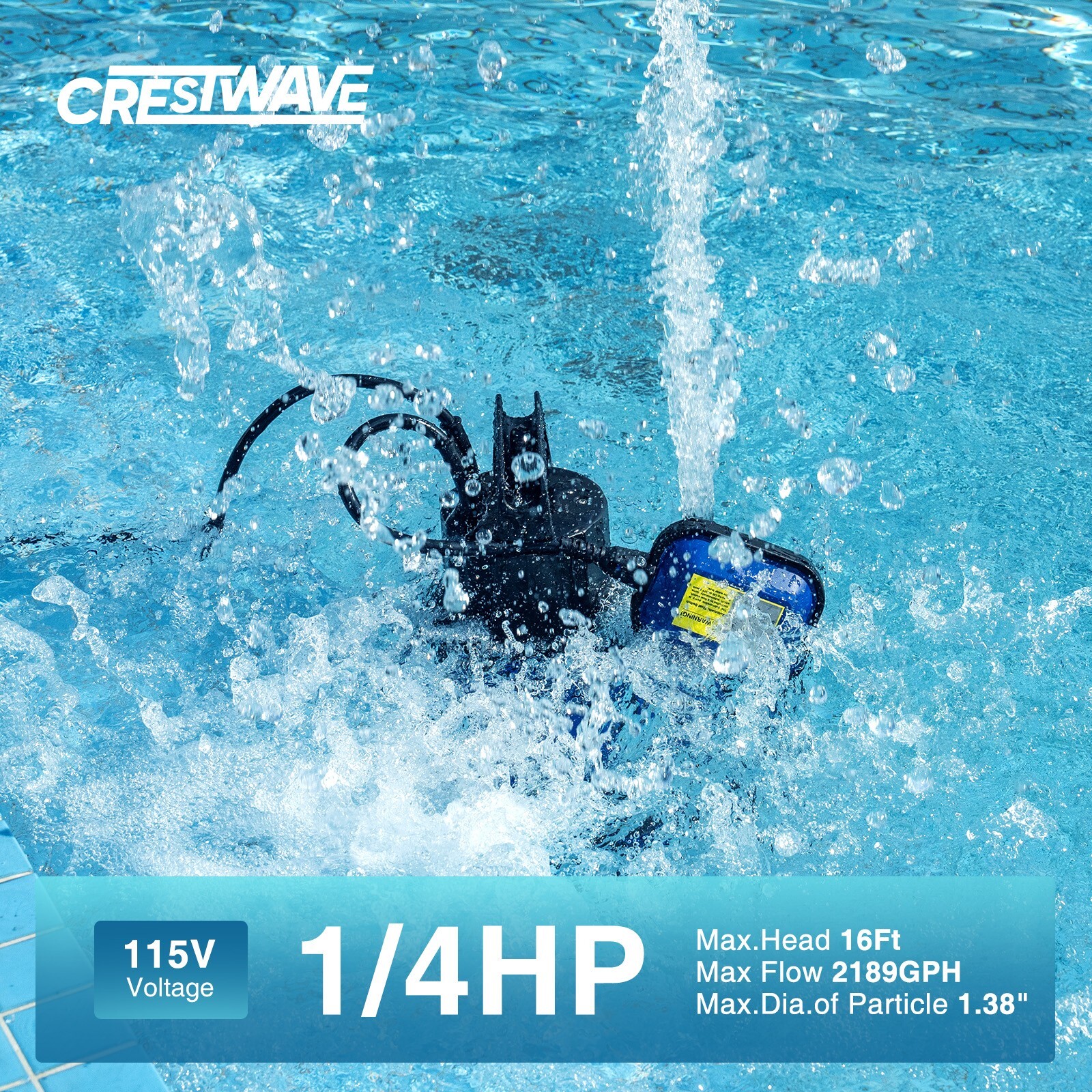 Features: 1. Powerful and Efficient Pump: Featuring a 400W 1/4HP motor, this submersible water pump achieves a maximum flow rate of 2189GPH and a maximum head of 16.4 ft (5m), making it perfect for efficiently draining basements, pools, and flooded areas 2. Automatic & Easy Manual Mode with Detachable Float Switch: CrestWave sump pump includes a float switch for dual operation. Use the automatic mode for hands-free water level detection or switch to manual mode by securing the float to the clip for constant pumping when needed 3. Flexible Hose Compatibility: Designed for versatile water removal, the sump pump submersible has a 1-1/4" NPT discharge outlet and includes a multi-hose adapter compatible with NPT1-1/4", NPT1", and ∅1" hoses, ensuring quick and easy setup for any job 4. Durable & Corrosion-Resistant Design: Constructed from premium thermoplastic composite materials, this submersible water pump is built to resist corrosion and wear. The sturdy base can handle debris up to 35mm, ensuring uninterrupted performance and minimal maintenance 5. Thermal Overload Protection & Certified Safety: Equipped with an automatic reset thermal overload protector, the submersible water pump ensures safe operation even during extended use. The 25ft (7.6m) UL-certified power cord, IPX8 waterproof rating, and CE certification guarantee reliability and peace of mind.