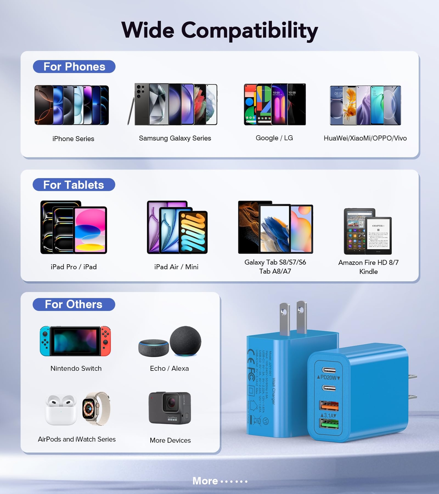 2-Pack 40W Fast Charging Block:The USB C Charger supports the Power Delivery and Quick Charge 3.0 fast charging functions with a total power of up to 40W.The USB-A port offers an output power of 3.1 A/5 V,while the USB-C port offers a charging speed of 20W.Charge your iPhone devices from 0% to 58% in just 30 minutes Multiport Charging:The charger block has Dual USB-C ports and Dual USB-A ports. Allow users to charge phone, tablet and headphones simultaneously to minimize waiting time. It’s also a great space saver instead of taking up 4 wall outlet ports. The best replacement for your original usb charger Universal Compatibility:Due to the special 4-port,the USB charger is compatible with almost all electronic devices,charging adapter for iPhone 16/16 Pro/16 Pro Max/16 Plus/15/15 Pro /15 Pro Max/14/14 Pro/14 Pro Max/13/13 Mini/13 Pro Max/12/12 Pro Max/12 Pro Max/12 Mini/SE 2020/11/11 Pro/11 Pro Max/XR/XS/X/8/7,iPad Air/Pro/Mini,Samsung Galaxy S23/S22/S21/S20/S10/S9/S8/A12/A13/A22/A32/A52/A53/A71/Note 20 10,Tablets,LG,Motorola,Google Pixel and other digital devices compatible Compact and Portable:Incredibly compact size for enhanced portability.All this power comes installed in a pocket-friendly compact body, to go wherever the journey takes you. Ideal for home, office and on the go Safe and Reliable:Equipped with a smart chip, which can adjust the input power of the phone to prevent the phone from overcharging and overheating