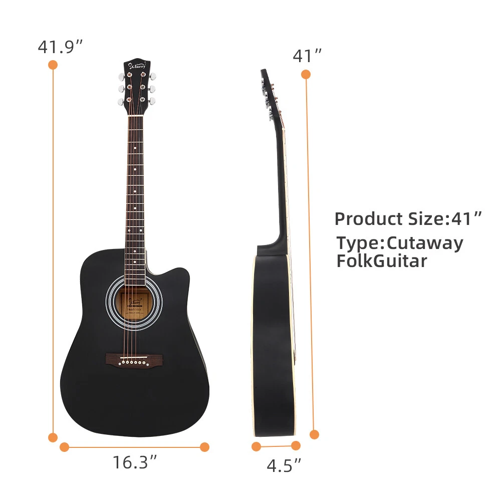 Introductions: Our Glarry GT502 41-Inch Notch Spruce Panel Matte Edging Folk Guitar are made of spruce panels and eucalyptus backings and sides. The spruce panel is sturdy and flexible, which makes the guitar's sound transmission faster and has a rich timbre change for a variety of occasions. This is suitable for students, beginners, professional performers, and all kinds of music lovers. The neck has an adjustable design, and with the wrench we have, we can adjust the curvature of the neck. Thanks to the fully enclosed knob design, the rust resistance is good and the life of the knob can be increased. What are you still hesitating about? Hurry and buy it! Features: 1. Full-size 41 inch cutaway dreadnought body for full and vibrant tone, suited for all styles of music 2. Right-hand design, spruce top and basswood back and sides bring you richer and brighter sound 3. Rosewood fingerboard and bridge, smooth, stable and impervious to string wear 4. Produce a nice mellow tone with crisp highs and powerful bass 5. Dreadnought body design with a single cutaway 6. Excellent intonation and sustain 7. Full enclosed knobs, single edging 8. Ideal for both students and Beginners 9. Come with a bag, a protective board and a wrench Specifications: 1. Brand: Glarry 2. Size:41" 3. Model:GT502 4. Type:Cutaway 5. Body Type:Dreadnought 6. Guitar Color: Black 7. Board Material: Spruce 8. Back Material: Basswood 9. Side Panel Material: Basswood 10. Fingerboard Material: Rosewood 11. Tuning Peg Material: Metal 12. Nut Material: ABS Plastic 13. Bridle Bridge Material: Rosewood 14. String Winder Peg Tool: Full Closed String Axis 15. String: Steel String 16. Number of Frets: 20 Frets 17. Nut Width:43mm 18. Scale Length: 25.4" 19. Unilateral: Package White Unilateral 20. Guitar Dimensions: (41 x 16.3 x 4.5)" / (104.14 x 41.4 x 11.43)cm(L x W x H) 21. Guitar Weight: 4.08lb / 1.85kg Package Includes: 1 x Guitar 1 x Guitar Bag 1 x Guard Board 1 x Wrench Tool