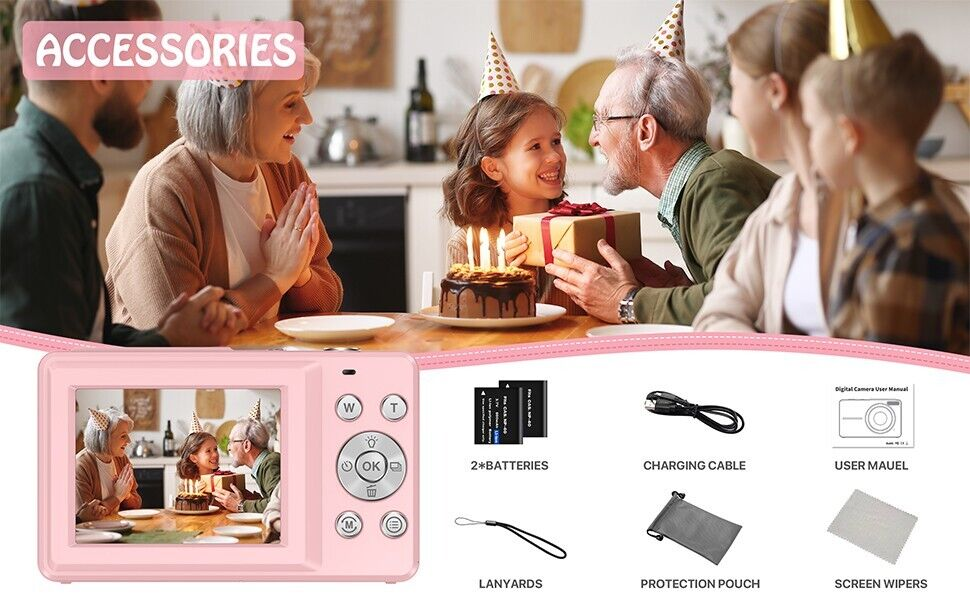 Condition: Brand new, sealed in original packaging. Shipping: Same-day dispatch via Royal Mail Tracked 48 (subject to availability). Upgrade: Choose 24-hour delivery for an additional +£1.99 . Returns Policy: Returns accepted within 14 days of delivery. Fast Delivery Hassle-Free Returns 100% Authentic ❤【HD 1080P & 44MP Digital Camera】This digital camera has a HD image resolution of 1080P and a video resolution of 44MP with a built-in microphone and speaker to help you take HD photos or videos to capture great moments and record unforgettable moments. ❤【Webcam & Vlogging】 This digital cameras for kids can be used as a webcam. First turn off the camera, connect the cameras with the USB cable, press the Power button and Shutter button at the same time to switch to webcam mode, and then you can make a video call. You can also transfer camera files to your computer to share your photos and videos on Facebook, YouTube and other social media. ❤ 【16x Digital Zoom & Fill Light】 This camera for kids supports 16x digital zoom, and you can zoom in or out on images and videos by adjusting the W/T button. The built-in fill flash helps you to take high quality photos in the dark. The external tripod port allows you to mount a tripod to help you take steady shots. ❤【Multifunctional Camera & Easy to Carry and Use】This cameras has anti-shake, face detection, smile detection, continuous shooting, timer shooting and timer shutdown. This mini portable camera is very lightweight and can be carried anywhere in your pocket, easy to operate and great for beginners, children and teenagers. ❤【Best Gift & Perfect After-sales】 This vlogging camera is a perfect gift for fathers, mothers, adults, teenagers, children and students, whether it's Mother's Day, Father's Day, Thanksgiving, birthday and Christmas. We offer 1 year warranty, if there is any problem, please feel free to contact us, we will provide you with perfect service within 24 hours to ensure your shopping is hassle-free. Product Description 16X Digital Zoom Zoom in and out of images and videos by adjusting the W/T buttons. Webcam & Live Streaming The digital camera has a webcam function, can participate in live web broadcasting, and record real-time video. With a USB cable, you can connect a digital camera to a computer to download pictures and videos you have taken. LED Fill Light Built-in LED fills light, so you can shoot in low light indoors or outdoors. Timed Shooting Timer recording function that gives you enough time to pose for photos or videos. Timed Shooting records the beauty of memory worth keeping forever. Continuous Shooting Continuous shooting allows you to take a series of photos in quick succession. It's easier to capture and select your best moments and never miss a single shot of your exciting life. Anti Shake Built-in anti-shake function, you could take clear and beautiful pictures when a child is doing exercise. Product Specifications Display LCD 2.5 inches Digital Zoom 16X Movie Size 1080P/720P/480P Image Resolution 44MP/42MP/36MP/24MP/etc Memory Card Support Micro SD card(Supports up to 32GB) File Format JPG, AVI Selfie 2s/5s/10s Focal length f=7.36mm Aperture F/3.2 Auto Power Off 1Min/2Mins/3Mins/4Mins/5Mins/10Mins USB Support Type-C Operating System Requirements Windows XP, Windows Vista, Windows 7, Windows 8, Windows 10, Mac 10.2