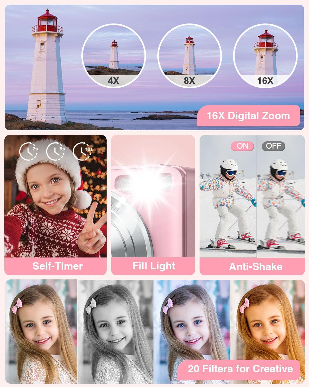 Store New Arrivals Add to Favorite View Feedback Contact Digital Camera, 44MP FHD 1080P Camera for Kids with 32GB Card, Point and Shoot Digital Camera for Teens with 16X Zoom, Portable Kids Camera Gifts for Girls Boys Student Children(Pink) Description Display Resolution Maximum 44 MP Age Range Description Kid Battery Cell Type Lithium Ion Has Color Screen Yes Are Batteries Included Yes Maximum Webcam Image Resolution 44 MP Shooting Modes Movie, Panorama, Automatic, Sports Focus Type Auto Focus Focus Features Autofocus Auto Focus Technology Phase Detection Movie Mode Yes Image stabilization Digital Photo Sensor Technology CMOS Autofocus No Photo Sensor Size 1/4-英寸 Lens Type Standard Audio Recording No Optical Zoom 16 x Effective Still Resolution 44 MP Sensor Type CMOS Video Capture Format MP4 JPEG Quality Level Fine Model Number DC403 Battery Weight 10 Grams Exposure Control Automatic Skill Level Novice Battery Type Lithium Ion Number of Batteries 1 Lithium Ion batteries required. (included) Screen Size 2.4 Inches Flash Modes Automatic File Format JPEG Total USB Ports 1 Image Capture Type Stills & Video Model Series DC403 Total Still Resolution 44 MP Camera Flash no flash Water Resistance Level Not Water Resistant Zoom Digital Zoom Exposure Control Type Automatic Supported File Format JPEG Connectivity Technology USB Viewfinder Optical Special Feature Self Timer Mount Type Tripod Display Type Fixed Focus Mode Single-Servo AF (AF-S) Has Image Stabilization Yes Frame Rate 30 FPS Color Pink Form Factor Compact Photo Sensor Resolution 44 MP Digital-Still Yes Compatible Devices Computers Specific Uses For Product Vlogging White Balance Settings Auto Image Stabilization Digital Digital Zoom 16 x Built-In Media Camera Body & Accessories Video Resolution 1080p Aspect Ratio 4:3 Model Name DC403 2024's Latest Digital Camera - With a 44MP resolution and Full HD 1080P video recording, this digital camera delivers high-quality images and videos for all your photography needs. Perfect for documenting everyday life, or special events, this point and shoot digital camera captures moments with exceptional detail and vibrant color. Tailored for kids, teens, and beginners, it offers a variety of features with user-friendly operation, making it ideal for fostering an interest in photography among kids and creating beautiful memories with family and friends Packed with Versatile Features - This kids camera is more than just point-and-shoot—featuring 16X digital zoom to bring far-off subjects close. The built-in fill light ensures well-lit shots, while anti-shake technology keeps your photos crisp and clear. A self-timer (with 2, 5, or 10-second options) and continuous shooting mode give you even more flexibility. Designed to unleash your creativity, the digital camera for kids includes 20 creative filters for fun and artistic effects. Plus, it doubles as a webcam, perfect for video calls and live streaming Lightweight & Easy Photo Transfers - This lightweight digital camera is designed for hassle-free use, making it ideal for kids and beginners. Weighing just 0.25 lb, this compact digital camera slips right into your pocket, ready to capture every moment on the go. The included lanyard ensures it's always within reach, making it perfect for everyday adventures. Easily transfer your photos using the provided USB-C cable to quickly download them to your computer. Plus, with a 32GB card included, you'll have ample space to store all your favorite memories Simple & Out-of-the-Box - No complex setups required—this digital camera is ready to go right out of the box. It comes with all the accessories you need to start shooting immediately. Accessory List: Charger, Type-C Cable, Battery, Micro 32GB SD Card, Storage Bag, Lanyard, Cleaning Cloth. Press the shutter button to capture your shot, then use the playback function to view your images or videos right away. With a bright, easy-to-read 2.4-inch LCD screen and intuitive menu options, this point and shoot camera is a breeze to operate. It's perfect for beginners and kids alike Perfect Gift & Unbeatable Service - Searching for the perfect present? This digital camera is an ideal choice for birthdays, Christmas, holidays, or any special occasion. It's not just a gift—it's a key to a world full of memories. This digital camera for teens is beautifully packaged with everything needed to start capturing life's moments, making it a thoughtful surprise for loved ones. Plus, enjoy a full year of comprehensive support, ensuring a worry-free experience with our kids digital cameras Product Description ABOUT US We offer the best prices around on high quality products. Our E-store includes media such as books, movies, music and games while offering electronics, toys, sporting apparel, clothing, tools, general home, garden items and more. SHIPPING We are always working hard to ensure your package arrives as soon as possible. Please understand that some factors like weather, high postal traffic, and the performance of shipping companies are outside of our control. We offer free shipping to the lower 48 states and ship within 2 business days of payment, usually sooner. We do not accept P.O. Boxes. Please provide a physical address. For shipping outside of the continental USA, we only use eBay's Global Shipping Program.The item is shipped to KY and then sent to the rest of the world. International customers are responsible for all duties and taxes. Continue to check out in order to calculate costs for shipping the item to your country. Messages regarding eBay's Global Shipping Program MUST be directed at eBay EXCLUSIVELY. RETURNS We offer a 30-Day Return Policy on items which you are not completely satisfied with. You have the option for a full-refund or an exchange of the item. No returns are available on items shipped outside of the USA. PAYMENT We accept PayPal. CONTACT US This page content is yet to come Please ad us to your favorite seller and visit again later Tha