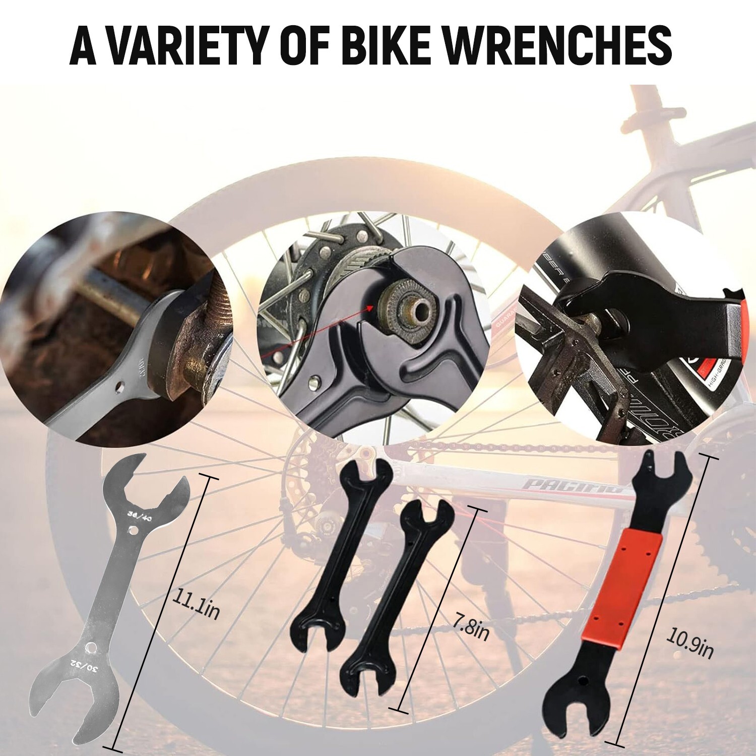 Features: Bike Repair Tool can disassemble the freewheel, changing bottom bracket, removing chain, adjusting spoke, repairing tire and so on. Not only can you meet your bicycle repair needs but also can be used as the household tool, it is a must-have for repairmen, construction workers, auto mechanic etc. These 44 pcs bike repair tools are specially designed and manufactured for bicycle maintenance and repair. This kit use carbon premium steel and high-quality plastic, this bicycle repair tool kit is durable enough for the repair of tires, brakes, lights & chains. Specification: 【Package Includes】: 1 x Freewheel Remover Tool;1 x chain rivet extractor;1 x Headset Spanner Wrench 30/32mm & 36/40mm;1 x Chain Whip;1 x Tyre Pressure Measurement Pen;1 x Open End Wrench 8/10mm;1 x Phillips/Flat Head Screwdriver;1 x Crank Arm Remover;1 x L-Handle;1 x Wrench;1 x Cartridge BB Tool;1 x Adjustable Wrench;1 x Adjustable Lock Ring Spanner;1 x Pedal Wrench 15/16mm & 16/17mm;1 x Bottom Bracket Cup Wrench;1 x Forged Spoke Adjuster Notice: In case the item is defective, please inform us within 15 days of receipt, we will arrange reship or refund. Buyers have to pay for the return cost and we will pay the cost for resend. If you are unsatisfied with our item or service, please contact us before leaving any feedback. We are committed to resolve all issues in a friendly and satisfactory manner. We always reply to messages within 2 business days (off-duty at weekend).If you do not get a response from us, then please check your junk or spam mailbox.