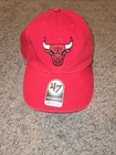 This is a vintage '47 brand Chicago Bulls baseball cap in red, with an adjustable strap for a comfortable fit. It features the NBA team's logo and is designed in a solid color style. Perfect for men who are fans of the Chicago Bulls or sports enthusiasts looking for a stylish accessory.
