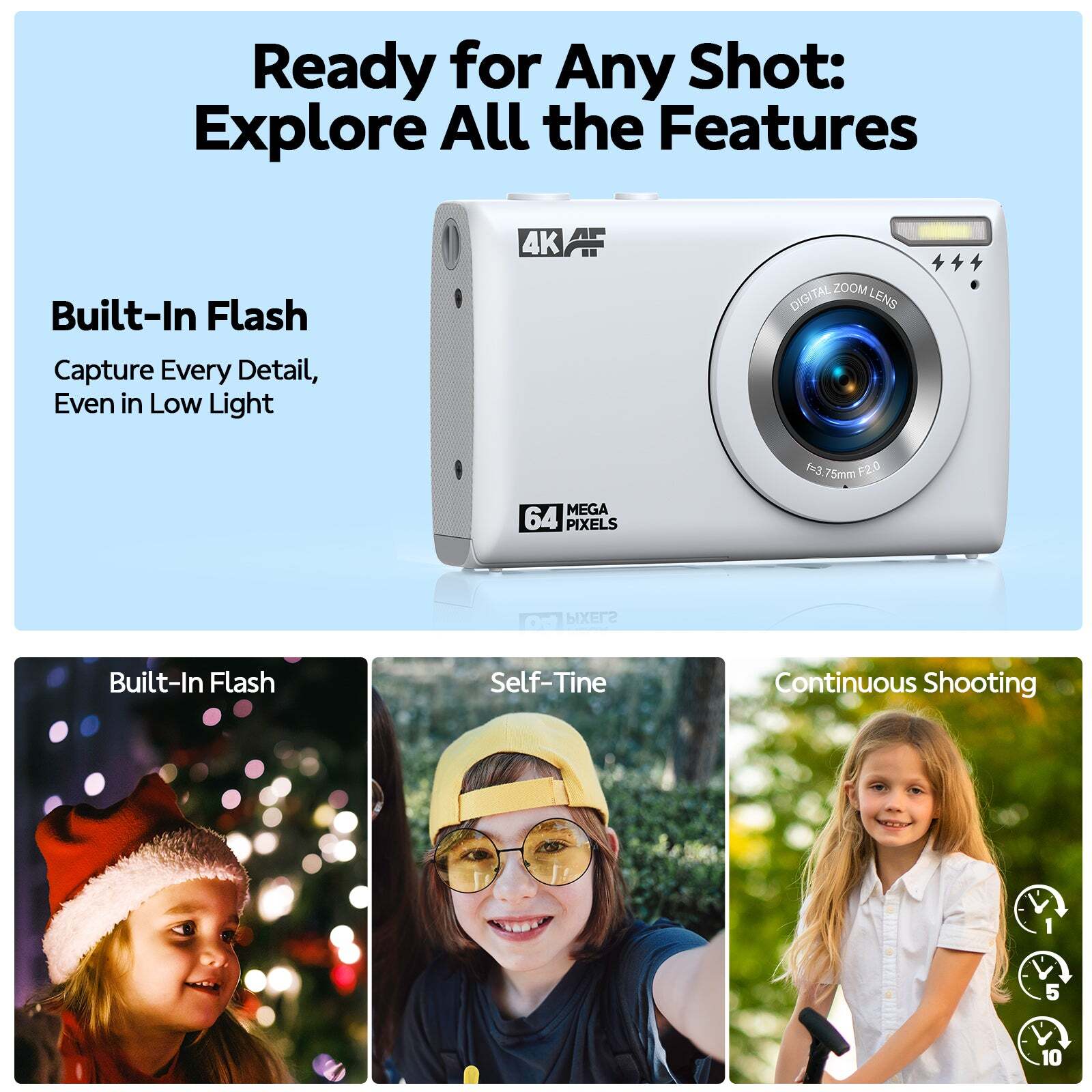 Product Description Digital Camera 4K 64MP with 32GB Card, Point and Shoot Digital Camera with 18X Digital Zoom, 2 Batteries, Compact Small Camera for Teens Kids Boys Girls 【Compact and light Small Digital Camera 】 : The digital cam weighs only 0.4 pounds, product size (0.78*3.7*2.1 inches) is very small and light, especially suitable for children's small hands to operate the buttons. There is a lanyard in the package which is convenient for carrying and moving to prevent the camera from being lost 【Easy to Use Camera 】 : The compact digital camera designed for Primary school Junior school students teenagers. With a few buttons, an intuitive interface has very simple operation. Young children can also use it well. It is recommended for elementary school students aged 6, 7, 8, 9,10, 11,12 and 13. Not recommended for professional adults photographers to buy and use 【64MP Images and 4K Camera Videos】 : Recommended to view the captured content on the computer, you will find many clear and beautiful moments. After connecting the data cable to the camera and the computer, then turn on the camera, enter Mass Storage Mode and Click Confirm, you can view the captured pictures and videos on the computer 【Multi-function Small Digital Camera】 : Compact digital camera has builted in many basic functions such as photo shooting, video recording, selfie, time-lapse shooting, automatic shutdown, multiple filters, etc.. Different languages are available which can meet the photography needs of children and stimulate interest to explore the world and record life 【32GB Card and 2 Batteries】 : This compact digital camera 4K contains 2 rechargeable lithium batteries which can be charged for the children's camera via a USB cable. After fully charged, it can shoot continuously for 3-4 hours, reducing the time for frequent charging during travel; Package includes: 1*Children's digital camera, 2*Rechargeable batteries, 1*32GB card, 1*Lanyard, 1*USB data cable, 1*User manual 【Holiday Christmas Gifts for Children Teenagers】 : Compact digital cameras are very suitable for beginners of children's photography. Parents can give them to their children such as birthdays, New Year, Christmas, and Thanksgiving as holiday christmas gifts, so that they can use it to travel or record their beautiful daily lives. Portable camera digital can also help expand interest in photography and effectively prevent them from being addicted to mobile phones Previous page 4K Video & 64MP Photo Use kids digital camera to record every beautiful memory and treasure every happy moment Next page Previous page Self Timer Time-lapse shooting allows you to delay time and start taking pictures after 3S/5S/10S Next page Previous page Easy to carry The camera is small and light, especially suitable for kids‘s small hands to operate the buttons Next page Easy to carry Super Light and Compact Playback on computer Connect cam to computer Previous page Next page How to use the camera? Notes on using the camera Guide to Camera Menus How to Play Back?