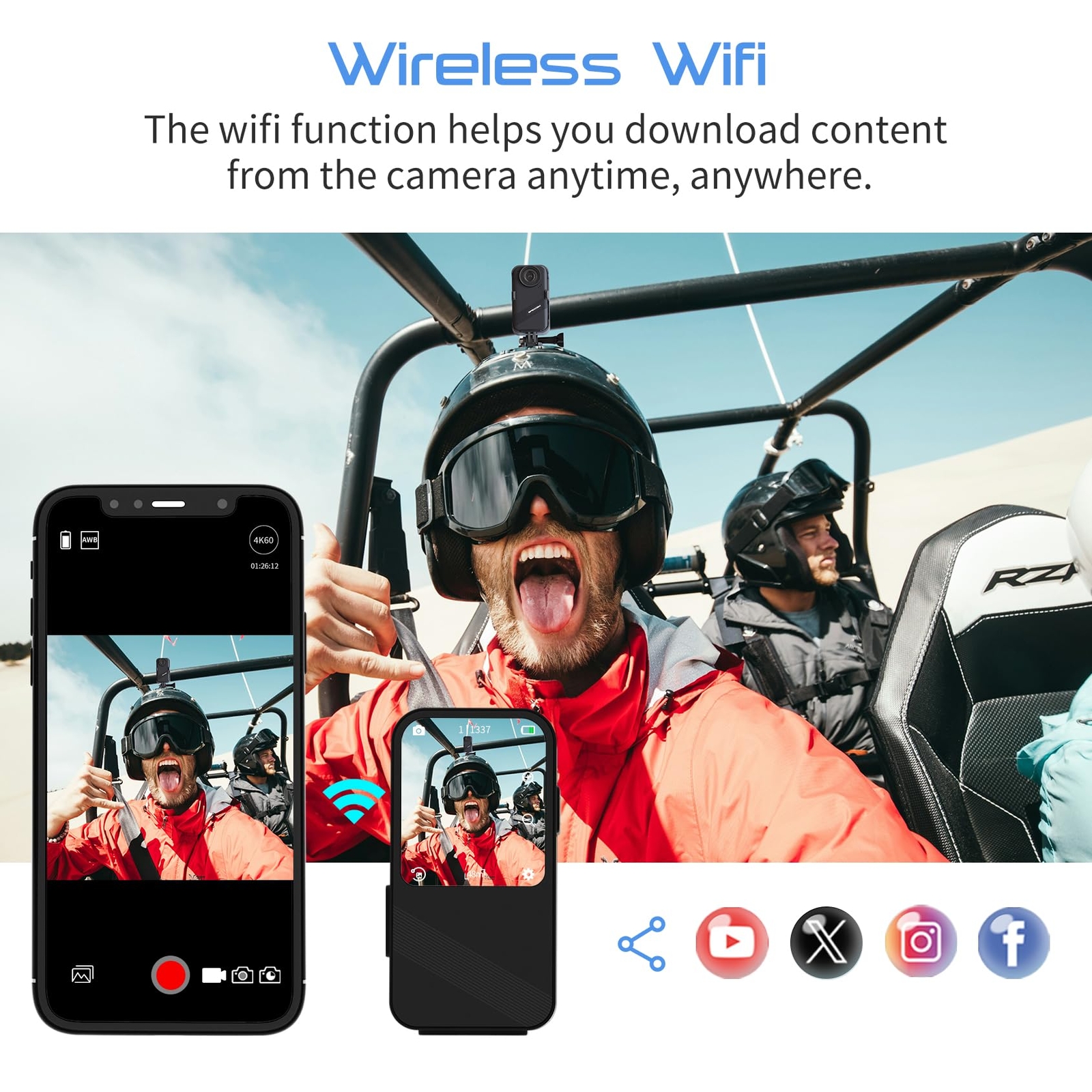 4K Ultra HD action camera: 4K60Fps video with 48MP photos, this action cam can offer you professional shooting. Body-Waterproof to 66FT: This underwater camera is bare waterproof to 20M, perfectly suitable for a lot of water activities such as: diving, snorkeling, surfing, water-jumping etc. No needing a waterprrof case, this waterproof camera can better catch the audio. Multi-Functional Sports Camera: this action cam has burst photo, slow motion, fast motion, pre/loop recording, anti-shake, time-lapse video/photo, vertical shooting, drive mode as dash cam, satisfying your all kinds of shooting need. Touch-Screen Design: 1.5'' bright touch screen offers you you a better preview and easier control, much more convenient to use. And thumb size makes it light and portable, you can grap and use this helmet camera in a variety of sports environments. Tons of Accessories KIts: Wrist 2.4G remote, you can capture the world with an easy click. Back clip enables you hang this mini action cam in your pocket or backpack strap. 2*1350 mAh batteries give you much longer use time. It also comes with a free 64GB memory card, so you don't need to buy another one.