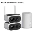 Camcamp Wireless Security Camera System Outdoor, 4MP Wifi Solar Camera Powered Panel Smart Home Security Cameras, 100% Wire-Free Solar Camera Kits, PIR, Spotlight, Color Night Vision, 2-Way Talk, IP66 Waterproof, SD Card/Cloud Storage,Video Surveillance Camera kit 100% Wire-Free This solar powered security camera is equipped with an integrated solar panel and a built-in high-capacity battery that allows the solar camera to operate without any external power source, meaning the camera can be placed anywhere, which is not only environmentally friendly but also reduces the frequency of disassembly for charging. Built-in battery 8000mAh 21700 standard battery (non-replaced) This solar security camera can be powered by solar panel or directly use adapter supply to power .when the sunlight is not enough ,you can directly power it .if you need 24/7 recording ,suggest to use adapter supply power . Advanced Base Station Design A more secure, stable and private wireless connection is used between the camera and the base station, and all camera data is saved to the SD card of the base station, so no data will be lost due to camera loss. Compared with traditional NVR, using Micro SD card storage can also save the customer's cost of use.it can support 4 pcs cameras to work at the same time ️ Quick and Easy Setup Thanks to the 100% wireless design, our solar home security cameras are easy to install and can be set up in minutes, without professional installation or any special tools, saving users the cost of wiring and hiring workers. And you can also share the camera access with your family members, so your family members can guard the home security together.base station connect with internet router via lan cable /rj45 cable ,camera connect with base station ,in this way,they are online to view on APP Stay One Step Ahead of Intruders Our security cameras are equipped with advanced PIR sensors that effectively filter out invalid alarms caused by mosquitoes, insects, fallen leaves, etc. When suspicious activity is detected, the base station and camera send out alerts while your phone receives notifications that you can tap to use to siren or roar to scare off intruders. See Everything, Even at Night With a built-in infrared light and dual light source spotlight, this 4mp home security camera provides higher definition color night vision for overall improved night vision. When an intruder breaks into your yard, the camera's sound & light alarm feature emits blinding lights and piercing sirens to help you scare off the intruder. Privacy Area,futher improve alert accuracy Up to 4 privacy zones can be added to protect the personal privacy and security of others.set up motion detection area to reduce unecessary alarm pushes Ues It Indoor & Outdoor With anits IP66 rating, this solar security camera stays stable in rain, hail, and shine.Ready for All Weather T he IP66 weatherproof standard allows the wireless security camera to withstand various weather conditions, even in rainy and snowy days. With 4MP resolution The solar-powered security camera captures sharp, clear footage for more visual details. Provide both color and infrared night vision modes for your night recordings, supporting night vision up to 10 meters (33 feet). Communicate From Your Camera Our two way talk feature allows you to communicate with family, visitors, delivery personnel, or potential intruders from anywhere, anytime. And you can monitor your property from anywhere in the world using your smartphone or tablet, so you can rest easy knowing that your property is always under watchful eyes. Work with Alexa assistant Free your hands ,you can wake up Alexa to keep tabs on the outdoor solar security camera Easily Add Wireless Security Camera System via "CloudEye 365" App