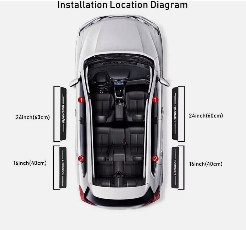 Fitment: For Ford Ranger Feature: 1. Material-Car Door Sill Threshold Stickers are made of carbon fiber leather, which is beautiful, non-slip, wear-resistant and waterproof. 2.Function-Car Door Sill Threshold Stic kers can not only cover car scratches, but also absorb impacts, protect door sill and any surface from scratches, scuffs and chips. 3. Install Easily-Self-adhesive, peel and stick. Easy installation and remove with no residual. Specifications: Material: Carbon fiber (NOT real carbon fiber ) Color: White&Black Size(approx.): L: 60cmx7cm=23.6"x2.7"; S: 40cmx7cm=15.7"x2.7" Installation Tips: 1. Ensure that the surface which the product is to be applied is clean, dry and free of all dust, grease and wax. 2. Determine exact location of product 3. Remove protective film from adhesive, align carefully and then press firmly to insure proper adhesion 4. Do not move the product or wash your car in 24 hours after installation Package: 4X Car Door Sill (2 For Front Door, 2 For Back Door)