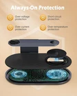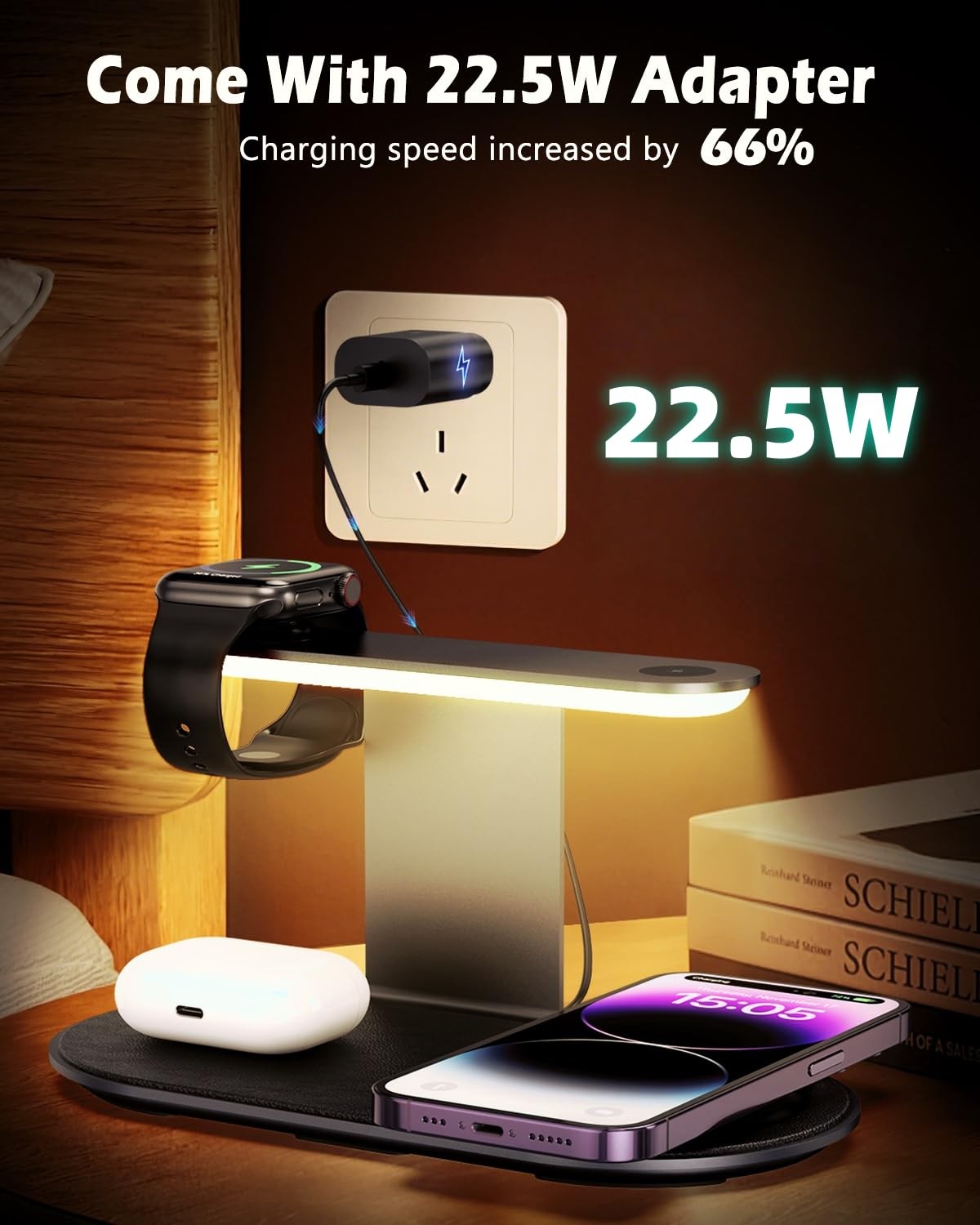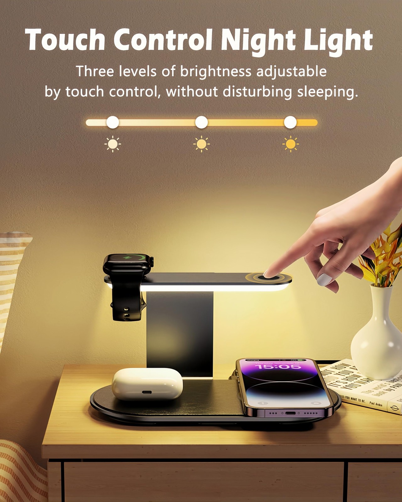 MODEL: EP-TA800. 【All in 1 Wireless Charger】This upgraded wireless charger can charge Phone (15W Max) , A pple Watch (2.5W) ,Air Pods (5W) simultaneously,no more tangled cables! Space-saving design: Perfect for nightstands, offices or travel 【Fast Charging & Ultra-Safe】Comes with QC3.0 Adapter(Included), it can charge 3 devices fastly and supports a maximum power of 30W; Auto-Shutoff Protection: Prevents overheating/overcharging, you can use it with confidence. There is also a seamless magnetic alignment feature for fast charging of phones 【Adjustable LED Night Light】Our wireless charger features an integrated LED night light, which has 3 brightness levels (High/Medium/Low) — Gentle glow for Bedtime lighting or midnight navigation 【Wide Compatiblity】This wireless charger is suitable for i Phone 12-16, A pple Watch 2-9/SE, AirPods Pro 1/2 & Air Pods 3 and other devices. (Other phones with wireless charging function are also supported) 【Premium Metal Body & Luxyry Durability】This fast charger stand uses aluminum alloy frame that is scratch resistant, drop resistant, and has a stylish and modern appearance; In addition, the charging panel of the watch is covered with leather to ensure durability and provide a non slip surface 【MODEL】EP-TA800