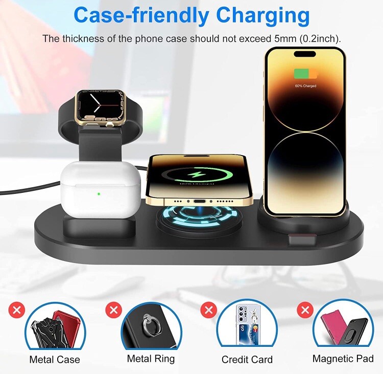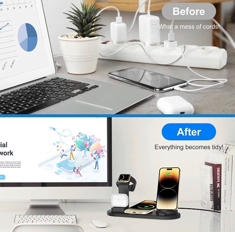 This charging station is a game-changer! The strong magnets hold my phone and AirPods securely while charging my Apple Watch and another device simultaneously. No more tangled cables—just drop and charge. Fast, reliable, and sleek design fits perfectly on my nightstand. Works flawlessly with my iPhone and Samsung tablet. Highly recommend for anyone with multiple devices!