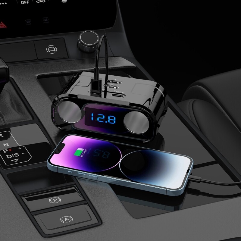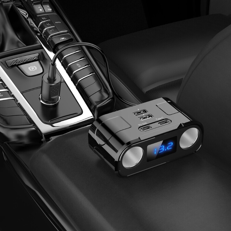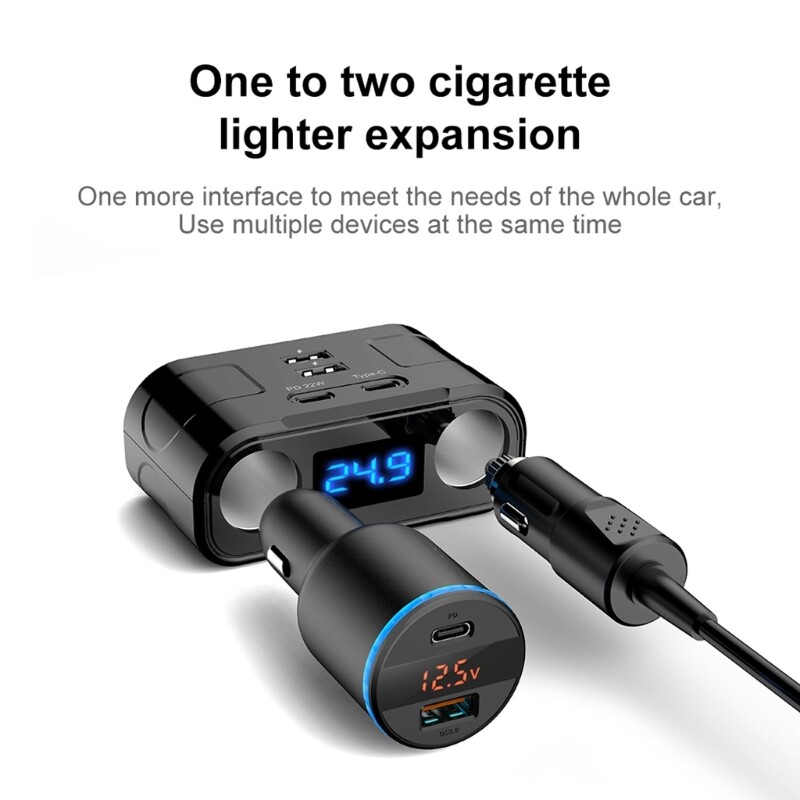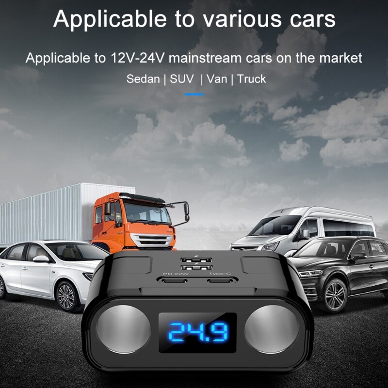 Portable 4-in-1 USB C Car PD+QC3.0 Quick Double Type-C & USB Port Features: The car cigarettes is split into two part, 2x type-c and 2x USB port, and can simultaneously four mobile phones. Intelligent chip with multiple protections such as overcurrent, overvoltage, over temperature, over-load, undervoltage, short circuit, Intelligent digital display, displaying the input and output function. The 70cm line length is convenient for rear passenger to Suitable for most mainstream 12V-24V models on the market, such as sedans, SUVs, minibus, trucks, Specifications: Color: Black Cable Length: Approx. 70cm/2.3ft Input: 12V24V Double USB Output: 5V2.4Amp Type-C 1 Output: 5V3A Type-C 2 Output: 5V3A/9V2.2A/12V1.68A Cigarettes Female Base Output: 60W Package Includes: 1x Car note: Please allow 1-2cm errors due to manual measurement. Please allow for slight color differences due to different display resolution.