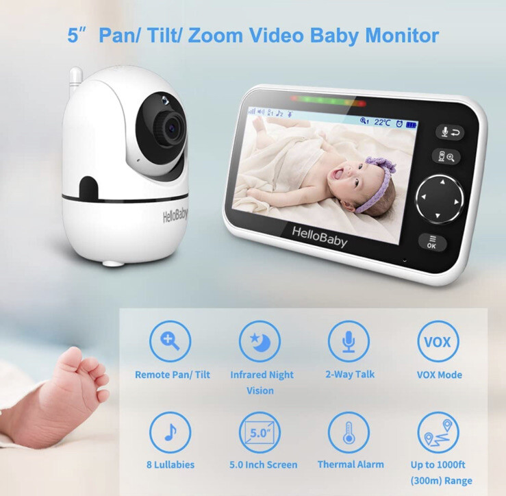 5” LCD Baby Monitor with Pan-Tilt, Night Vision, Audio, and Music Player