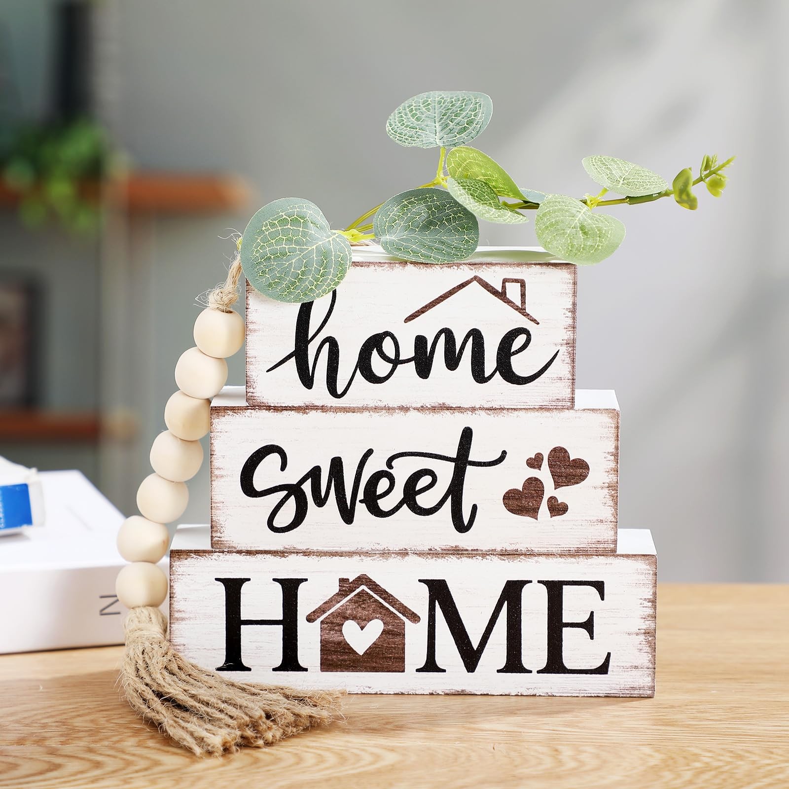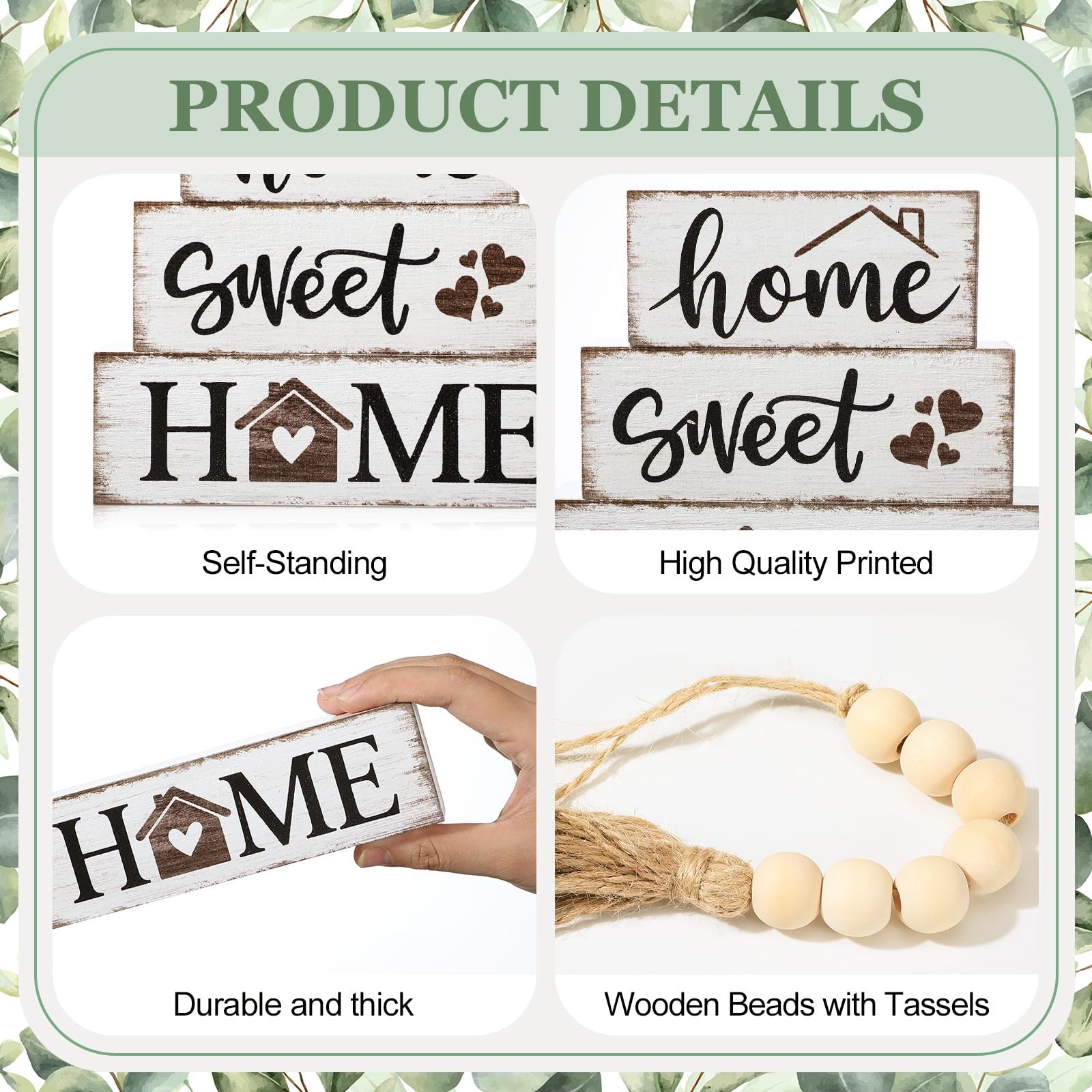 Features: This home decor set includes 3 "Sweet Home" wooden ornaments, a tasseled bead, and a eucalyptus leaf. The wooden pieces are sized at 3.94"x1.77"x1.38", 4.92"x1.77"x1.38", 5.91"x1.77"x1.38", leaf at 5.51", and bead at 11.02". Small, delicate, and in various sizes, they're great for flexible home decor. The bead is made of strong, non - wood, and the solid pine planks have a rustic antique look, durable for long - term use. This farmhouse - style decor adds warmth and charm to any home. It looks great on bookshelves, coffee tables, etc. In the living room, it can create an eye - catching display. It's also an ideal gift for new homeowners, family, or friends. Suitable for weddings, birthdays, housewarmings, and holidays, it's simple yet unique. Specifications: Material: wood Size: Wooden tabletop: approx. 3.94 x 1.77 x 1.38 inches, 4.92 x 1.77 x 1.38 inches, 5.91 x 1.77 x 1.38 inches Leave: approx. 5.51 inches Bead: approx. 11.02 inches Package includes: 5 x Home Decor Notes: Manual measurement, please allow slight errors on size. The color may exist a slight difference due to different screen displays. Modern Home Decor: you will receive a set of decorative wooden ornaments with 3 wooden ornaments that write "Sweet Home"; And also includes 1 wood bead tassel and 1 artificial eucalyptus leaves; These simple decor that blends perfectly with farmhouse, rustic, Bohemian decor to create a stylish ambiance for your bookshelf, coffee table, and fireplace Careful Dimensional Design: the three wooden tabletop pieces measure 3.94 "x 1.77" x 1.38 ", 4.92 "x 1.77" x 1.38 ", 5.91 "x 1.77" x 1.38 ", the eucalyptus leave measures 5.51 ", and the tasseled wooden bead measures 11.02 "(including twine and beads); These ornaments are small and delicate, and come in a variety of sizes, so you can decorate your home freely Quality Material: the bead string is made of non-and tasteless wood, , and does not deform to ensure durability and long-term use; Three unique wooden planks handmade from solid pine have a rustic antique effect, which can be used as a desk decoration alone or paired with wood bead fringe as a bedroom decoration, giving you a warm and rustic feeling Ideal Farmhouse Decoration: this rustic farmhouse wooden decor is a great choice to add warmth to a home, bringing rustic and artistic touches; Whether placed on a bookshelf, coffee table, mantel, bedside table, fireplace, or in the entrance, they are very beautiful; In the living room, it can create eye-catching display effect by mixing and matching books, vases and other ornaments, which is an exquisite accessory for decorating the room Meaningful Gift Ideas: pleas stop giving cookie-cutter gifts! Try these stylish display decor to surprise new homeowners, family, friends or partners; Whether it is a wedding, anniversary, , housewarming, or Christmas, Thanksgiving and other occasions, these decorative house decor are very suitable