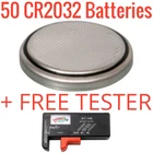 For this price you will get 50 CR2032 batteries plus a free battery tester. We ship every day from our family owned and operated warehouse in Bensalem, Pennsylvania. All of these batteries were recovered from returned and overstock electronics. We have a money back guarantee that the majority of the batteries will be at or near fully charged. Buy more and save big! We ship every day from our family owned and operated warehouse in Bensalem, PA. We cannot guarantee any particular brand however all batteries were recovered from popular electronic devices. This is not just an electronic waste solution, it is also an amazing deal for CR2032 batteries. The free tester is a great tool to have at home because you can test all household AA, AAA, D, C, 9v, and 3v button batteries. To test the CR2032 batteries simply place the battery with the + side facing the red slider and move the slider up until it stops. The indicator line will show if the battery is good or not. If it's green it's good, if it's yellow it's low, if it's red it's dead. We guarantee the vast majority of these batteries will be in the green. To test these CR2032 batteries you want to use the smaller display chart on the bottom that says "Button Bat". For all other batteries you will read the larger red, yellow, green display. You can test all of your batteries at home. Most of us have batteries laying around and now you will be able to test them to determine if they are still good. Note: Since these batteries are not in the original packaging they will arrive in between 2 strips of clear tape. This is the safest and most economical way to store and ship these batteries. The tape peels off clean with little to no residue left behind. These are not rechargeable batteries.