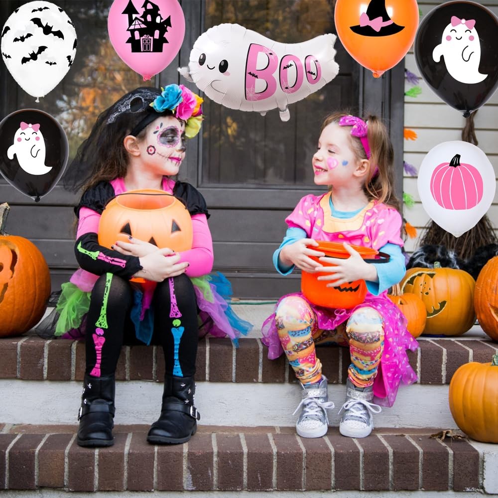 What you will get - 45pcs Latex Balloons includ Cute Ghost,Wizard hat,Black Bat,pink pumpkin ,haunted house 5 designs.(As the image shown).Measuring 12" in diameter.3pcs pink BOO foil balloons.1pcs Cute Ghost.Ribbon are included.nice for Halloween Little Boo Baby Shower, Halloween Girl Birthday Party Decor.creating an ideal Halloween atmosphere CHOKING HAZARD -- Children under 8 yrs. can choke or suffocate on uninflated or broken balloons. Adult supervision required. Keep uninflated balloons from children. Discard broken balloons at once.