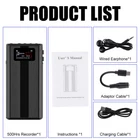 Product Description Product features: 1. 500-hour battery life: the built-in large-capacity battery of the recorder can record continuously for up to 500 hours after being fully charged, and it can be used for up to 180 days in standby, and it can play the recording continuously for 400 hours. The long battery life can avoid frequent charging and improve the use experience. 2. Upgrade screen display: product upgrade, increased operation screen display, real-time view of working status, simple menu and file browsing, and operation to delete files, etc. Compared with no screen model, the experience is greatly improved. 3. High-quality recording at 1536 kbps: The omni-directional array panoramic 6D surround stereo microphone is adopted to realize high-fidelity restoration of human voice, multiple optimization of environmental noise and mixed noise, adjustment of balanced sound quality, improvement of recording clarity, and adjustment of recording bit rate. 4. One-click recording and one-click saving: humanized toggle key design, one-click quick opening of recording, one-click quick saving of recording files, simple operation and no complicated learning process. 5. Support voice-activated recording: after the voice-activated recording mode is turned on, the recording starts when the sound is detected, and it automatically enters the standby state after the recording is completed, saving battery and storage space. 6. OTG connection of mobile phone: support OTG function to connect with mobile phone to transmit recording files, or import music files for use as MP3 music players. 7. Magnetic attraction: Built-in powerful magnet is attached to the surface of iron objects, which is suitable for various scenes. 8. File encryption function: you can set the power-on password. Without the password, you can't use it, you can't copy audio files, and protect important files from disclosure. 9. Built-in 32G memory, supporting 128G expansion: The product comes with 32G large-capacity memory, which can be used for recording for hundreds of hours at low bit rate. At the same time, it supports the expansion of 128G capacity memory card, large memory, and increases the recording time several times. Parameters: Material: metal Size: 100*49*18mm Product weight: 119g Functions: recording, playback, music playing, voice recording, etc. Display screen: 0.96 inch color screen Built-in storage: 32G Expandable storage: maximum support for 128G TF card (excluding). Duration: 500 hours of full-charge recording and 400 hours of playing. Standby time: 180 days Charging interface: Type-C Charging input: 5V 1A Recording folder: 999 files Recording format: WAV Recording sampling rate: 32/16/24/32/48KHz. Recording bit rate: WAV 256/512/768/1024/1536Kbps. Playback formats: MP3, WAV, WMA, APE, FLAC. Recording segmentation: 1GB saves a file by default. Distortion: > 70dB Microphone: Omni-directional capacitor MIC Headphone interface: Type-c stereo jack Working temperature: -10℃ ~ 40℃ OTG function: support Support for connecting computer systems: Windows XP & Vista/2K/Me/98 (Need to Install the Driver)/Mac OS 10/Windows 7/Windows 10. List of storage space, bit speed and time length: Product specifications 8 GB 16GB 32GB RecordingTime 256kbps About 72h About 144h About 288h 512kbps About 36h About 72h About 144h 768kbps About 24h About 48h About 96h 1024kbps About 18h About 36h About 72h 1536kbps About 12h About 24h About 48h Precautions: 1. Illegal use of products is prohibited. 2. Keep away from strong magnetic and electric fields. 3. Do not disassemble the product or replace the battery by yourself. Packing list: Recorder x1 USB charging line x1 Headphone x1 Headphone patch cord x1 Instruction x1 Payment Shipping Terms Returns Contact Us We accept PayPal only. If buyer want to delay the payment because of financial problem, please contact me by the ebay message within 3 days Payment via PayPal (PayPal accepts all major credits/debit cards and eCheque) ECheque payment will tak e 3-10 days to get clear, thus DELAYing the shipment. Handling time: 1 business day (Orders are not processed on weekends & holidays) Tracking information will be sent once item is shipped. Local pick-up is unavailable at the moment. For international shipping and shipping to Guam, Hawaii and Alaska, Please contact us before placing the order. Item is shipped to ebay address. Leaving correct address can minimize delay. For any issues with Defects, Return, Item Exchange request, please contact us first and send us a message first before opening any type of case or request. We devote ourselves making EVERY CUSTOMER in 100% Satisfactory and resolve any problem. We highly value and appreciate your business. Thank you. No returns will be accepted without an RMA number. Please contact us for the RMA number. Return is acceptable within 30 days of delivery. Return for replacement or money back is optional. Returned items must be in the brand new, unaltered and resalable condition. Seller is not responsible for any labor cost, expense in a dealer store, or damage due to wrong installation. Return is accepted within 14 days after the buyer's receiving the item. (Excluding contrived damagement or misusage).100% money-back Guaranteed! All product will be tested in 100% before delivery.If the item is defected by the processing of postage,Buyer has up to 14 days from date of receipt for exchange of a new one.All shipping charges for returned products are to be paid by the buyer,Please contact us for the return address All messages will be answered within 24 office hours. Please contact us either by clicking "contact seller" in the "purchase history" section or simply click "ask a question" at the bottom of this page. If you are unsatisfied with our item or service, please contact us before leaving any feedback. We are committed to resolve all issues in a friendly and satisfactory manner. We always reply to messages within 2 business days (off-duty at weekend). If yo