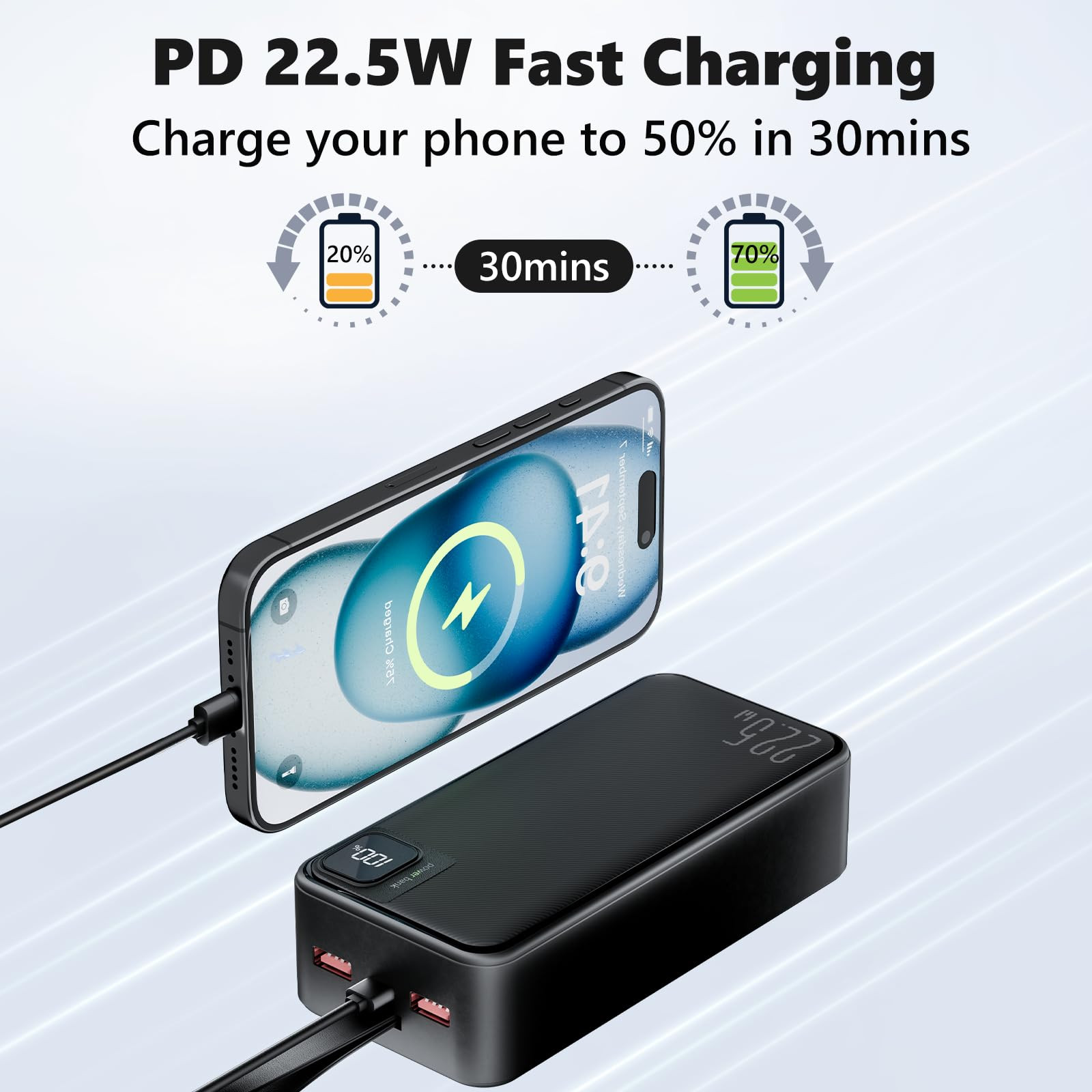 Portable Charger Bank 50000mAh:charging bank can provide multiple charges for your cell phone. The powerbank is equipped with a handheld lanyard, which makes it more convenient to carry, suitable for camping, vacation, travel and other outdoor activities, it is a great travel power bank 22.5W Fast Charging Power Bank:Type C fast charger powerbank features an upgraded PD 22.5W output and the latest QC4.0 fast charging technology, which can quickly fully charge your electronic devices Output & Input:External battery power bank has two USB output ports as well as 1 Type-C port (input and output), which can charge up to 3 devices at the same time. (Note: We recommend using 18W/20W output devices to charge with this Power Bank, it takes about 10 hours to be fully charged. It is not recommended to use 5V/1A device to charge, it will take about 15 hours or more to be fully charged) Wide Compatibility:This portable phone charger battery pack with LED display shows the percentage of battery remaining, simplifying power management. It is compatible with a wide range of electronic devices, including many models of cell phones, tablets, smart watches,mini speakers, bluetooth headsets, handheld game consoles, cameras, and other USB electronic devices Safety Protection:Multiple protection systems can fully protect your device and keep your power bank and phone healthy,including short circuit protection,overcharge protection, overvoltage protection,overcurrent protection, etc