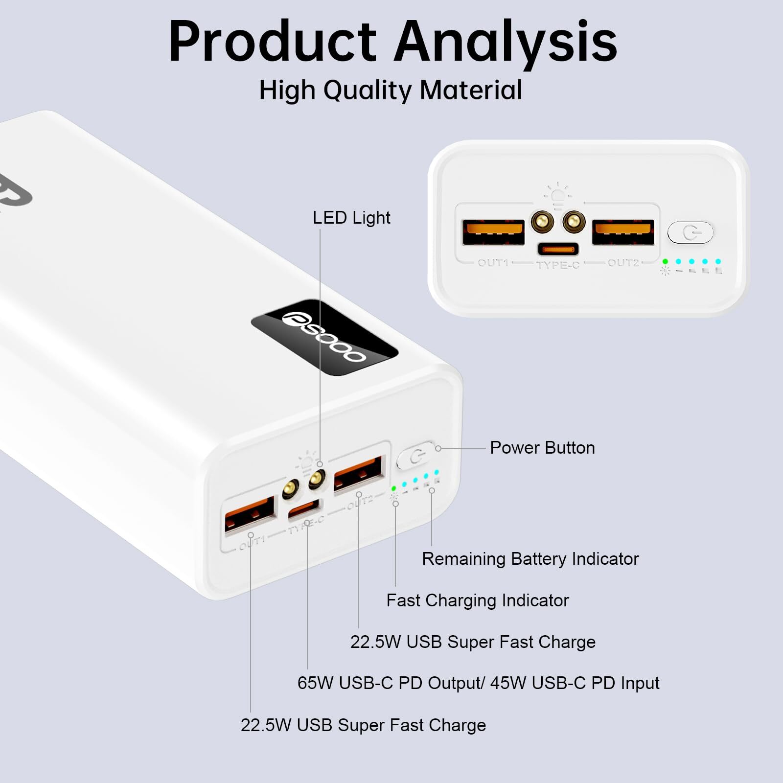 This power bank is a game-changer for travelers and busy professionals! The massive 50000mAh capacity keeps my devices charged for days, and the 65W fast charging means no waiting around. I love that it works with my laptop, phone, and tablet all at once—no more carrying multiple chargers. The LED indicator is super handy, and its compact size makes it easy to toss in my bag. Perfect for camping trips or long flights when outlets are scarce. Highly recommend for anyone who needs reliable, fast charging on the go!