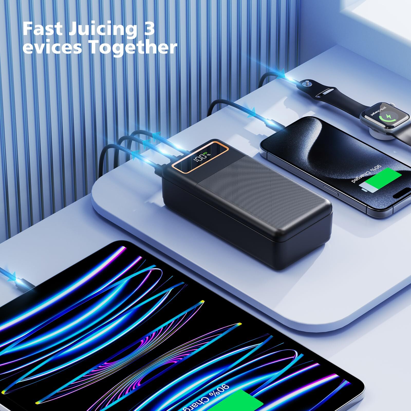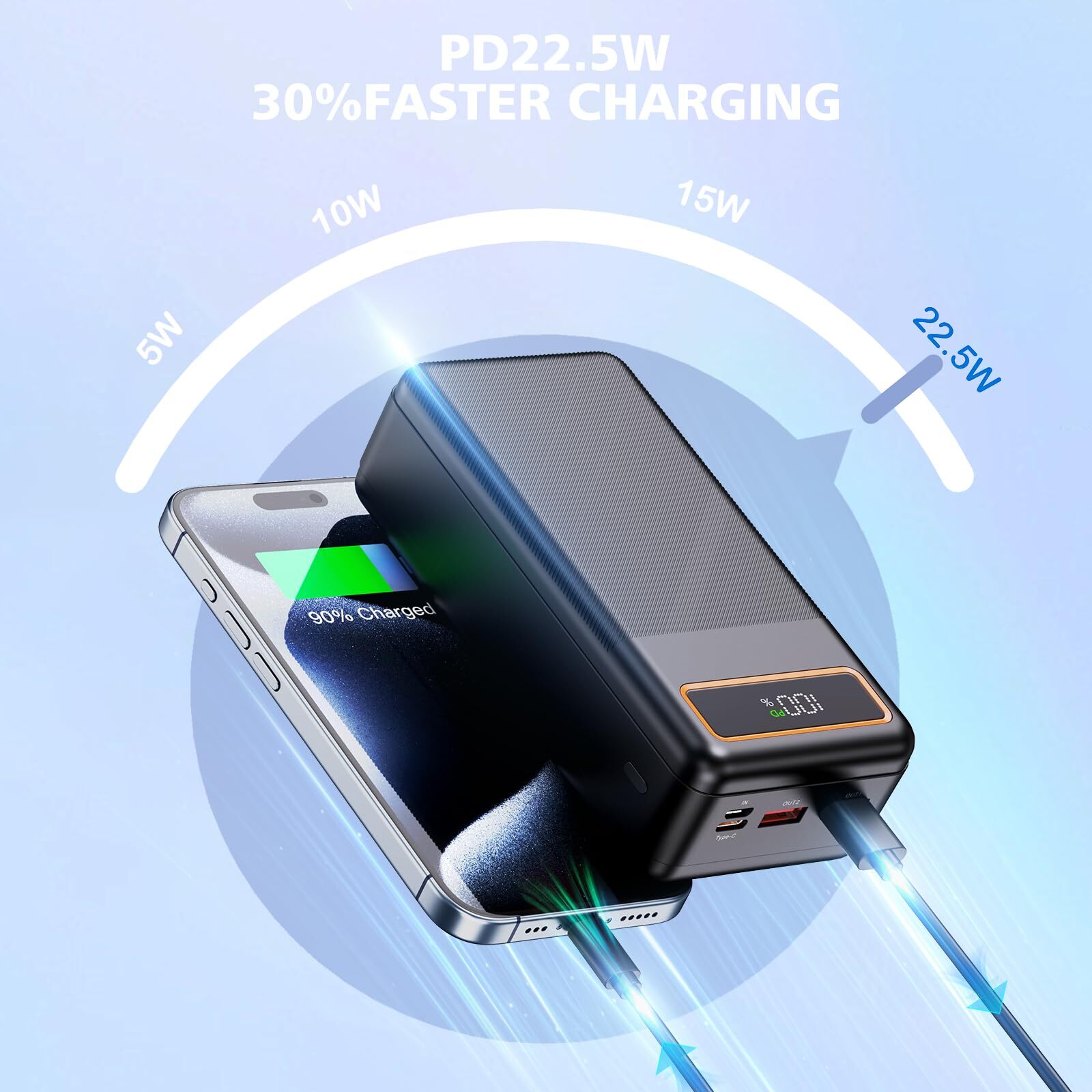 Always Charged, Always Ready to Use - Watching your phone or tablet steadily run out of juice when you're nowhere near a power outlet is stressful. Standard Phone Powerbank are too small capacity and often run out of juice, Portable Phone Charger is that you will not almost forget to have the Cell Phone Power Bank 50000mah with you. Power For Days, Companion while on the go - The most exciting time of the year is always when you are traveling somewhere, and forgetting a Portable Charger for your phone could be considered a mishap. You don’t want your phone dying when you are just about to make photoes. Despite cute design, the Portable Power Bank has a 50,000mAh battery that’s enough to charge your phone and earbuds 8-10 times. The PD Power Bank need a spot in your baggage. Our's Confidence, Ultra Quick Charging 3.0 - Of course, you would not want to charge at a snail’s space. 22.5W Power Delivery 4.0 USB A port plus QC 3.0 USB C output are powerful enough to charge 4 devices simultaneously to revolutionize your experience of speed, 4.5X faster than regular 1A chargers, you can fully charge your phone in less than 30 minutes. What's more the Super Fast Portable Iphone Charger Power Bank has a good balance between capacity and bulk. You Know, Portable - Are you carrying a bag or do you want something to slip in your back pocket? As our electronics get smaller and slimmer, a Portable Charger Power Bank is "life-saving" in many ways. Heading off the grid for a week but have to stay charged? Need to keep your laptop going all day? We’ve got you covered. The Cell Phone Portable Power Bank easily fits in any backpack, purse, or even some pockets. Ultimate Safety Protection - We were here with a super-sleek Phone Battery Pack that perfect for traveling. Loaded with safety features, this USB C Type Charger Fast Charge comes with over-current, overcharging, and overheating protection. The freedom and safety you will experience from our Portable Compact Powerful Charger. What's in the box: You receive the power unit, a USB to USB C cord, and instructions.