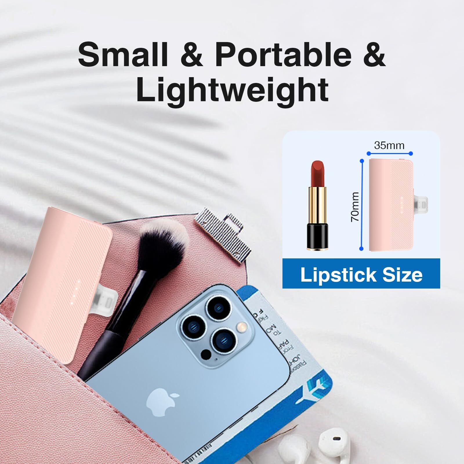 ➤【5000mAh Portable Charger】 The portable iphone charger has real 5000 mAh battery,keep your phone charged all day long. The fast power bank charger is as compact as a lipstick that easily slips into your pocket, purse, or bag to be ready to accompany you on your anytime. It an ideal charging companion for game、travel and outdoor activities.It's the best portable charger! ➤【Safe and Convenient】The small portable charger power bank can be taken on airplanes,It has safe battery certifications, such as UL,CE,FCC;The portable charger power bank can be charged more than 500 times, please use it with confidence. It's about the size of a car key,weighs 70g, dimensions is only 70*35*20mm (2.7''x1.3''x0.78''), you can charge while playing or talking. ➤【Fast Charging】 The small portable Charger recharge the cell phone charger to 50% power within 30 minutes with Apple cable and adapter, which can charge your iPhone 13 from 0% to 50% without using the phone. Keep your phone charged all day and the phone battery is very healthy. ➤ 【Important Notice】The portable charger for iPhone 6/7/8/8 Plus/SE/11/XR/12/12 Pro Max/13/13 Pro Max/14/14 Pro Max/14 Plus series and iPad so on. ★Not support For iPhone15 Series .Real 5000mAh Powerful Fast Charging, Perfectly extend your phone service life by 2-3 times.Easy operation:press its sides power button 1 second to start and long press its sides power button 2 seconds to stop charging.★If your phone case thickness more than 5mm,you'd better remove your phone case to charge your iPhone. ➤ 【What You Will Get】1* Small Portable Charger , 1*Charge Cable, 1*User Manual. ,1*Flannel Bag.We promise 12 months worry-free and lifetime customer service to ensure long-lasting enjoyment of your purchase.★Notice: Please fully charge the power bank after using up the power at the first time to protect the battery and extend the battery life of the power bank.