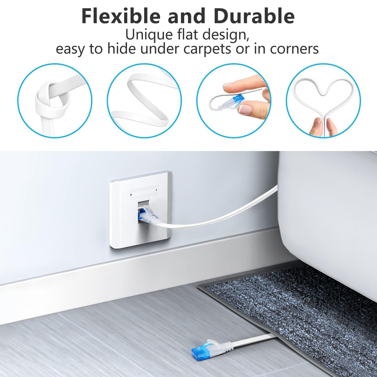 Size:50 Feet | Color:White Ultra Slim and Flat Profile At a thickness of just 1.5mm, the Cat 6 Flat Network Ethernet cables are perfectly camouflaged underneath carpets, walls, or even behind furniture. This specially designed flat cable makes it easy to fit between spaces, improving the look of your home or office. Built for Speed and Reliable Connectivity Our Cat6 Ethernet cable is capable of transmitting data at speeds of up to 1.0 Gbps over 100m of cable with increased transmission frequencies of up to 250 MHz. It is constructed with 4 twisted pairs (UTP) wires, with RJ45 connectors at both ends of the cable. Compared to the Cat 5e network Ethernet cable, the more stringent specifications and improved quality in twisting of the wires provides better protection from crosstalk, noise, and interference that can upgrade the signal quality. Range of Application: Intended to wired home and office networks. RJ45 connectors provides universal connectivity for computers Laptop,such as PCs, routers, computer servers, printers and more. Specifications: - Cable Type: CAT6 4-Pair UTP - Connector Type: RJ45 - Outside Diameter: 6.0 * 1.5 mm (0.23 * 0.06 inch) - Contact Plating: 50 Micron Gold Plated - Cable Performance: Up to 250 MHz ◆Upgraded Structure: Constructed with Gold-plated RJ45 connectors to provide shielding, reduce interference and crosstalk, and make the network faster and more stable. Also, it is anti-oxidation, resistant to multiple insertions, more durable than ordinary crystal heads, lower resistance, better contact and conduction. ◆FLAT DESIGN & FREE CLIPS: Ultra-thin technology helps avoid tangled cords and saves space, can't even feel or see the cable run under a rug or carpet and easier to line up against the wall. Bundled with cable clips for free. ◆HIGH SPEED: Up to 1.0 Gbps transmission speed with increased frequencies of up to 250 MHz. ◆UTP(Unshielded Twisted Pair) patch cable with gold-plated RJ45 Connectors, ensure minimal noise and interference. ◆COMPATIBILITY: Ensure universal connectivity, supports all devices with RJ45 Jacks. Provides universal connectivity for PC, Computer Servers, Switch Boxes, Routers, Modems.