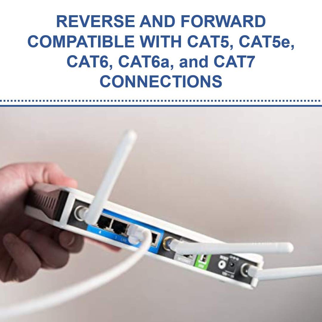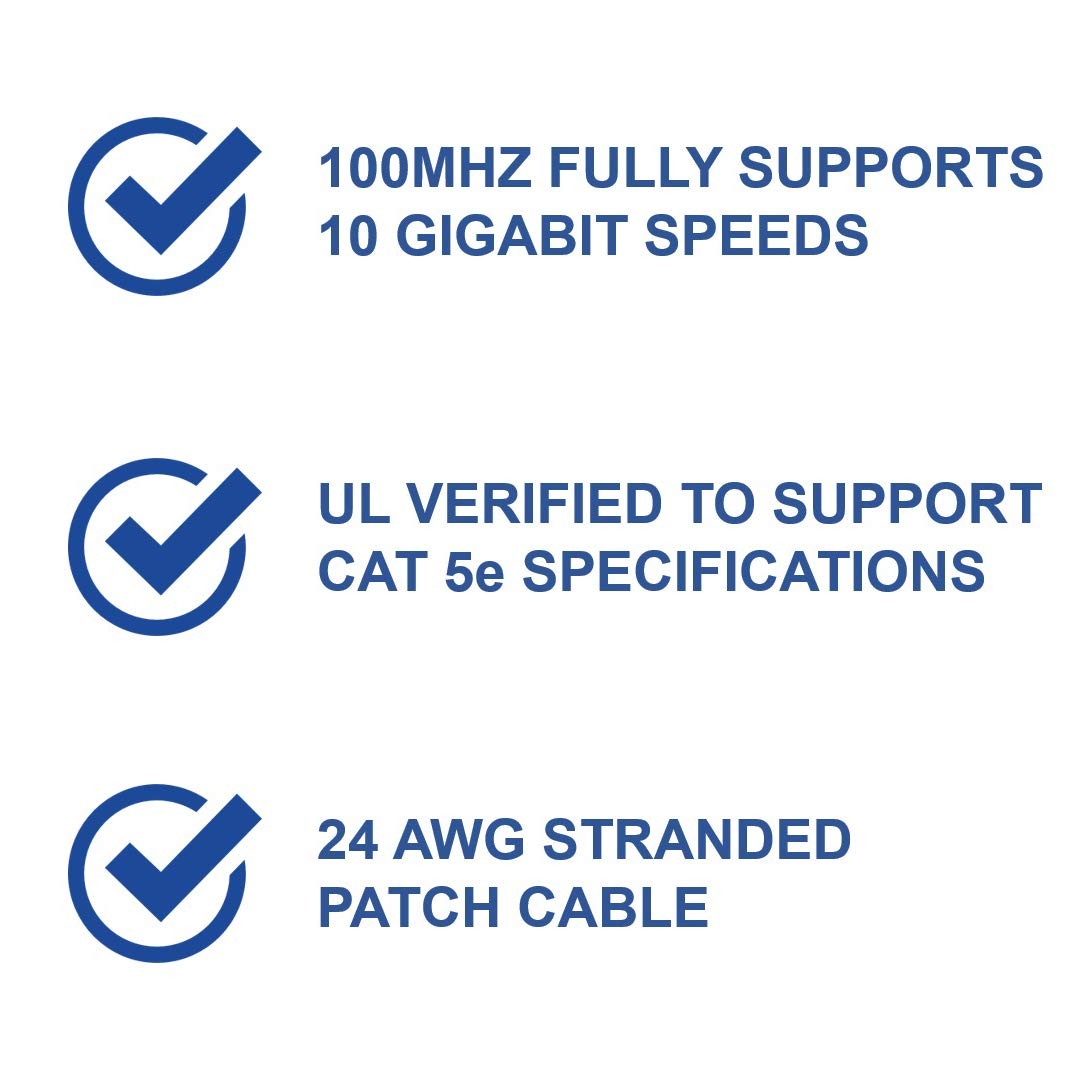HIGH SPEED DATA CABLE: CAT 5e Patch Cable can support up to 10 Gigabits per second. Backwards compatible with any existing fast ethernet and gigabit ethernet. The RJ45 connector used for this cable fits perfectly in Cat5e ports. CERTIFIED: UL-verified to support the Cat 5e performance patch cable specification. Snagless overmold prevents insertion tab from catching on other cables CONSTRUCTION: Pair Count: 4, Termination: Phosphor Bronze IDC blades, contact area plated with 50 micro-inches of hard gold over 100 micro-inches of Nickel, Material: Fire-retardant PVC compounds (cord) SIZES: Cat 5e Patch Cable is available in 1-foot, 2-foot, 3-foot, 7-foot, 14-foot, 25-foot and 50-foot. HIGH QUALITY PATCH CABLE: More conductor twister per inch (TPI) and foam insulators for clear signal and less crosstalk. Best for bandwidth hogs like game consoles, Roku, Apple TV, and other stream-heavy units.