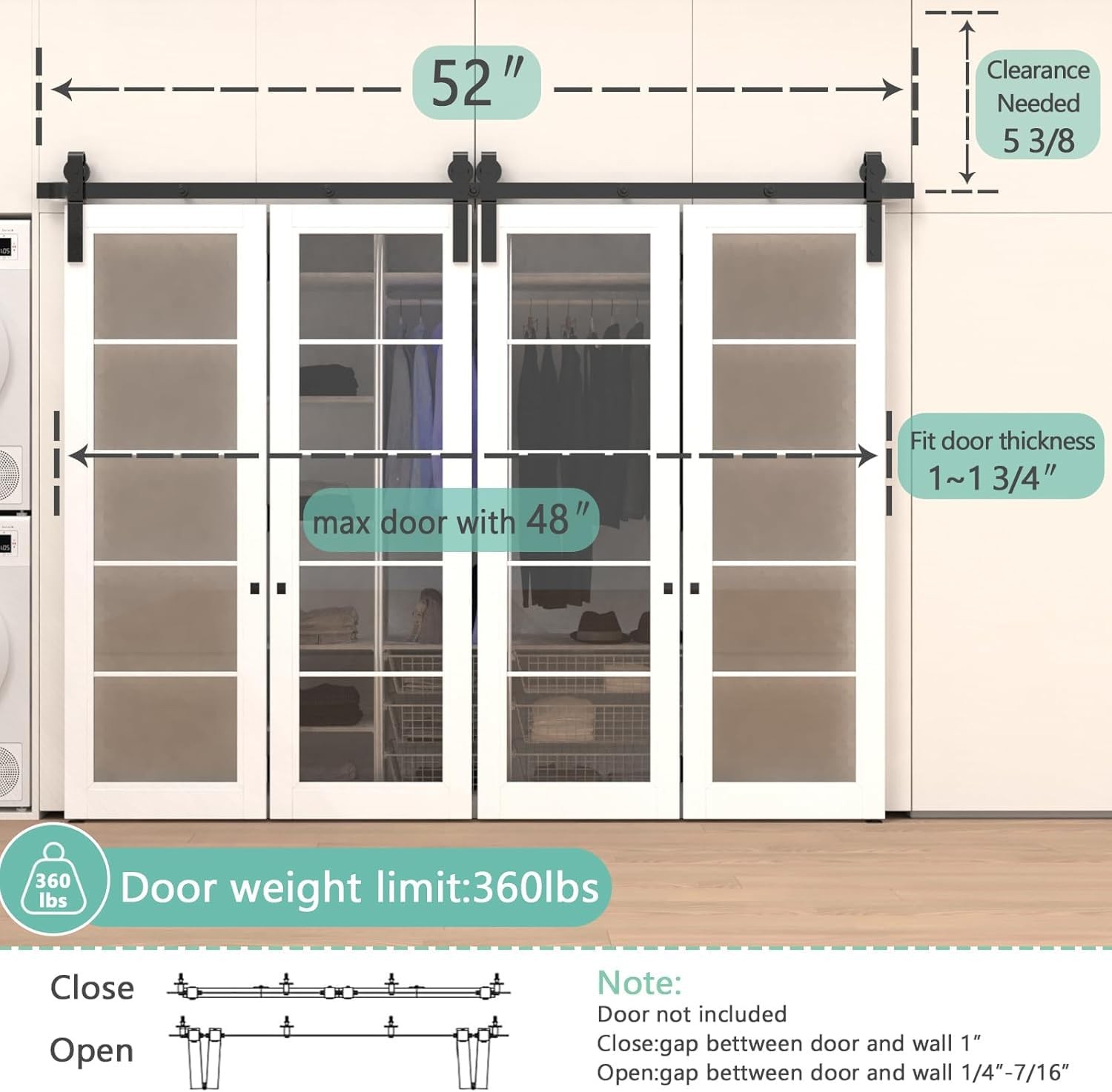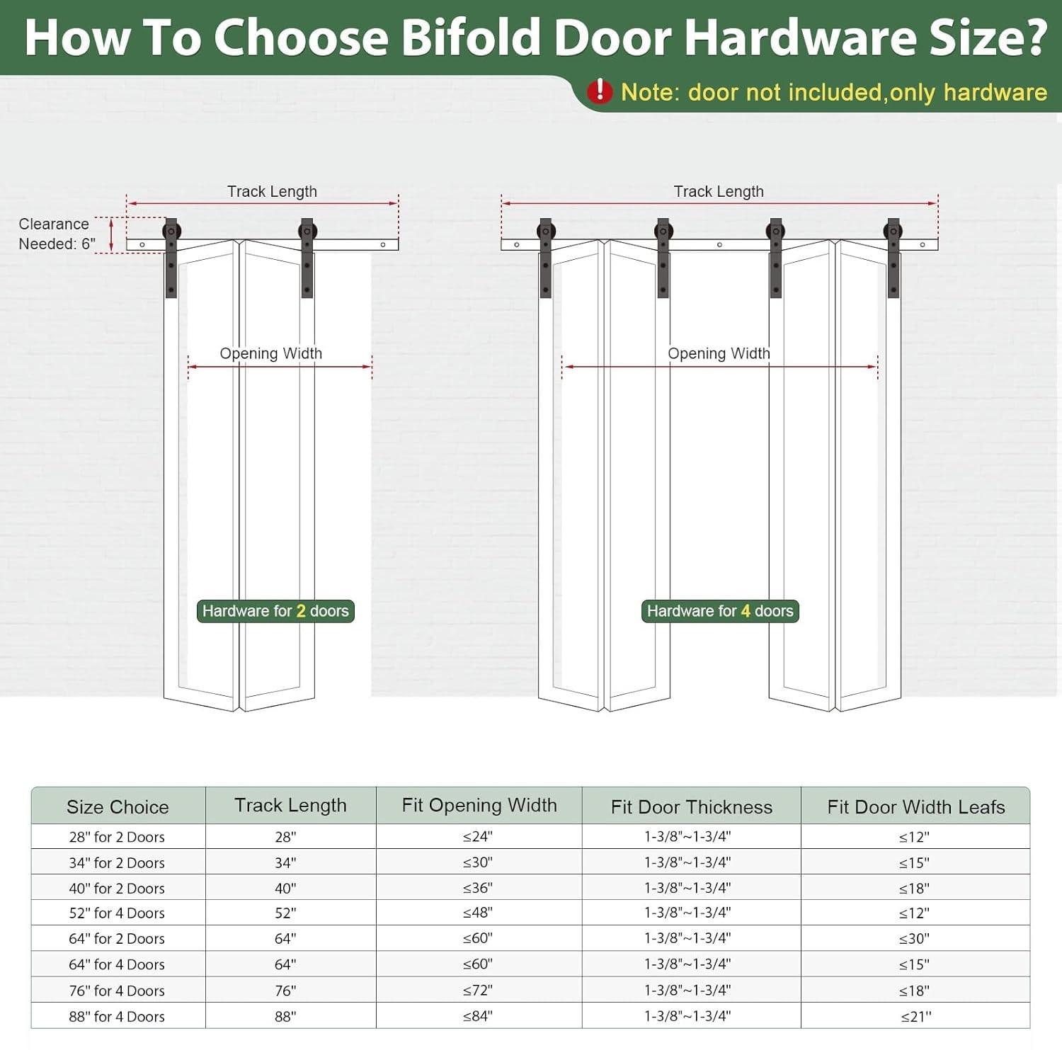 Bi-Folding Sliding Barn Door Hardware Kit 【Superior Quality】Made of black heavy-duty steel, it has the benefits of sturdy, durable, wear-resistant and corrosion-resiatant. The roller is a combination of high-quality bearings and nylon wheels, matched with 6mm thick track to improve the bearing capacity of the product. And it has undergone 120,000 tests to ensure quiet and smooth sliding. 【Unique Design】Different from the traditional hardware kit on the market, the folding door kit can greatly save you space. And the scope of application is wide, can be used in a variety of living occasions, such as living room, dining room, study, etc. 【Package List】Packing: 1x 4.3FT track, 2x roller, 2x roller rotating bracket, 1x roller fixator, 3x spacer, 3x hinge, 1x floor guide, 1x Sealing Strip. Fit Door Thickness: 1-3/8"~1-3/4"(35mm~45mm). [Friendly reminder: DOOR NOT INCLUDED] 【Easy to Install】The total width of the door panel plus 4" is the length of the track. We provide detailed Bi-Fold sliding barn door kit instructions with pictures and text, which can be intuitively installed by yourselves, saving the time and cost of finding an installation team for you. 【Easy Install & 24 Hours Stand By】We have a professional customer service team 24 hours online to help you. If there is any problem about our products, please let us know and we will try our best to solve your problem.