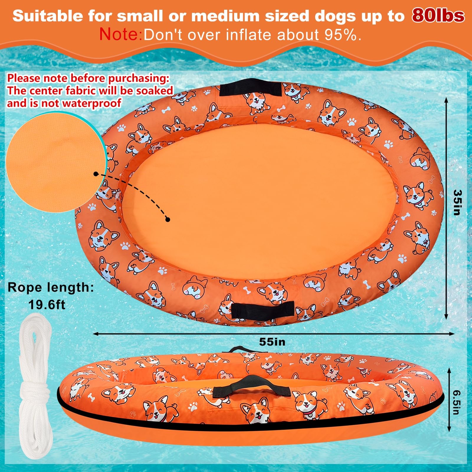 Specifications: Material: puncture-resistant PVC material Main color: orange Size: Approx. 55x35x5 inches,dogs floats for pool load under 80 pounds (36.3 kg) Package includes: 1 x dogs pool floats,1 x 19.6ft rope Warm notes : Avoid sharp objects touching the product Please tighten the valve before inflating to prevent air-leakage Pet-friendly materials: Made of pet-friendly fabric with a dog-related print pattern, the dog raft is friendly to all paws and can withstand your pet's playful enthusiasm without getting punctured Dog swim raft size: The dog pool float measures about 55'' x 35'' x 5'' and is suitable for small, medium, and large dogs and is recommended for dogs weighing up to 80 lbs (36.3 kg) Easy to use and store: Connect the dog float mat to an air pump (not included, purchased in advance), inflate to around 95% (do not over-inflate), and then close the air valve to prevent air leakage; While not in use, it can be deflated and folded up for easy storage without taking up space Enhance pet enjoyment: While dogs using this floating mat in the pool or by the river, they will feel thrilled and novel, fully enjoying the time with their owners and enhancing interaction and emotional communication between each other Perfect gift for dog owners: This inflatable dog swimming pool raft is designed for small and medium-sized dogs that enjoy lying on comfortable floating mats and playing in the water. It is the preferred gift for dog owners and great for outdoor activities or travel, let the puppy enjoy the cool summer water time with you