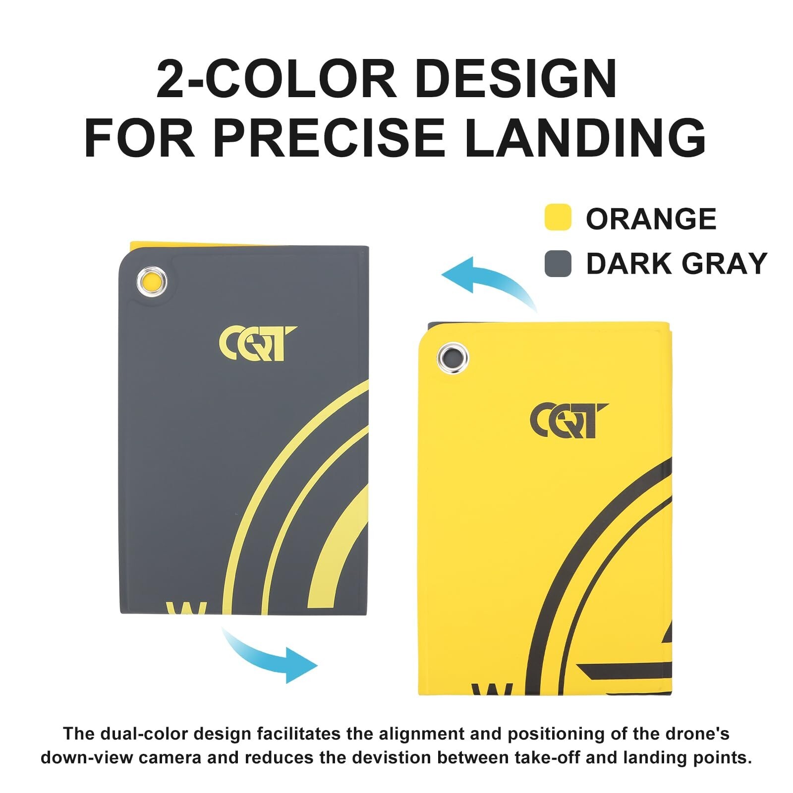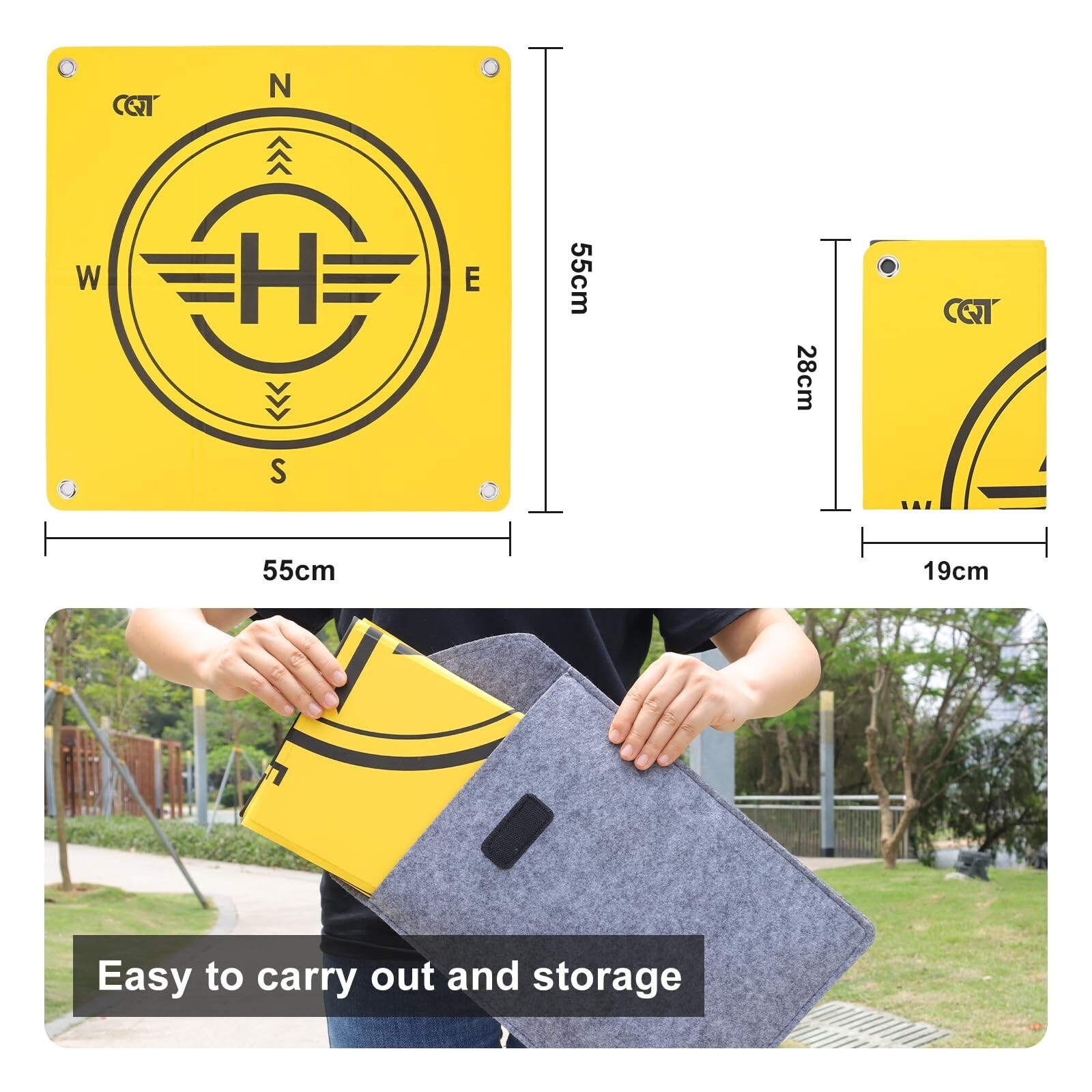 Drone Landing Pad 21.65inch(55cm) Double-Sided Waterproof Fast-Fold Helipad for DJI Mini 4/3 Pro,Mavic Mini 2 SE,Avata 2, Air 3,Mavic Air 2 2S,Mavic 2 Pro,Zoom,Mavic 3,Phantom (55CM Yellow+Dark Gray) Product Details Style: 55CM Yellow+Dark Gray Brand: CQT MPN: Drone Landing Pad UPC: Does not apply EAN: Does not apply Brand: CQT Model Name: Drone Landing Pad Age Range (Description): Adult Color: Yellow and Black Included Components: 1x Landing pad, 4x Ground nails, 1x Storage bag Item Weight: 720 Grams Control Type: Remote Control Material: PU, PVC Are Batteries Included: No Remote Control Included?: No Brand: CQT Model Name: Drone Landing Pad Age Range (Description): Adult Color: Yellow and Black Included Components: 1x Landing pad, 4x Ground nails, 1x Storage bag Item Weight: 720 Grams Control Type: Remote Control Material: PU, PVC Are Batteries Included: No Remote Control Included?: No Rechargeable Battery Included: No Product Dimensions: 21.65"L x 21.65"W x 21.65"H Manufacturer: CQT Item Weight: 1.59 pounds Country of Origin: China Manufacturer recommended age: 14 years and up Universal Drone Landing Pad21.65in Foldable drone landing pad can provide the best take-off and landing surface in any environment for DJI Avata 2/ Mavic 3 Pro/Mini 3 Pro/ DJI Mavic Mini 2/ Air 2S/ FPV Drone/ Mavic 2 Pro/Zoom/ Mavic Pro/ Mavic Air/ Spark/ others drones. Yellow & Dark Gray DesignDouble-sided color design. Better get position than black; Easy to fold and store quickly ; With a storage bag for easy storage and transport outdoors. Function & Portable21.65in x 21.65in (55x55cm) size, easy to fold allows you to bring it anywhere. Help your drone find home position easy, strong enough to use on sand , overgrown grass, uneven dirt road or in the snow. Premium Waterproof MaterialCQT Landing Pad is made of High-quality Waterproof PU PVC material with lightweight and stain-resistant. Washable