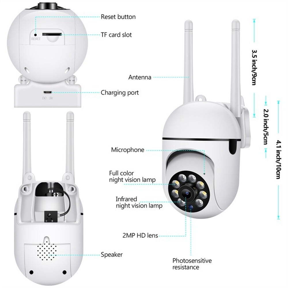 2MP Wireless Security Camera, Pan Tilt Zoom IP Camera Dome Motion, Night Vision, Siren Alarm Note: Since the 5G signal coverage is relatively short, if the distance between your WIFI and the camera is long (the straight line distance exceeds 10M), it is recommended that you install a signal booster, otherwise the WIFI signal connection may be unstable. Product details: 2MP HD image and Full color night vision. Smart motion detection and Instant Alert. Pan Tilt Zoom support 355°horizontal and 90°vertical rotation. Way audio and night Vision Modes. The APP supports remote playback,video sharing, cloud disk storage and TF card.(does not include TF card) Product Parameters: 1.Resolution:2.0MP 2.Sensor Resolution:1/2.9″SC2006. 3.Lens:4MM. 4.Pan-tilt:Rotates Horizontal:350° Vertical:90°. 5.LED quantity:4pcs white LED + 4pcs Infrared LED. 6.Network connection:WIFI, AP Hotspot. 7.Night vision:IR-CUT switch Automatic,about 5-8meters (It varies from environment). 8.Audio:Built-in microphone and speaker, support two-way audio and real-time transmission,ADPCM audio compression standard, self-adapt to code stream. 9.Alarm:Motion detection and Alarm video push . 10.Cloud storage;TF Card(Max 128G and does not include TF card) Product Package: 1x camera 1x package 1x manual 1x adapter 2MP HD image and Full color night vision - 2MP resolution camera,HD image, let you see the every details of the monitoring clearly. wireless camera with bright built-in floodlights, even in extremely dark environments. Safer for Recording & Multi-user Access - You could store surveillance footage in the micro sd card(not included). This home security camera allows you create several guest accounts and share the videos instantly with your family and friends. Pan Tilt Zoom - 355°horizontal and 90°vertical rotation range, Just need one wifi camera to cover all corners you want to monitor. You can remotely access the entire room during the daytime or at night with your phone/mobile device. 2 Way audio & Night Vision Modes - You can talk remotely with outside visitors clearly and fluently via the smartphone app.Infrared night vision function can protect your home security 24 hours a day. Smart motion detection - Outdoor Security Camera adopted motion sensors to detect motion and sends alerts to your phone,reduce false alarms caused by rain, insects, fallen leaves, etc.
