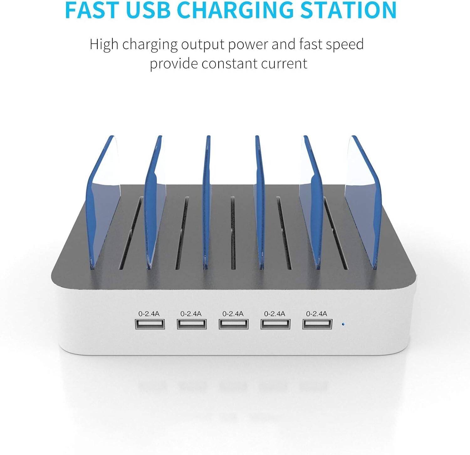 Charging Station for Multiple Devices, 5 Port Multi USB Charger Station with Power Switch Designed for iPhone iPad Cell Phone Tablets (White, 6 Mixed Short Cables Included) About this item Universal Compatibility- The charging station comes with 6 cables that are designed for your lphone 14, 14Pro, 13, 13Pro, 12, 11, 11Pro, XS, XS Max, XR, X, SE, 8, 8 Plus, 7, 7 Plus, Ipads, Samsung Galaxy S10, S10Plus, S9, S8, tablets and other electronics. USB charging station with 3 ios cables, 2 Micro USB cables, 1 usb c cable. Neat and Organized-The 5 port USB charging station can charge up to 5 devices in one place simultaneously. Phone charging station keeps your desktop organized and clean, no cluttered cables, without using up all your USB wall charger outlets. Fast and Smart-This charging station for multiple devices will charge your smartphones, tablets up to 80% than other USB charger station with 2.0A or less. Our multiple charging station will automatically detect your devices and adjusts voltage for minimal charging time. Multi Protection-Every port of the charging stations will offer exactly the charging current required to match your devices needs, keeping your phones safe. The phone charging station features a switch giving you a quick visual indication that it is powered on. Removable dividers can hold your large tablets even with thick case. Love by Families-This portable USB charger station is a great gift for your dads, moms, mother-in-law, father-in-law, sisters, brothers, coworker, girlfriend, boyfriend. Charging station can be used for your home, kitchen counter, desktop, nightstand, office, school, hotel, travelling.
