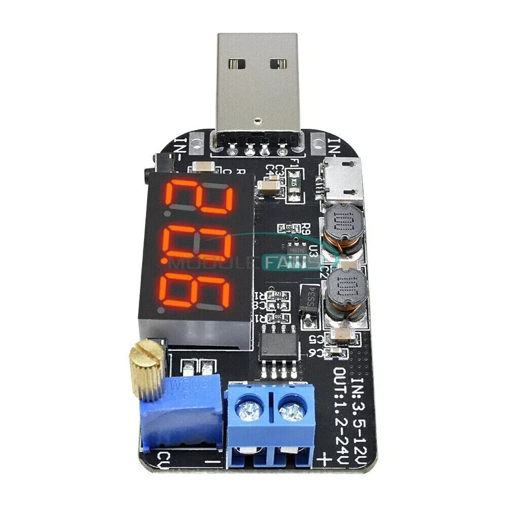Description: It is a DC adjustable constant voltage constant current step up/down power supply module with LED digital tube display.Display output voltage, output current and output power.Adjustable output voltage and current.Set output current to meet the require.It can be used as ordinary buck power supply module, charger and LED constant current driver.Simple and efficient, practical. Features: Support short circuit protection/anti-backflow protection/constant voltage constant current adjust;4-Bit digital tube display;4-Bit digital tube display;Three input power modes;Support over-current protection/over-current protection/over-voltage protection/over power protection/over temperature protection/charging mode;High resolution;Multiple parameters can be displayed in turn Parameters: Product Name:USB 2A Step Up/Down Power Supply Module Input Voltage for Pads:DC 4.0V-13.0V Input Voltage for USB:DC 5.0V Output Voltage:DC 0.5V-30.0V Output Current:2A Output Power:15W(Max) Voltage Display Precision:+/-0.1V Voltage Display Resolution:0.1V Current Display Range:0~2.2A Current Display Precision:+/-0.05A Voltage Display Resolution:0.001A Power Display Range:0~99.99Ah Capacity Precision:0.00W~15.0W Protection Temperature Threshold:100℃ Conversion efficiency:95% Working current:30mA Working Temperature range:-20℃~85℃ Working Humidity Range:0%-95%RH Button/Potentiometer/LED introduction: 1.Long press means need keep press for more than 3second. 2.Left Button:Long press is used to set default ON or OFF for next re-power at display mode or as ‘Minus -’ in calibration mode.Short press to select whether output voltage at display mode. 3.Right Button:Long press is used to enter or exit calibration setup mode at display mode or as ‘Plus +’ in calibration mode.Short press to switch display output voltage,output current, output power or display these parameters in turn. 4.CV Potentiometer:Adjust output voltage.Increase the output voltage when rotating clockwise.Please rotate the CV potentiometer 10 turns in counterclockwise if the output voltage cannot be adjusted. 5.CC Potentiometer:Adjust output current.Increase the output current when rotating clockwise.Note:It is not keeping a fixed output current.When the load current reaches the set current value, the module starts to fix output this current value. 6.ON LED:Green Output indicator.It will turn ON when there is a output at output terminal.Otherwise it is OFF. 7.CC LED:Red Constant current output indicator.It enters the constant current state when the load current reaches the set current and CC constant current indicator turns ON. Input terminal:There are three input methods: Method 1:Standard Type A USB Male .It just can input DC 5V. .Method 2:Micro USB Female.It just can input DC 5V. Method 3:IN+ and IN- pads.It can input DC 4.0V-13.0V. It can only choose one input method. Output terminal: KF-301-2P 5.08mm blue terminal. It can output DC 0.5V-30.0V. Protective function: Over-Voltage Protection:Module will turn OFF output voltage automatically if output voltage is more then 30.5V. Over-Current Protection:Module will turn OFF output automatically if output current is more then 2A. Over-Power Protection:Module will turn OFF output automatically if output power is more then 15W.It will display ‘-OP-’.User need reduce load power and then press ‘ON/OFF’ button. Current error:Large display error when output current is less than 0.05A.It can not display output current if current is 10~40mA. Over Temperature Protection:Module will turn OFF output automatically if termperature is more then 100℃.It will display ‘-OT-’.User need reduce load power and then press ‘ON/OFF’ button. Note: 1.It is a DC power module,So it can not connect to AC power. 2.Please don’t short output. 3.’IN-’ and ‘OUT-’ Package Included: 1PCS*DC 5V to 1V 12V 24V 15W USB Adjustable Step Up Down Voltage Power Supply Module