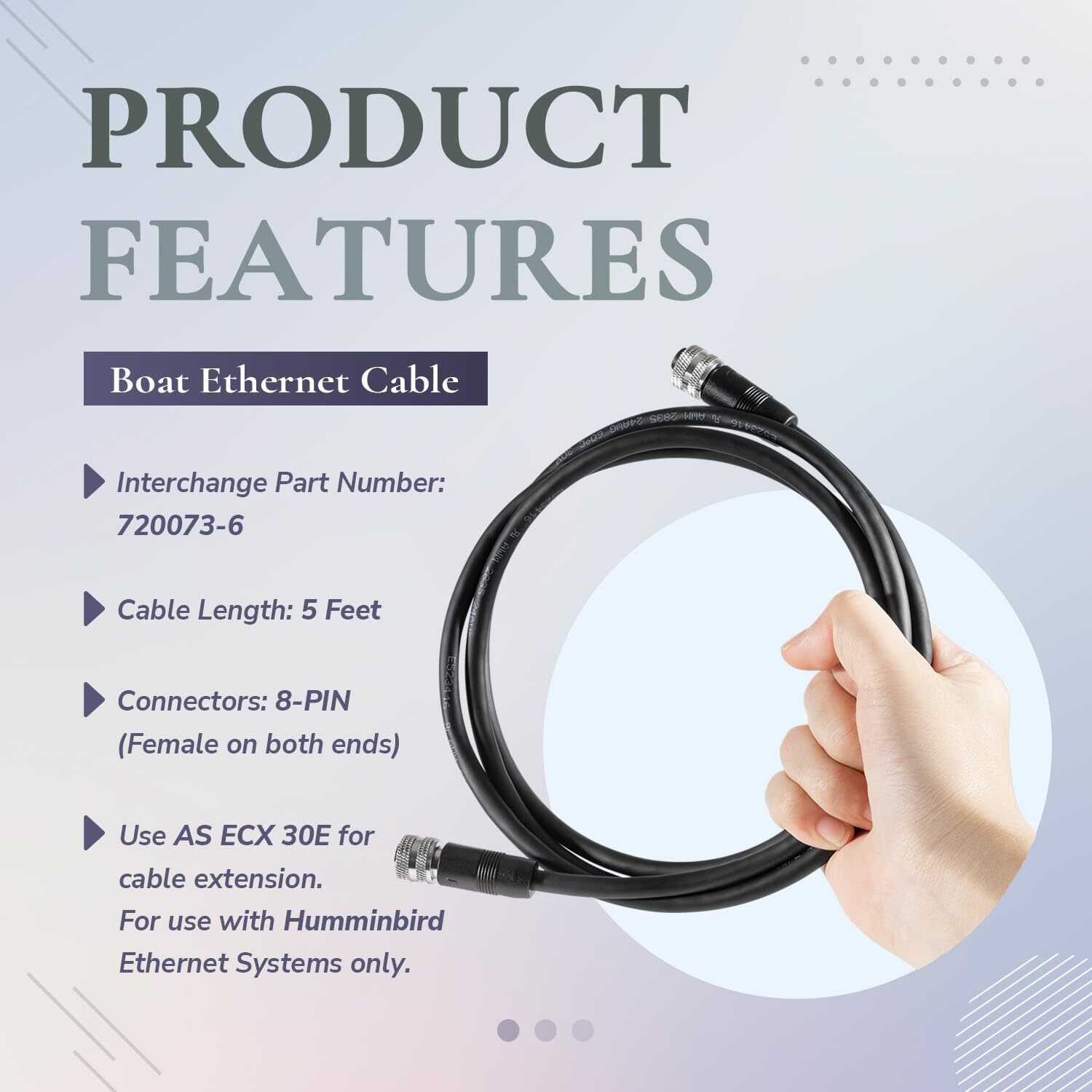✨ 720073-6 5 Foot Ethernet Cable, Replace for Humminbird AS EC 5E 5ft. Ethernet Cord, Fit for SOLIX, Helix G2N, Helix G1, Onix, ION, 1100, 900, 800, 700 Series ✨ 🔍 Product Overview 🔥 Key Features 【EXTENSIVE APPLICATION】This 720073-6 Ethernet Cable is compatible with SOLIX Series All Models, HELIX G2N Series All Models, HELIX G1 Series (All 9, 10, 12 Models), ONIX Series (10ci, 10ci SI, 8ci, ONIXci SI), ION Series (ION 10, ION 12), 1100 Series (1158c, 1158c DI, 1159ci HD, 1159ci HD DI, 1159ci HD XD, 1198c SI, 1199ci HD SI, 1199ci HD SI Combo KVD), 900 Series (958c, 958c DI, 958c HD, 958c HD DI, 959ci HD, 959ci HD DI, 959ci HD XD, 998c HD SI, 998c SI, 999ci HD, 999ci HD Combo KVD), 800 Series (858c, 858c DI, 858c HD, 858c HD DI, 859ci HD, 859ci HD DI, 859ci HD XD, 898c HD SI, 859c SI, 899ci HD), 700 Series (778c HD, 788ci HD, 788ci HD DI, 798ci HD SI). 【PRODUCT FEATURES】Interchange Part Number: 720073-6. Cable Length: 5 feet. Connectors: 8-PIN (Female on both ends). Use AS ECX 30E for cable extension. For use with Humminbird Ethernet Systems only. 【STRONG FUNCTION】The Ethernet cable is a 5-foot cable that connects two Ethernet-enabled devices or connects the Humminbird control head to an accessory 5-port Ethernet switch (AS ETH 5PXG) as part of a multi-device Ethernet network. 【SUPERIOR MATERIAL】The 720073-6 Ethernet Cable is made of highly durable Rubber, Copper, Plastic, and Aluminum Alloy. Rigorously tested, compact, and sturdy. Meet OEM manufacturing requirements. High-quality materials allow it to be used for a long time. 【100% Satisfaction Guarantee】We are committed to providing excellent products and the best service for our customers. If you are not satisfied with the product, you can simply return it. We support a 30-day on return and a 12-month . 📦 Shipping Information We ship to the address provided on eBay. Please verify your address before purchasing. Orders will be processed within 1-2 business days and shipped promptly. Typical delivery time is 3-7 business days. If there are any issues with shipping, please contact us immediately. 🔄 Return Policy Returns are accepted within 30 days of purchase. Please ensure items are returned in their original packaging and condition. 💳 Payment Methods We accept all major payment methods including PayPal and credit cards. 📞 Contact Us If you need assistance, feel free to reach out via eBay messages for a prompt response!
