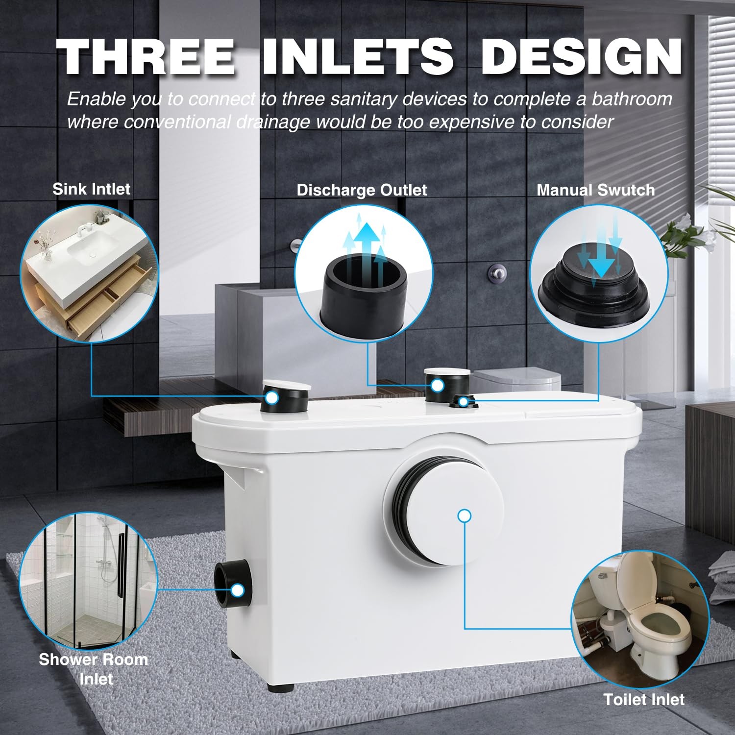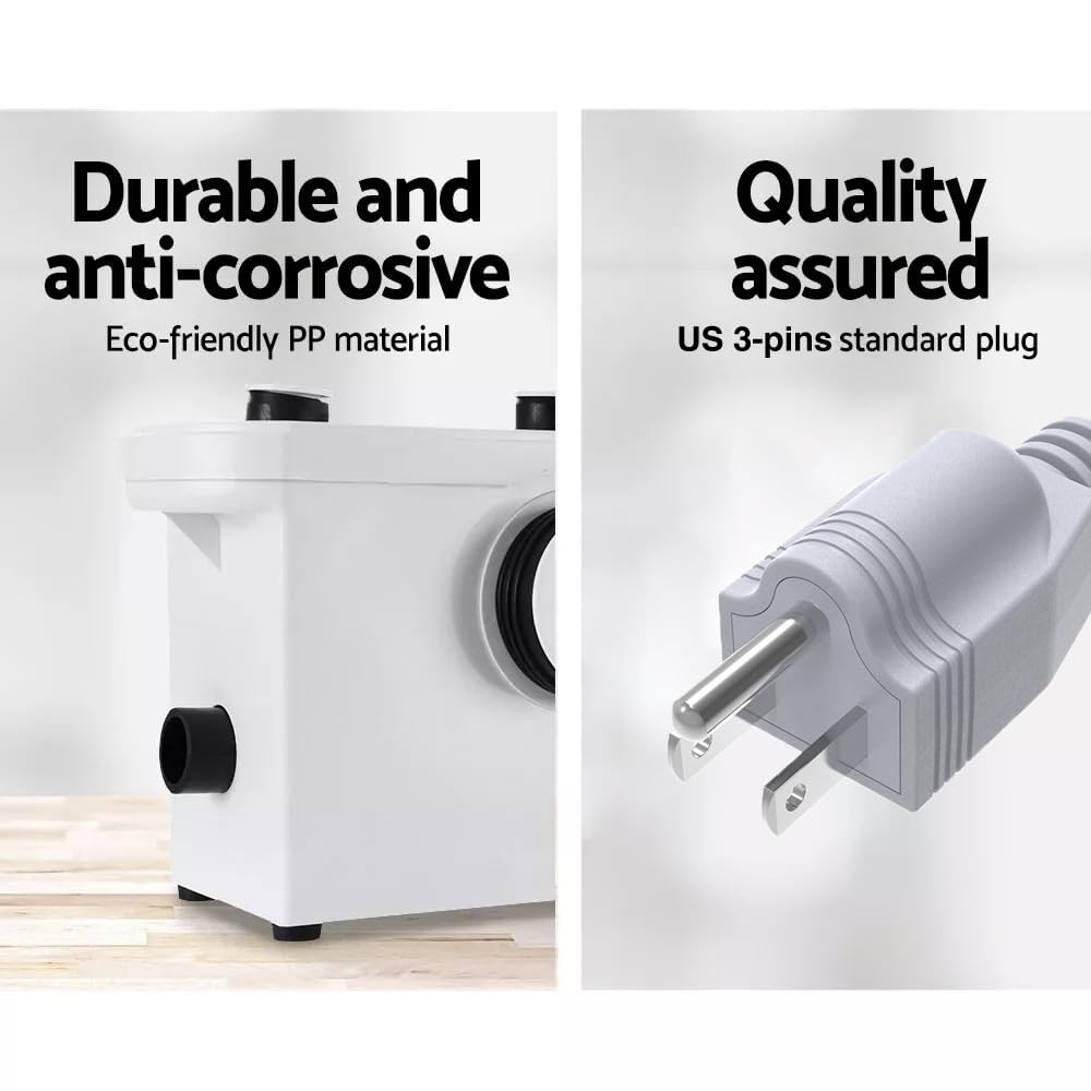 600W Macerator Pump, Macerator Sewerage Sump Pump with 3 Water Inlets for Toilet, Basement, Kitchen, Sink, Shower, Bathtub Waste Water Disposal Upflush Machine 【Efficient Drainage】--600W macerator pump moves up to 2220 gallons per hour; Equipped with solid Copper Motor Windings has max horizontal lift of 328 ft, vertical lifting up to 20 ft for quiet and quick-on-site sewage transfers. 【3 WATER INLETS】--This macerator toilet pump is equipped with 3 water inlets which providing the capabilities of attaching multiple devices, such as your sink, shower, bathtub, washing machine, bathtub, toilet and etc to complete a bathroom where conventional drainage would be too expensive to consider. 【STURDY CONSTRUCTION】--Full environmental thermoplastic construction ensure less prone to mechanical failure. The overheat protection device can be automatically disconnected to protect the device when the motor is overheated. Extremely quiet in operation with only 40DB and fully Automatic when activated by flushing. 【DRY AND WET SEPERATION】--The sewage is stored separately in the water tank, and the electronic switch is activated by the pressure of the rising water level. The motor and switch will not be submerged in water, making them less prone to damage and easier to maintain. 【Multiple Applications】--This sump pump is designed for use in kitchens, bedrooms, bathrooms, etc. It is also suitable for special venues such as basements, RVs, and boats. For any reason, you are not Satisfied - Please feel free to contact us and we will reply and solve your problems within 24hours. 【NOTE】--Do not discharge any acids, alkaloids, solvents painting, paint strippers, food waste, plastic bags, metal such as nails, hairpins, wood building materials, kitty litter or anything that could halt or damage or corrode the unit. Disregarding the above might damage the macerating unit and shall void your warranty.