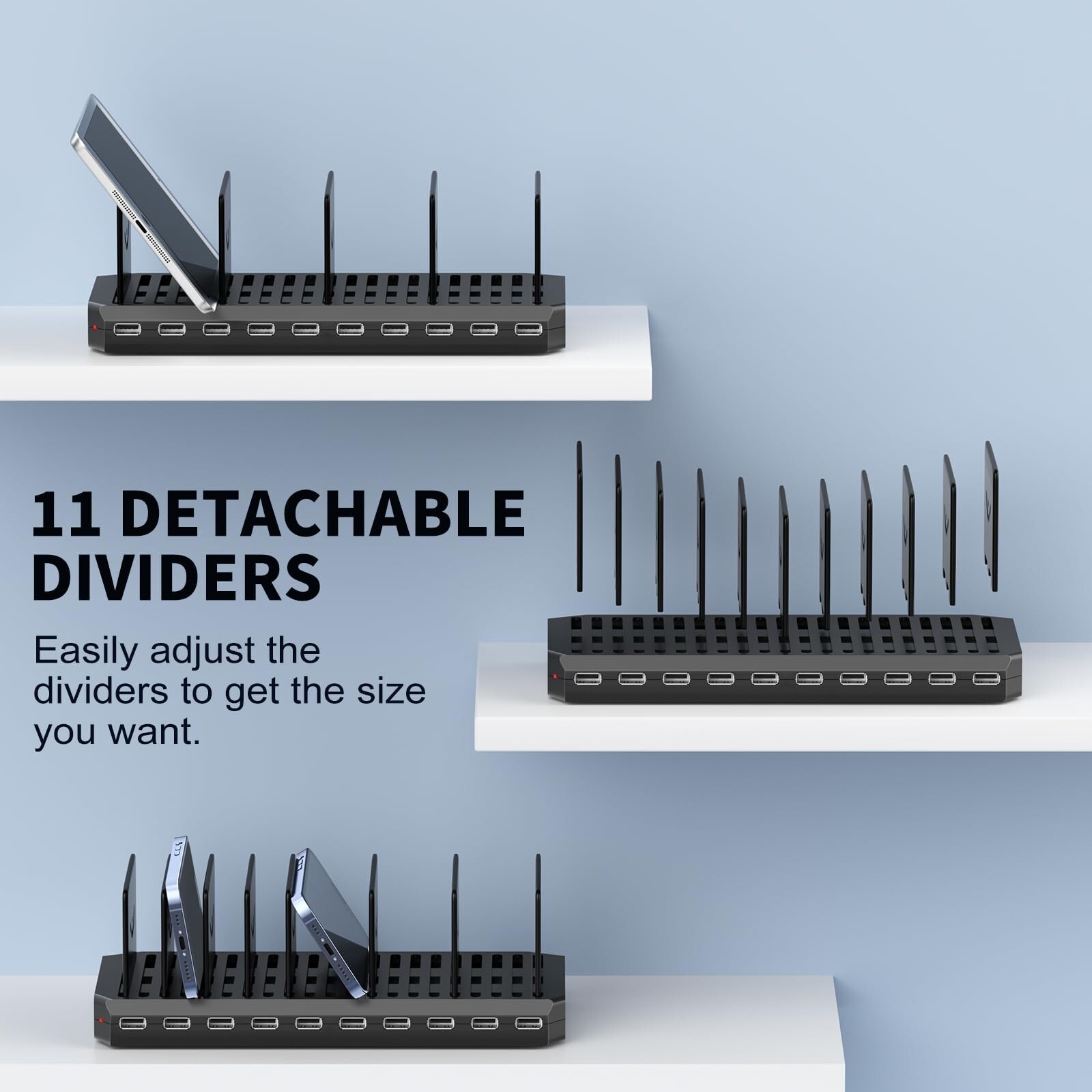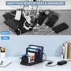 USB Charging Station for Multiple Devices, 10 Port 60W Multiple USB Charger Station with Adjustable Dividers, Fast Charging Station Hub for Hotels, Shops, Schools, Shopping Malls and Travel Product Details Brand: QIUJIN Connectivity Technology: USB Connector Type: USB Type A Compatible Devices: Smartphones, Headphones, Tablets, Cameras, Speakers Compatible Phone Models: iPhone 15 Pro Max, iPhone 15 Pro, iPhone 15, iPhone 15 Plus, iPhone 14,iPhone 13, iPhone SE, iPad Pro, iPad Air, iPad, iPad Mini, AirPods, Apple Watch, Samsung Galaxy S24 Ultra, Samsung Galaxy S24 | S24+, Samsung Galaxy Z Flip5, Samsung Galaxy A14 5G, Google Nexus, Nokia, Motorola and other Tablets, Game Consoles, Laptops, Speakers, Smart Watch Electronics See more Special Feature: Travel, Lightweight Design, Short Circuit Protection, Charging Indicator, Fast Charging Color: Black Input Voltage: 110 Volts Mounting Type: Tabletop Mount Amperage: 2.4 Amps Product Dimensions: 8.8 x 4.2 x 2.9 inches Item Weight: 1.57 pounds Item model number: ZETX10U04A Date First Available: March 1, 2024 Manufacturer: Shenzhen YingHuiYuan Electronics Co.,Ltd. Country of Origin: China 10-Port USB Charging StationOur charging station for multiple devices comes with 10 USB charging ports, each USB port provides a current of up to 5V/2.4A, and the total output power is 60W/12A. 10 port usb charging station widely compatible with Apple and Android mobile phones, iPad Air/Pro, and portable speakers. Safety in UseEach USB charging station has multiple protection systems and uses fireproof PC material. The built-in intelligent chip detects the device charging in real time, and charging will automatically stop when the device is full. Effectively prevents device overcharge, overheating, overvoltage, or short circuits, allowing users to rest assured of charging. Smart Charging IdentificationEvery charging port is equipped with an intelligent chip, which can device 10 devices, providing perfect output current, and do not interfere with each other during charging. The number of charging devices depends on the wattage of the device, and the total power cannot exceed 60W. Wide UseThe USB charging hub size is 8.8''x4.2"x2.9", lightweight design, carry out will not have a weight burden. 10 devices can be charged at once, but there will be no mess of charging cables on the desktop. It can meet multiple charging requirements, widely used in home, office, school, hotel, and other occasions. Removable DividersThe 12 dividers are designed to be removable, they are securely installed and easily separated, so that mobile phones, tablets, and other products of large sizes have a safe suitable space for charging. For the safety of the charging station and charging devices, please do not place devices larger than 11 inches (such as laptops) on the charging station. The bottom of the multiple device charging station has 6 non-slip gaskets with more stable placement. What We Offer1 Multi USB Charging Station, 1 Power Cable, 12 Removable Dividers, 1 User Guide, 7*24h superior after-sale service, and a 2-year warranty. Note: Cable is not included in the package.
