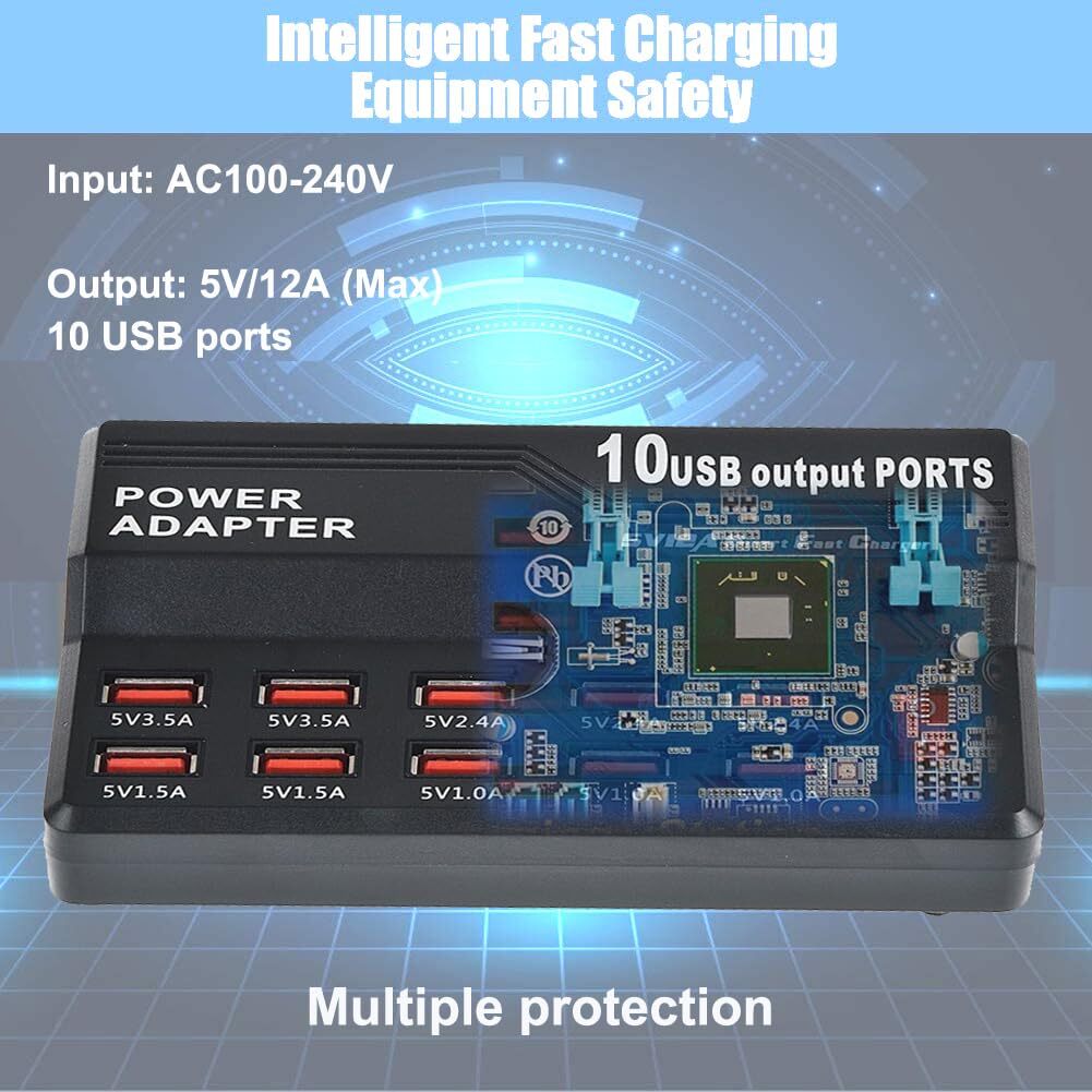 [Up to 10 Ports USB Charger]- Euipped with up to 10 Ports,the USB Charger Station supports charging multiple devices at same time. It can not only charge your family devices without having to worry about looking for available outlets, but also make your traveling easier and more convenient than ever before. [100% Safe Charging]- The usb charging station equipped with intelligent chip was built in to protect from over voltage, over current and overload. Reasonable cooling holes which can effective heat dissipation to prevent from over-temperature. Overcharge protection,when these devices fully charged, automatically converts to a small current charge,after reaching 100% charge, the current output is 0. [Compact Size & Superior Performance]- Small size save more space for you, make it easily take with whenever and wherever you go.The charging station is housed in a fire- resistant PC material+ABS, ensure the USB Charger durable and stable. [Concerned with Charging Efficiency]- The multiple usb charger supports regular charging, and device input voltage should be 5V, enabling simultaneous multi-device charging. [Wide Range of Applications]- Charge more than your smartphone or tablet with this multi-port adapter. Charge your e-reader, tablet,Bluetooth headphones, portable speakers and any other devices with a USB cord.