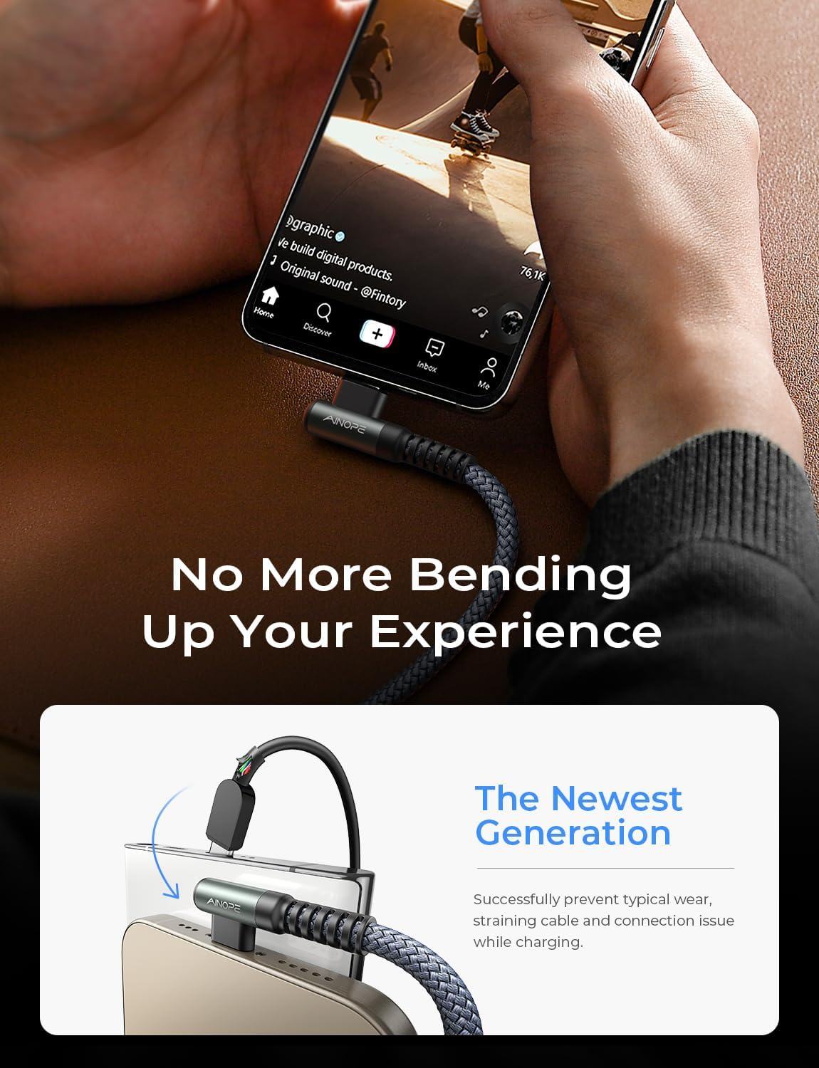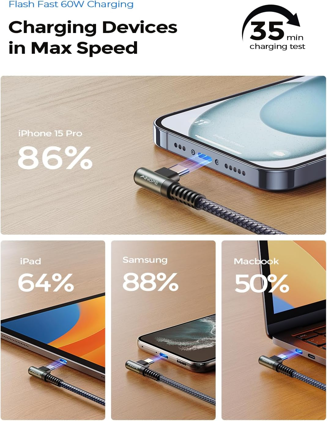 [Upgraded Exclusive Right Angle Design] This USB C to USB C cable with an innovative 90 degrees " L " design. It can effectively avoid the bending of the cord end and extend the life of the charging cable. Its user-friendly design more convenient and comfortable for playing games, watching videos, reading e-books when you charging. [60W 3.1A FAST CHARGING]: This type c to type c fast charging cable supports PD 3.0 and QC 3.0 fast charging, up to 20V/3.1A(max) with USB-C Power Delivery adapters such as 18W/30W/45W/60W. Fast charging gives you a quick and convenient way to recharge your devices up to 80 percent in 30 minutes, and data transfer speeds up to 480Mbps (1200 songs synced per minute) [AMAZING DURABILITY]: Reinforced 90 degree USB C cable with special SR joint, Lasts 30x longer than ordinary cables-proven in a laboratory environment to withstand 40000 bends. It built-in laser welding technology, which ensure the metal part won't break. One of the toughest cables ever created, with tensile strength capable of withstanding 175 lbs [PERFECT COMPATIBILITY]: This is the USB c to c cable not the USB-C to USB-A cable, Compatible with virtually all USB-C devices including phones, tablets, and laptops. Such as Samsung Galaxy S21+/S21/S20/ S20+/ S20 Ultra/ Note 10, MacBook Air/Pro 13'', iPad Pro 2021/2020/2018, iPad Air 2020 and more 💎[What you get]: We provide this USB C to USB C Cable 2 PACK with an 18-Month worry-free period and 24/7 customer service, if you have any questions, we will resolve your issue within 24 hours Product Description 90° Degree Ergonomic Design Enjoy easier and comfortable user experience while charging. Its ergonomic design that successfully prevent typical wear, straining cable and connection issues and increase the life of the charging cable. Enjoy fast charging and convenience experience while charging even used in any cramped corner. The video showcases the product in use. The video guides you through product setup. The video compares multiple products. The video shows the product being unpacked. video Merchant Video One Of The Most Durability Cable Excellent material and charging life that you can always rely on. Premium nylon material, laser welding tech and reinforced joint enable hassle-free charging. What's more, this usb c to usb c cable passes short-circuit test, temp test and load bearing 16kg test so you can rest easy while charging your devices. The video showcases the product in use. The video guides you through product setup. The video compares multiple products. The video shows the product being unpacked. video Merchant Video Pure Pro Power Ultra long lasting Nylon Material Military Nylon+Extra Armour Line Bring 10X Build To Last The video showcases the product in use. The video guides you through product setup. The video compares multiple products. The video shows the product being unpacked. video Merchant Video ROBUST CONNECTOR 50000+ Plug Test UV Adhesive Spraying+Laser Welding Tech+Load-bearing 16KG The video showcases the product in use. The video guides you through product setup. The video compares multiple products. The video shows the product being unpacked. video Merchant Video 400,000+Bending Test Reinforced SR joint and laser welding technology Upgraded ultra-stable SR Joint have been improved so they won't break and are safer and more durable The video showcases the product in use. The video guides you through product setup. The video compares multiple products. The video shows the product being unpacked. video Merchant Video 1 Up Your Experience 2 Watching Video 3 Corner Available 4 Playing Game 5 Laptop Working 1 iPhone 16 & 15 Series 2 Samsung 3 iPad 4 Macbook 5 Switch Fast Charging & Data-Sync The data transfer speed of this USB C Cable is up to 480Mbps between two devices, which means download 100 songs every 5 seconds. Important Note Before Purchase This is Type-C to Type-C cable. Not USB-A or Lighting connector. It can compatible almost USB-C devices Useful Buckles for Storage With the sticky buckles for organization, you can shorten the cable to any length you want and even organize it to a portable size. Top Professional Team Support We also provide worriless and 24hrs/7day consultation, if you have any questions, we will resolve your issue any time.