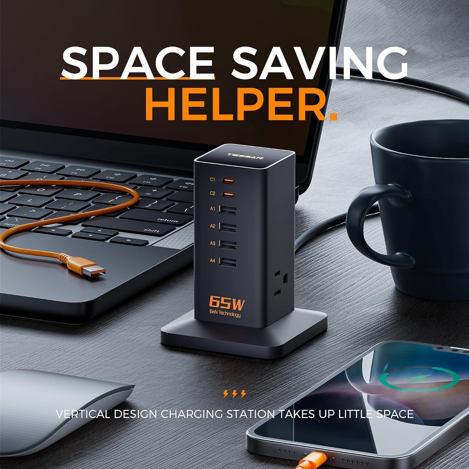 Desk Charging Station for Multiple Devices 65W, 6 Port GaN USB Fast Charger Tower with 3 Outlets, Type C Desktop Charger Hub for Cell Tablet Ear, Home Office Travel Accessories Space Saving Helper: Vertical design charging station takes up little space on your desk and provide 9 charging port for your devices, creating a neat and tidy desk space for home and office Smaller Size: Palm size design charging station smaller than a cell, makes it easier fit in handbag, backpack; A good companion for your travel, cruise ship and business trip GaN Ttechnology: Built-in GaN chip, charging 4 times faster than ordinary plug, featuring dynamic temperature sensors allows your mobile to charge for 10 hours without getting hot, reducing your devices loss 65W USB C Fast Charger: With GaN chip combined, the USB C port provide optimal charging speed for your devices, charge your from 0% to 80% in 30mins, increase your efficiency and save your time One for All: This tower power strip rated 1250W, could turn 1 socket into 6 USB ports and 3 outlets, meet your various charging needs for cell, laptop, tablet, ear, smart watch, computer, etc